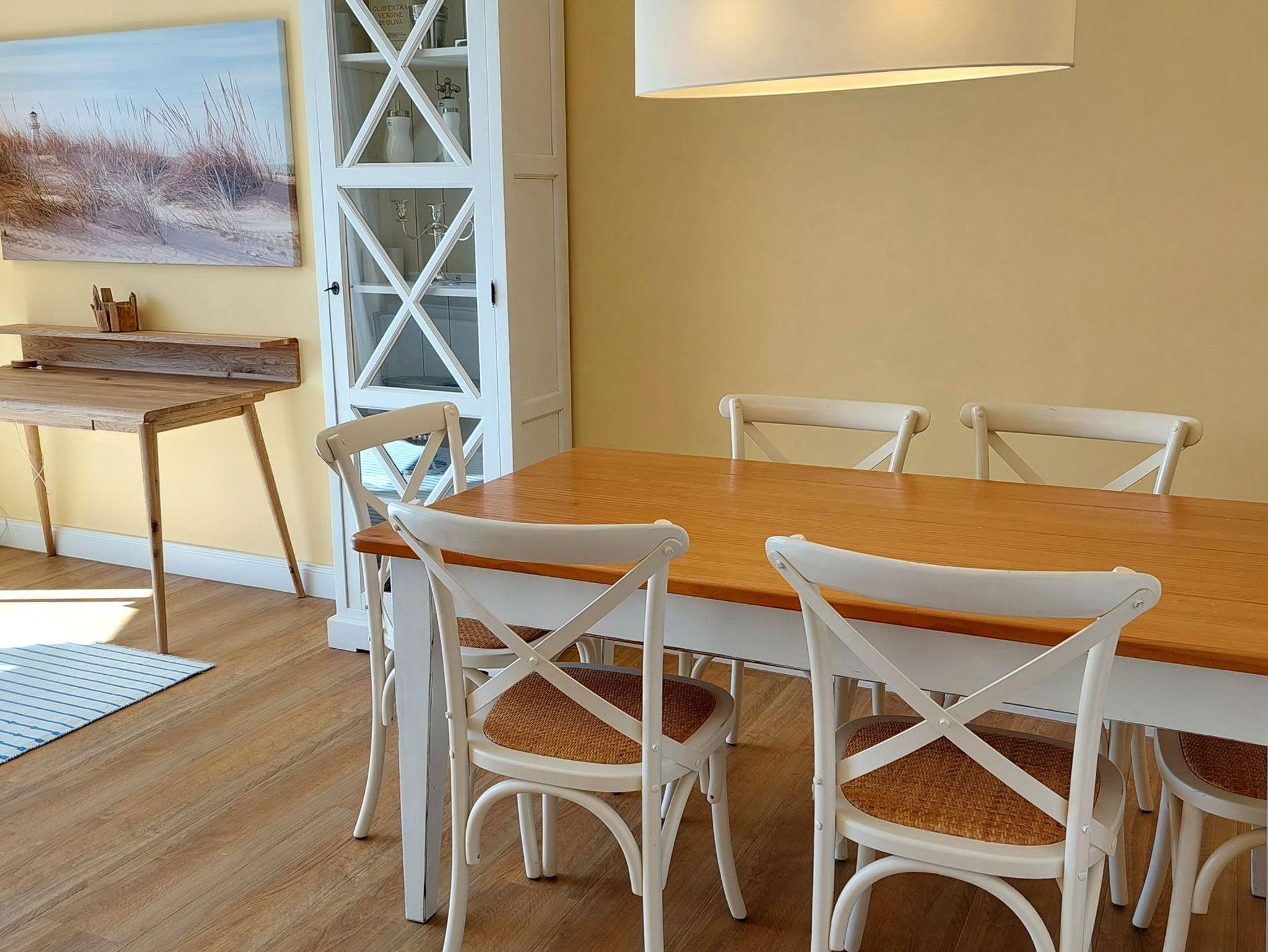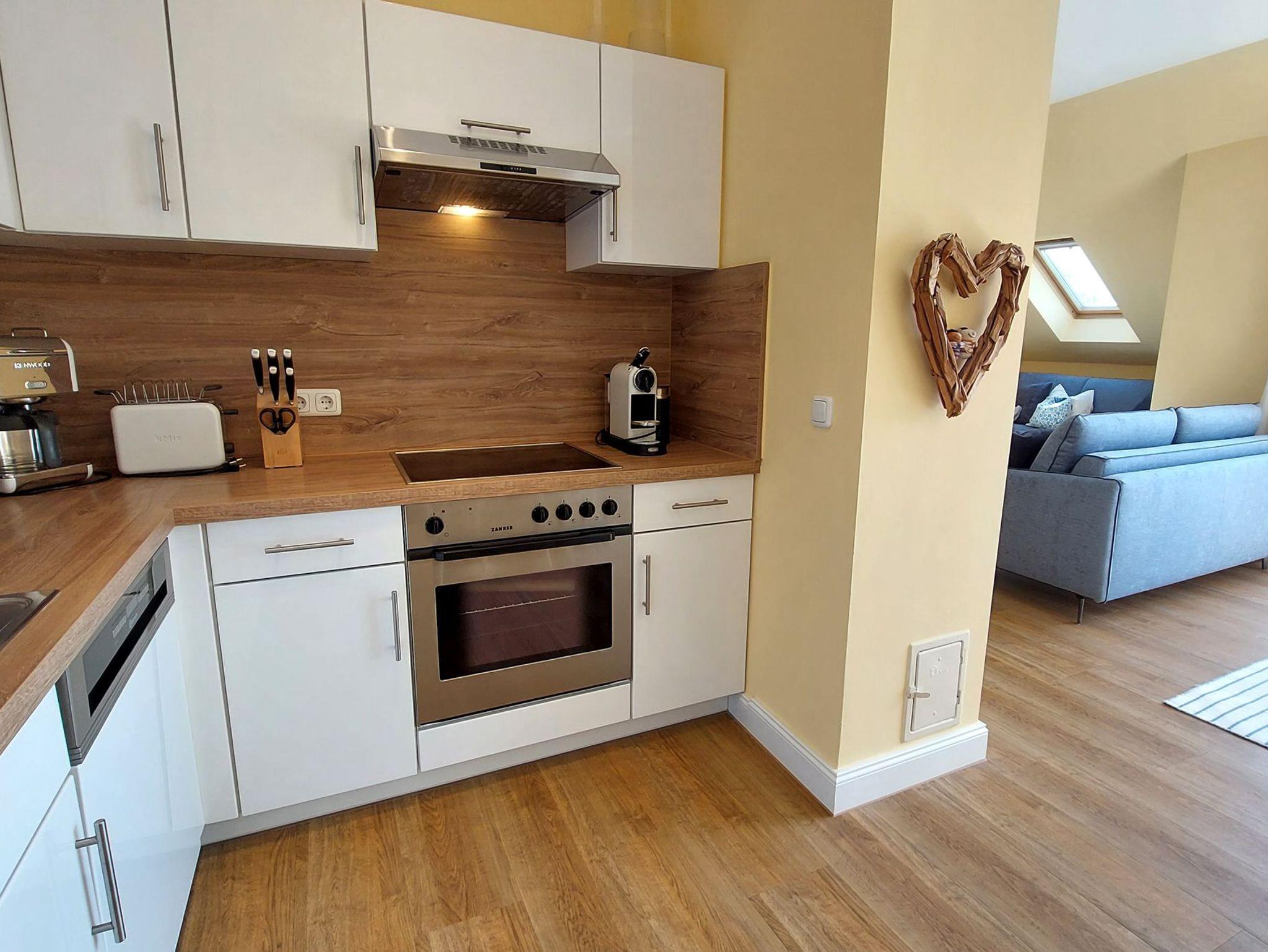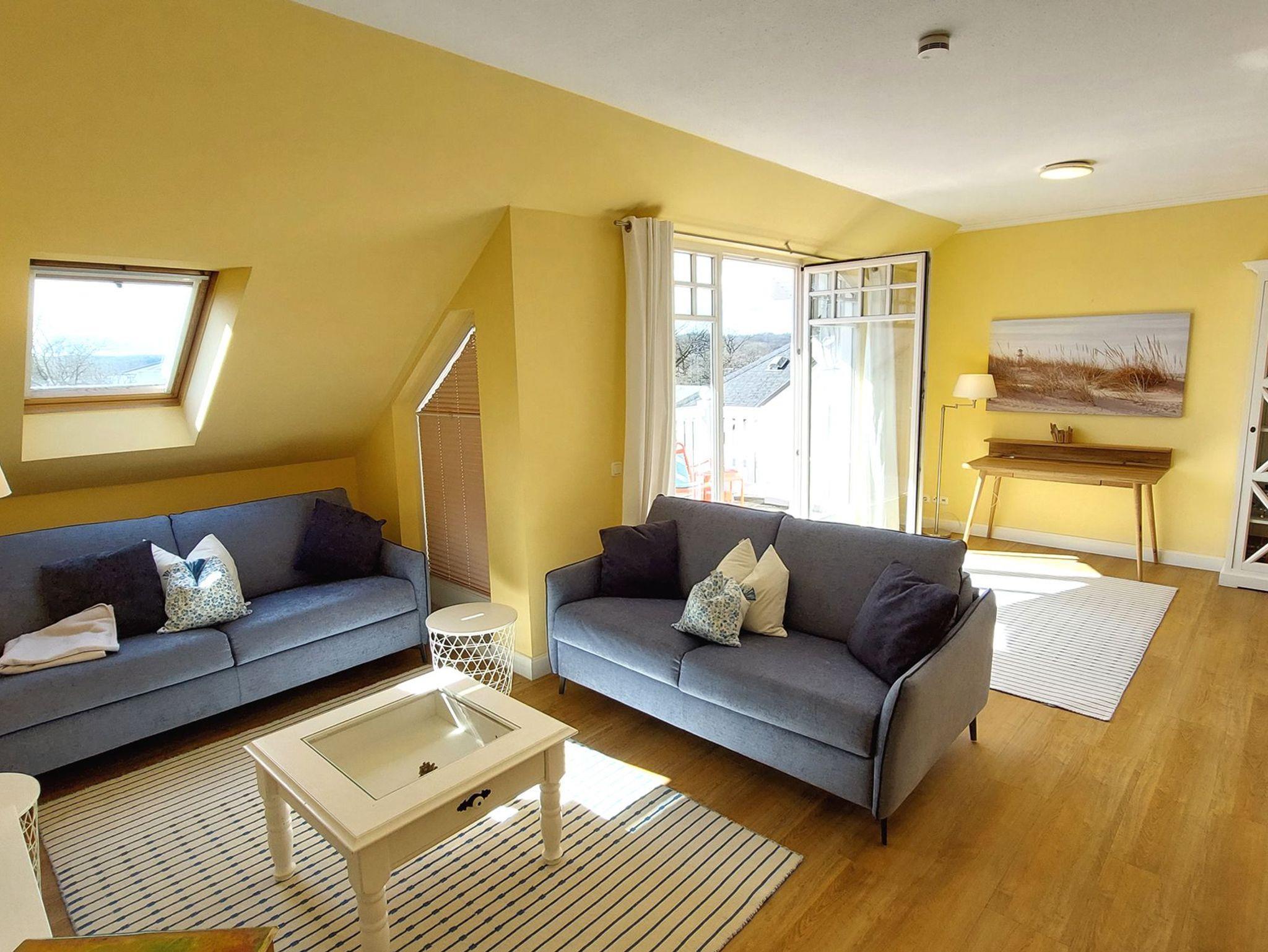 Im Wohnraum können auf dem großen Schlafsofa zwei weitere Personen schlafen. Die gesamte Wohnung ist mit hochwertigen Möbeln aus weiß gebürsteter Pinie im Villagestil eingerichtet. Im Wohnraum befindet sich ein Smart-TV und Radio/CD-Spieler, Sitz- und Essplatz sowie die halboffene Küche mit Geschirrspülmaschine, Backofen, Herd, Kühlschrank und diversen Kleingeräten.