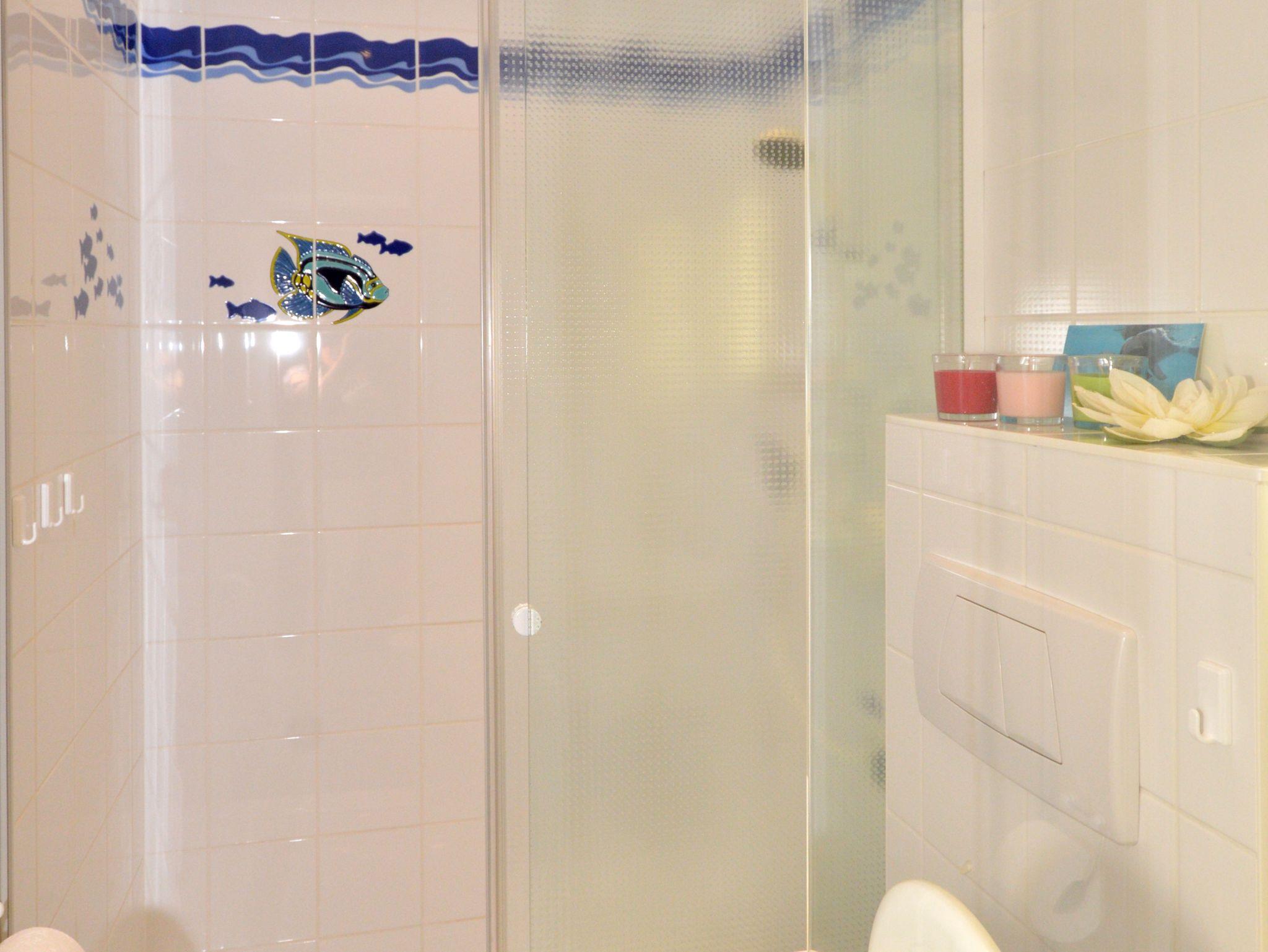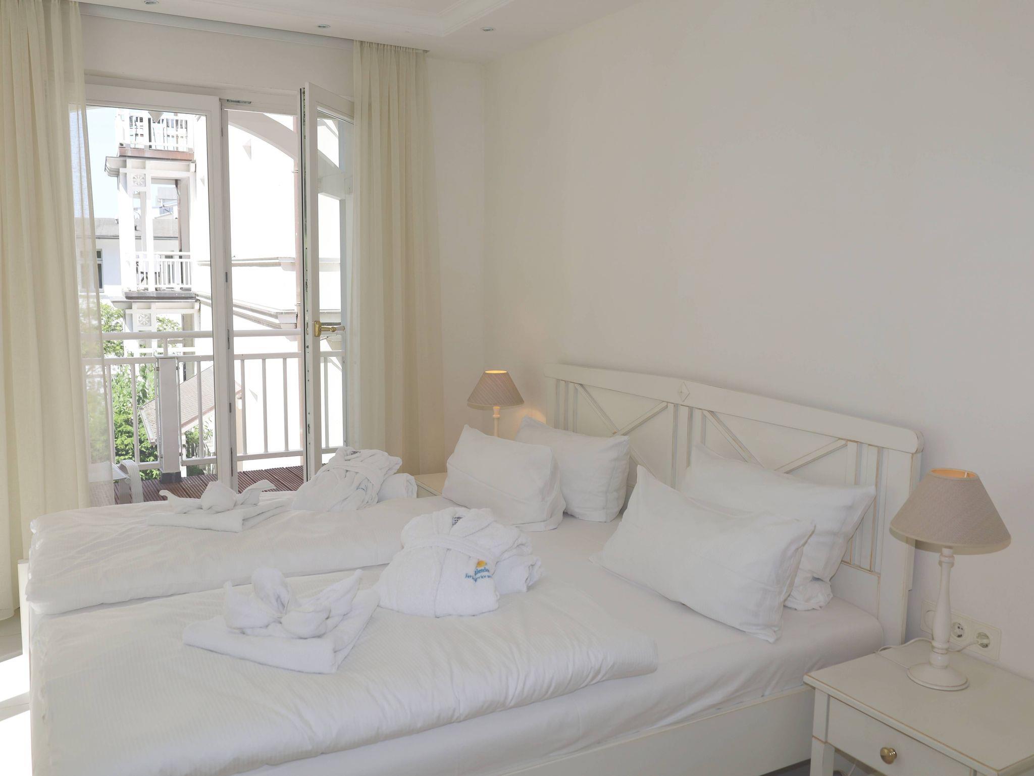 Das 3-Raum-Apartment befindet sich im 1. Obergeschoss und ist für bis zu 4 Personen geeignet. Das Apartment verfügt über einen Balkon mit frontalem Meerblick und einen Balkon mit seitlichen Meerblick.