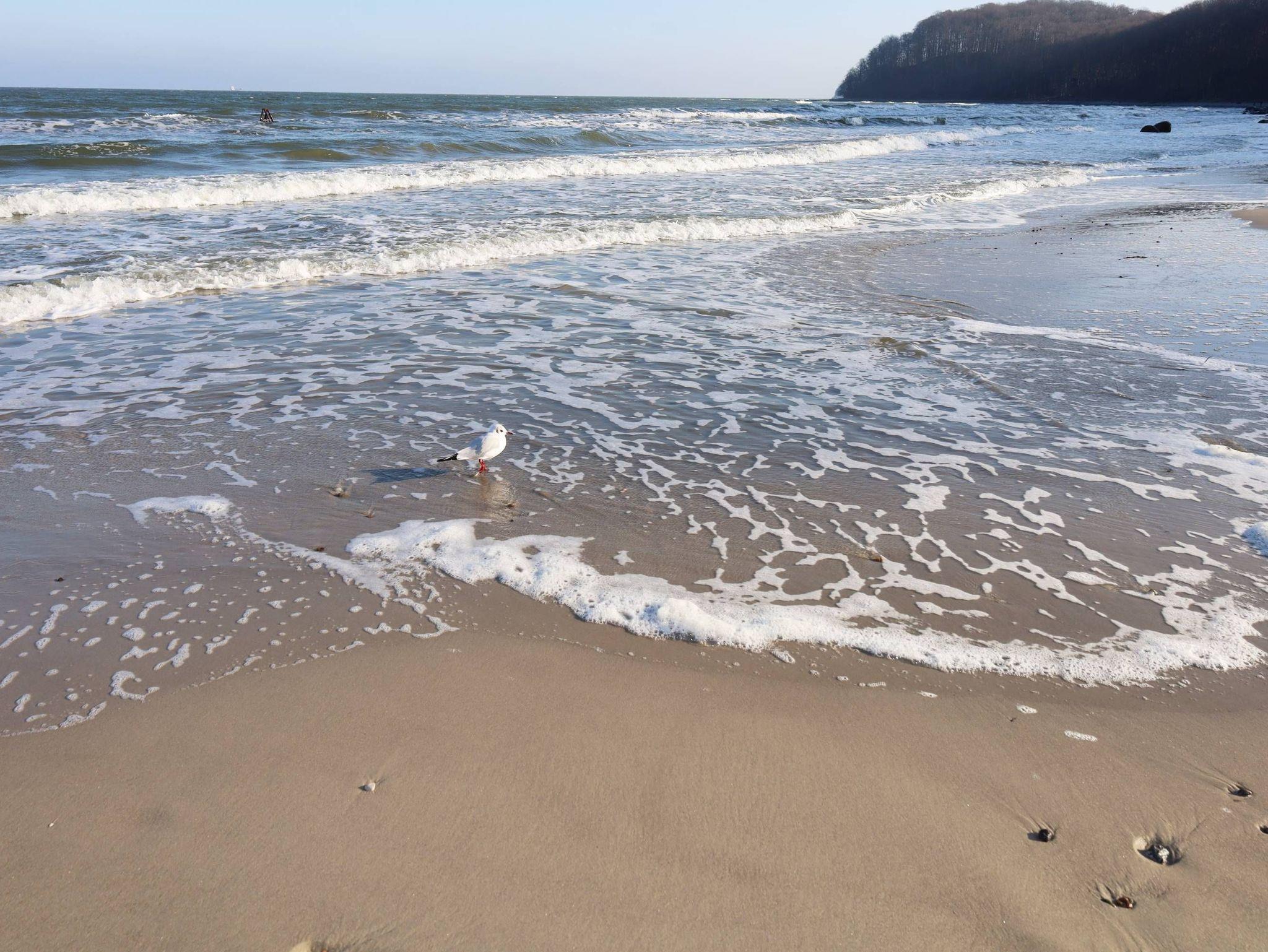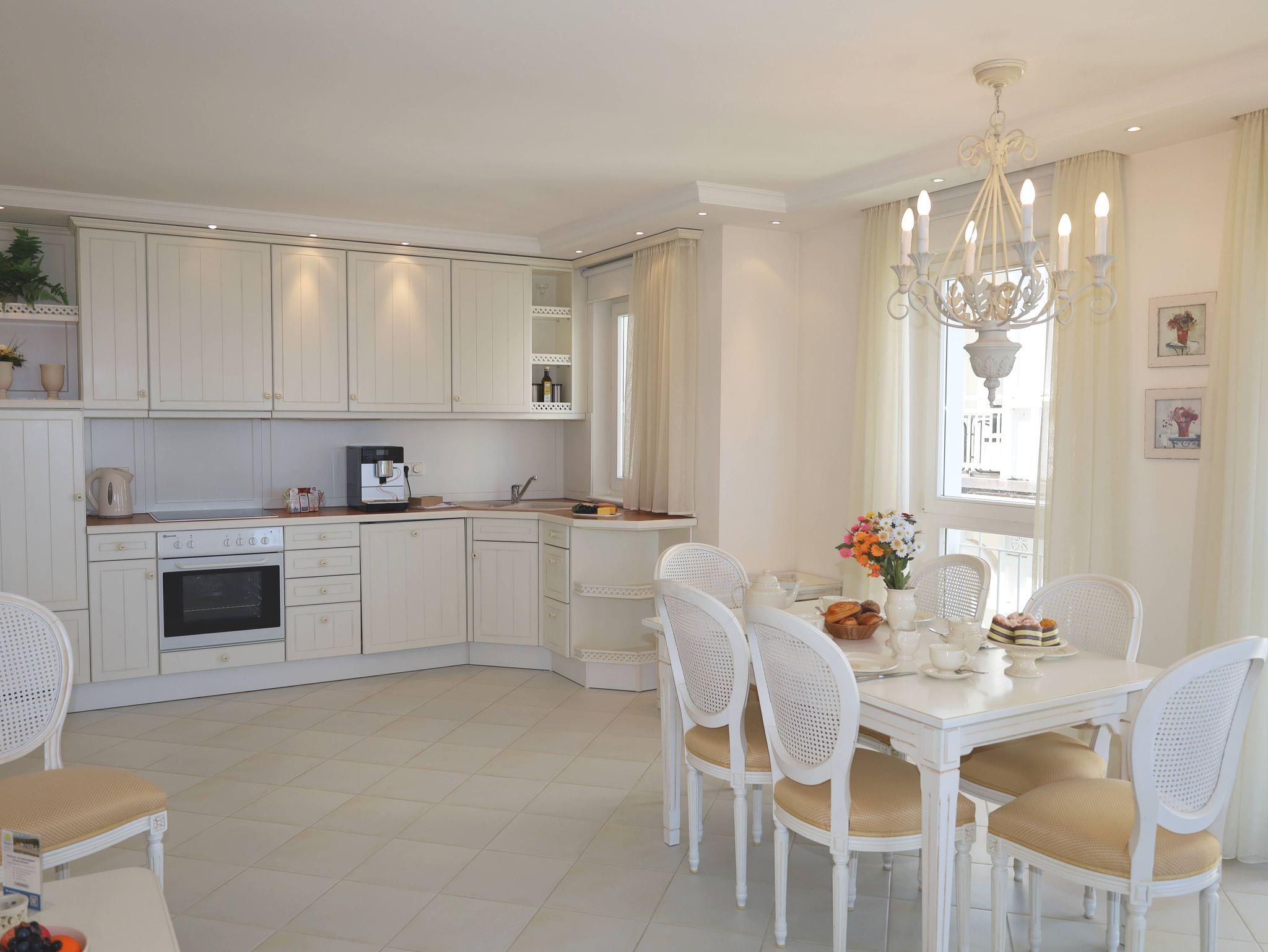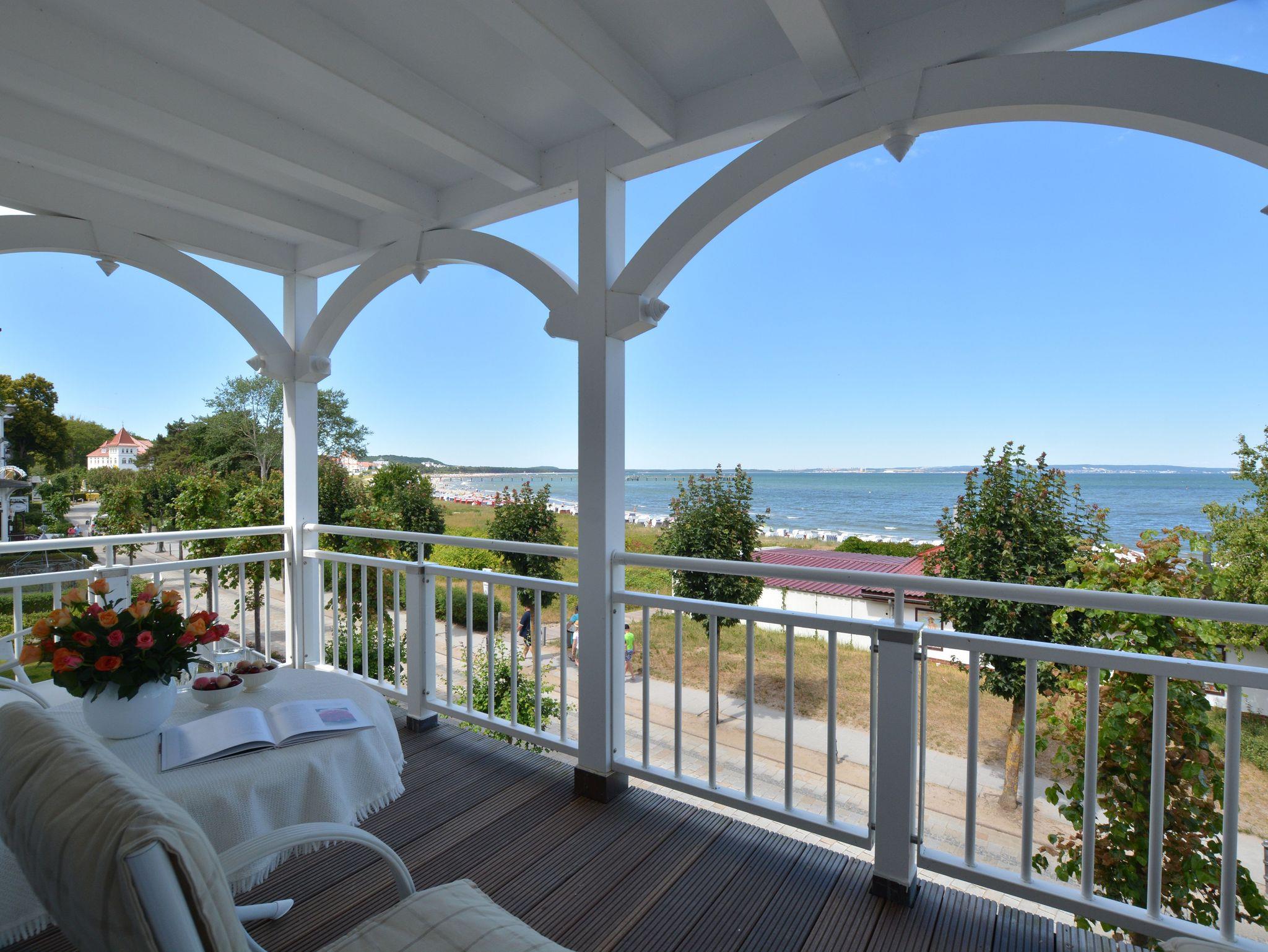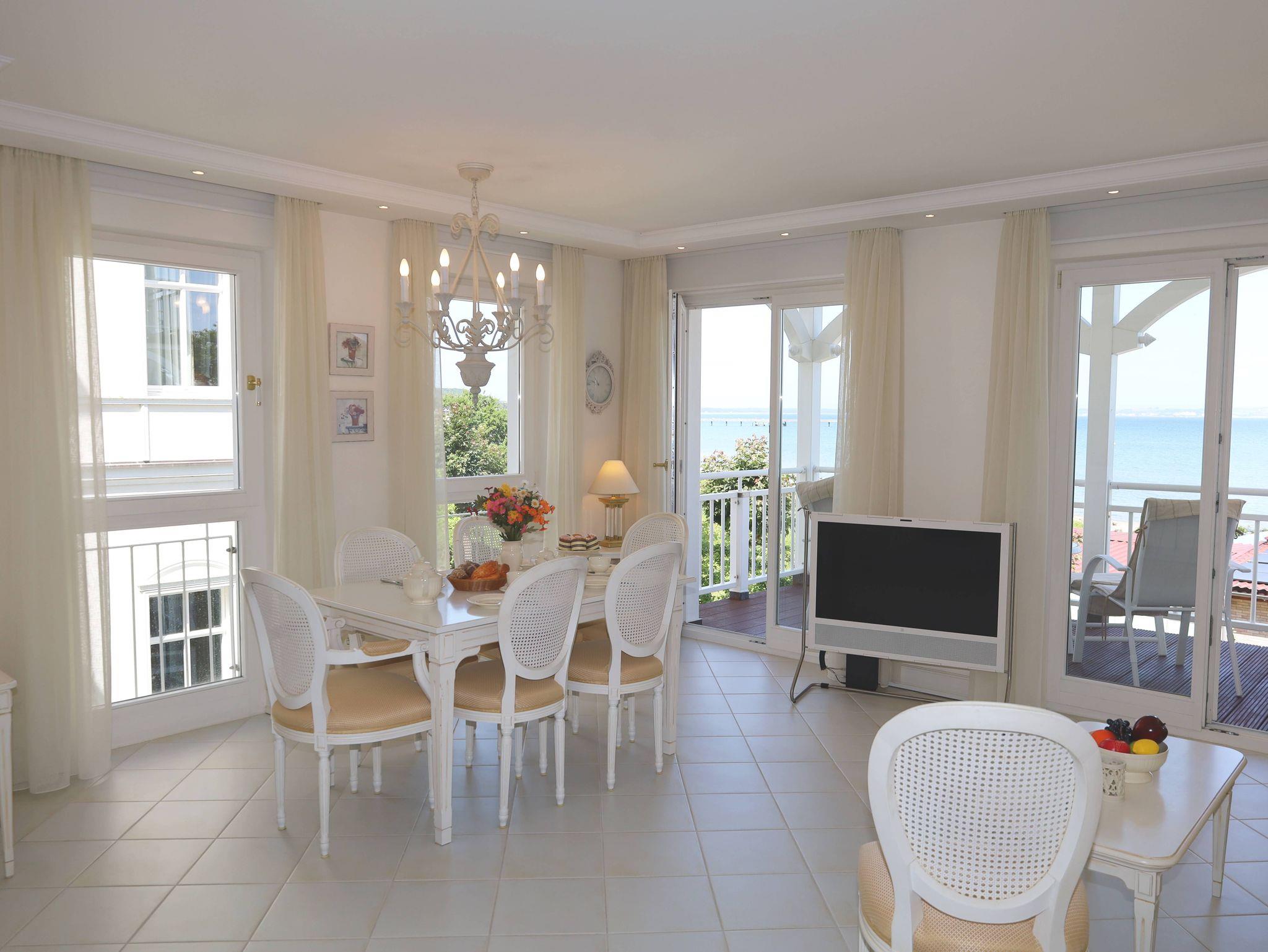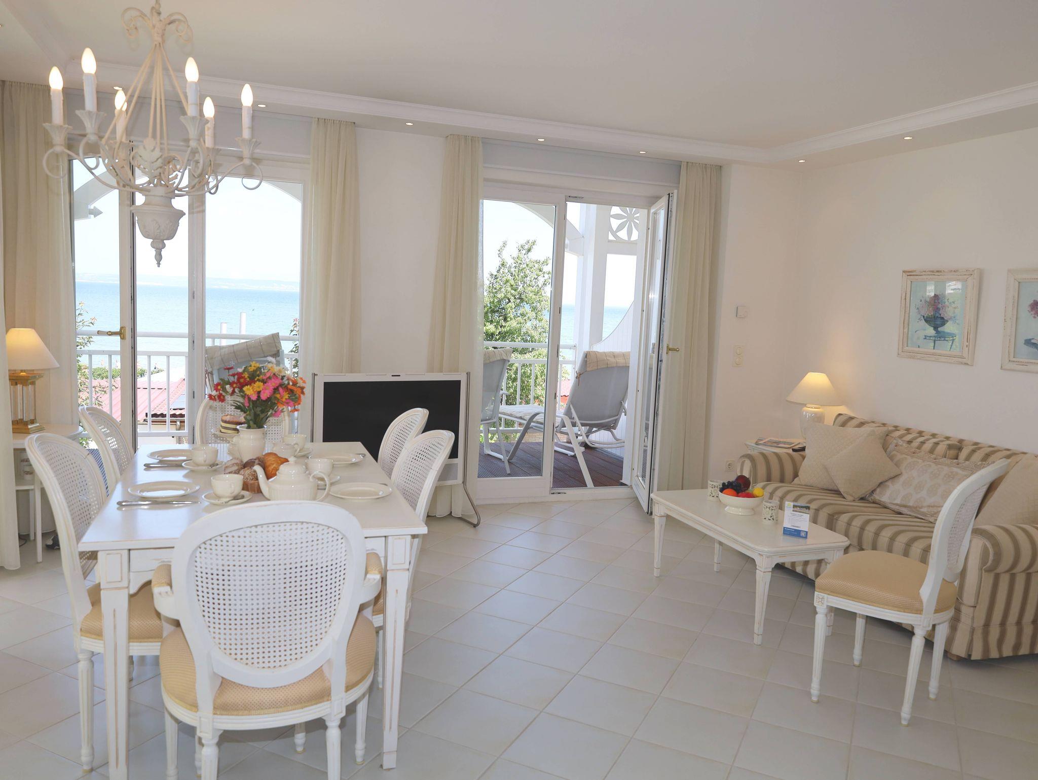Der helle, großzügige Wohnbereich mit offener Küche öffnet sich zu einem großen Balkon mit traumhaftem Blick auf die Ostsee ? von der Seebrücke bis zu den Kreidefelsen. Bodentiefe Fenster sorgen für lichtdurchflutete Räume, die individuell designte schwedische Landhausküche und die hochwertige Couch schaffen eine besondere Wohlfühlatmosphäre. Zur Ausstattung gehören ein Flachbild-TV, ein Samsung Blu-ray-Player, ein CD-Player sowie ein BOSE-Soundsystem. Die Küche ist komplett ausgestattet mit Geschirrspüler, Ceran-Back-Herd und praktischen Extras wie Kaffeemaschine, Toaster und Wasserkocher.