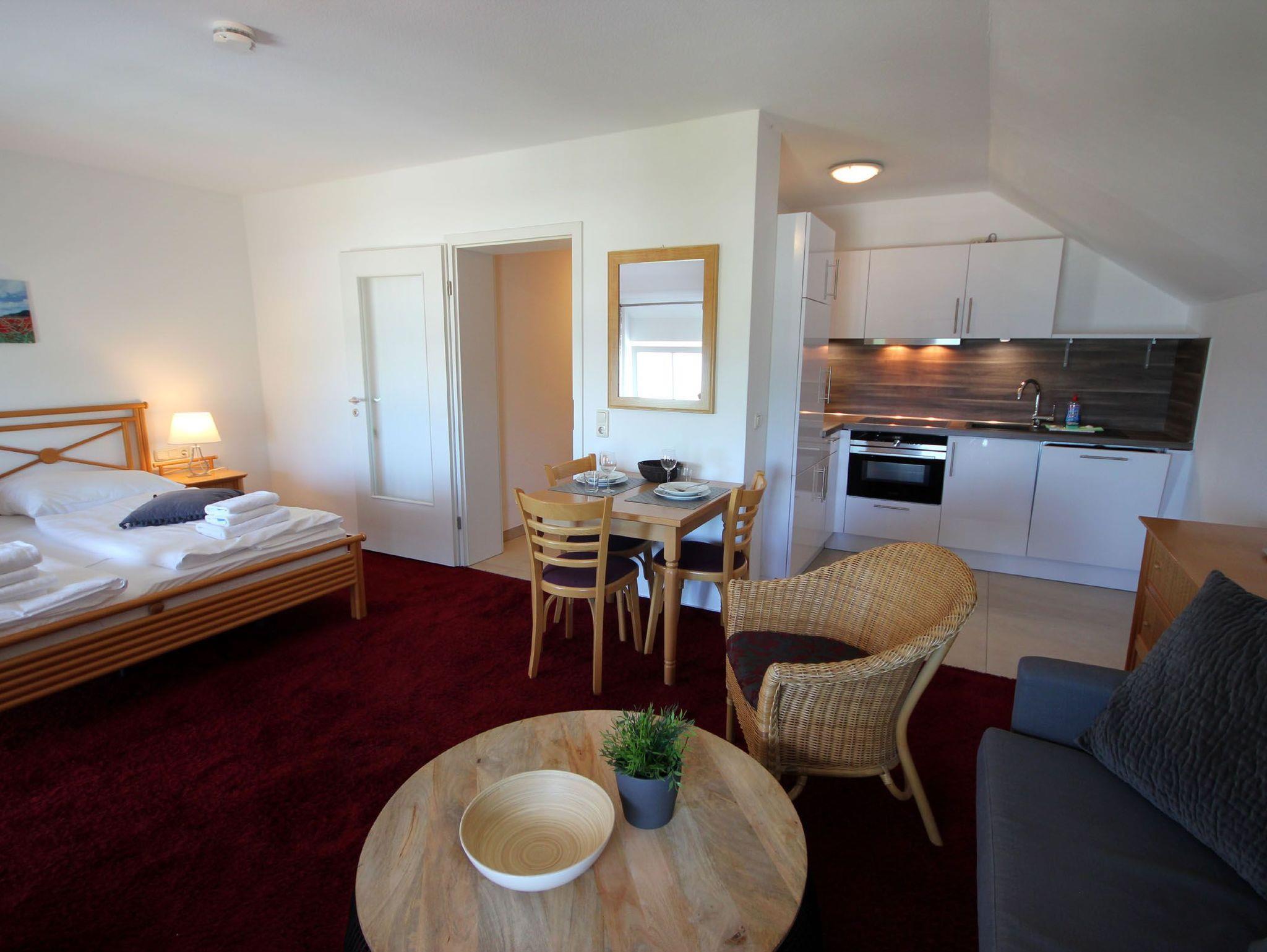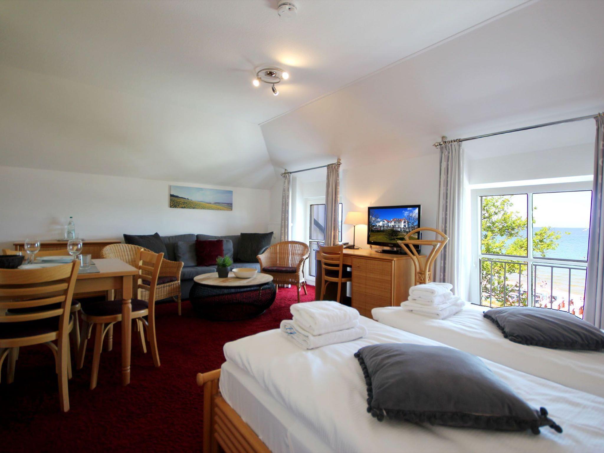 Ihre 1-Zimmer Ferienwohnung 225RB20 befindet sich im 2. Obergeschoss, ist ca. 45 qm groß und für bis zu 4 Personen gut geeignet. Neben dem kombinierten Wohn- und Schlafraum mit Doppelbett sowie Schlafsofa, auf dem die 3. und 4. Person gut schlafen können, gehört ein Essbereich, Flachbild TV sowie WLAN zur Nichtraucherwohnung. Ebenfalls können Sie eine voll ausgestattete integrierte Küchenzeile mit Geschirrspüler, Nespresso-Maschine, Backofen, Mikrowelle, Wasserkocher, Toaster und Kaffeemaschine nutzen. Das Badezimmer erwartet Sie mit Waschtisch, WC und Dusche. Vom Wohn- und Schlafbereich genießen Sie den Blick auf die Strandpromenade sowie auf die Binzer Bucht. Haustiere sind herzlich willkommen.