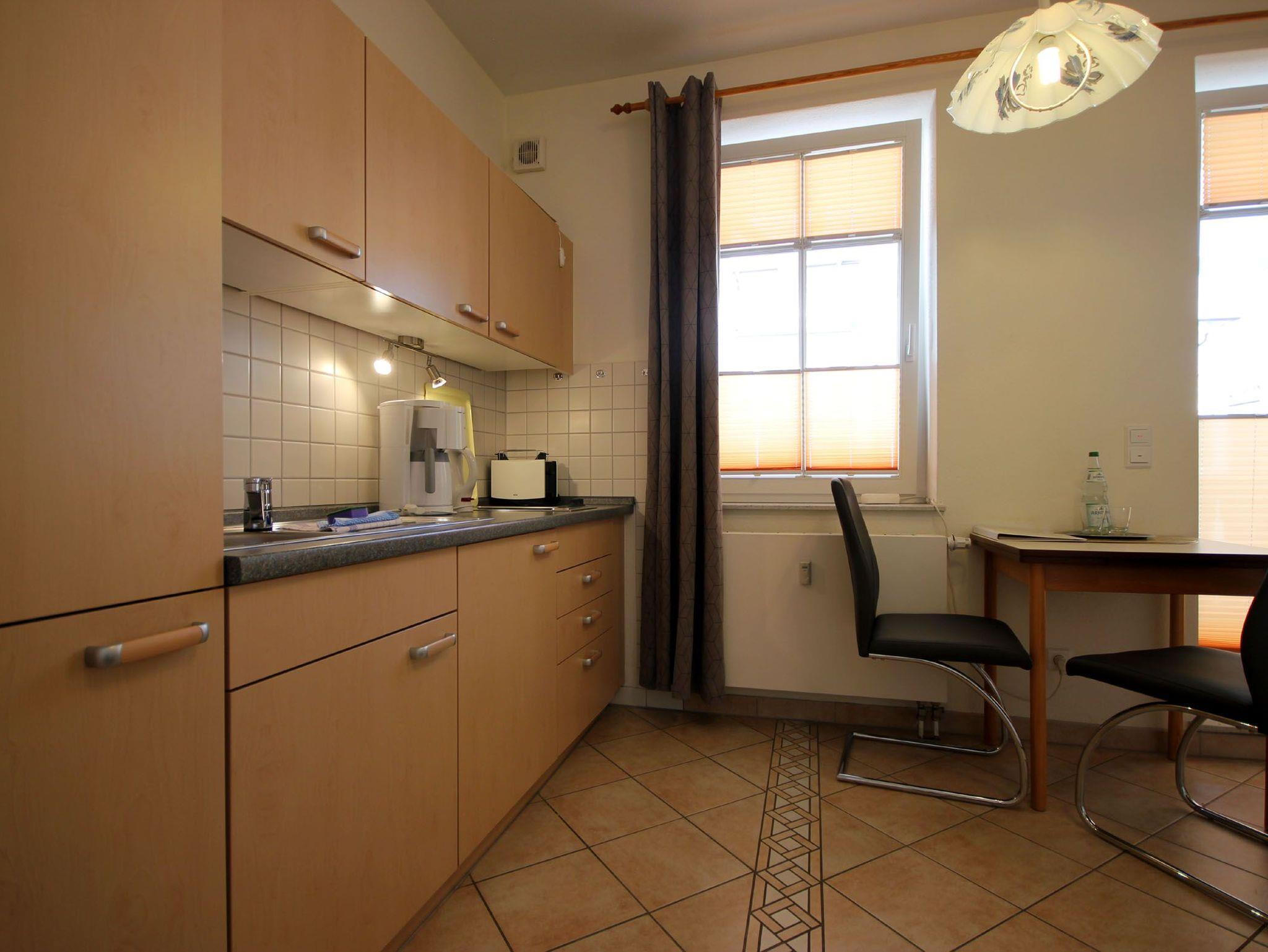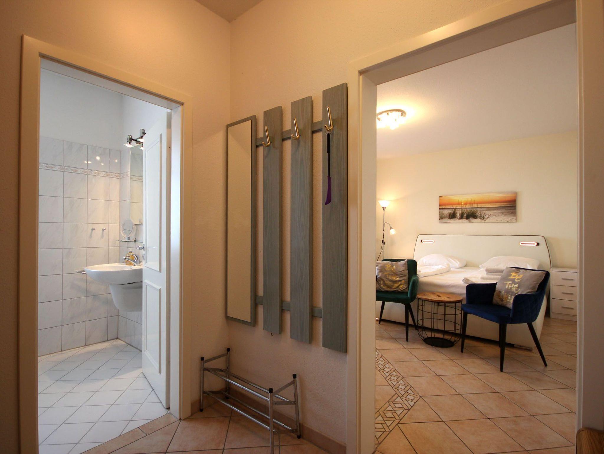 Ihre Ferienwohnung 1RB5 liegt im 1. Obergeschoss der Villa und hat einen schönen Balkon. Mit einer Größe von 35 qm ist die Wohnung ideal für zwei Personen geeignet. Das Appartement hat neben dem Wohn-/Schlafraum mit integrierter Kochzeile, einen separaten Vorraum und ein Badezimmer mit Waschtisch, Dusche und WC. Im Wohn-/Schlafraum finden Sie ein bequemes Doppelbett, eine Sitzecke, Flachbild-TV, Radio sowie einen separaten Essplatz. Die Kochzeile ist mit Kühlschrank, 2-Plattenherd, Kaffeemaschine, Toaster, Wasserkocher und anderen Küchenhelfern komplett ausgestattet.