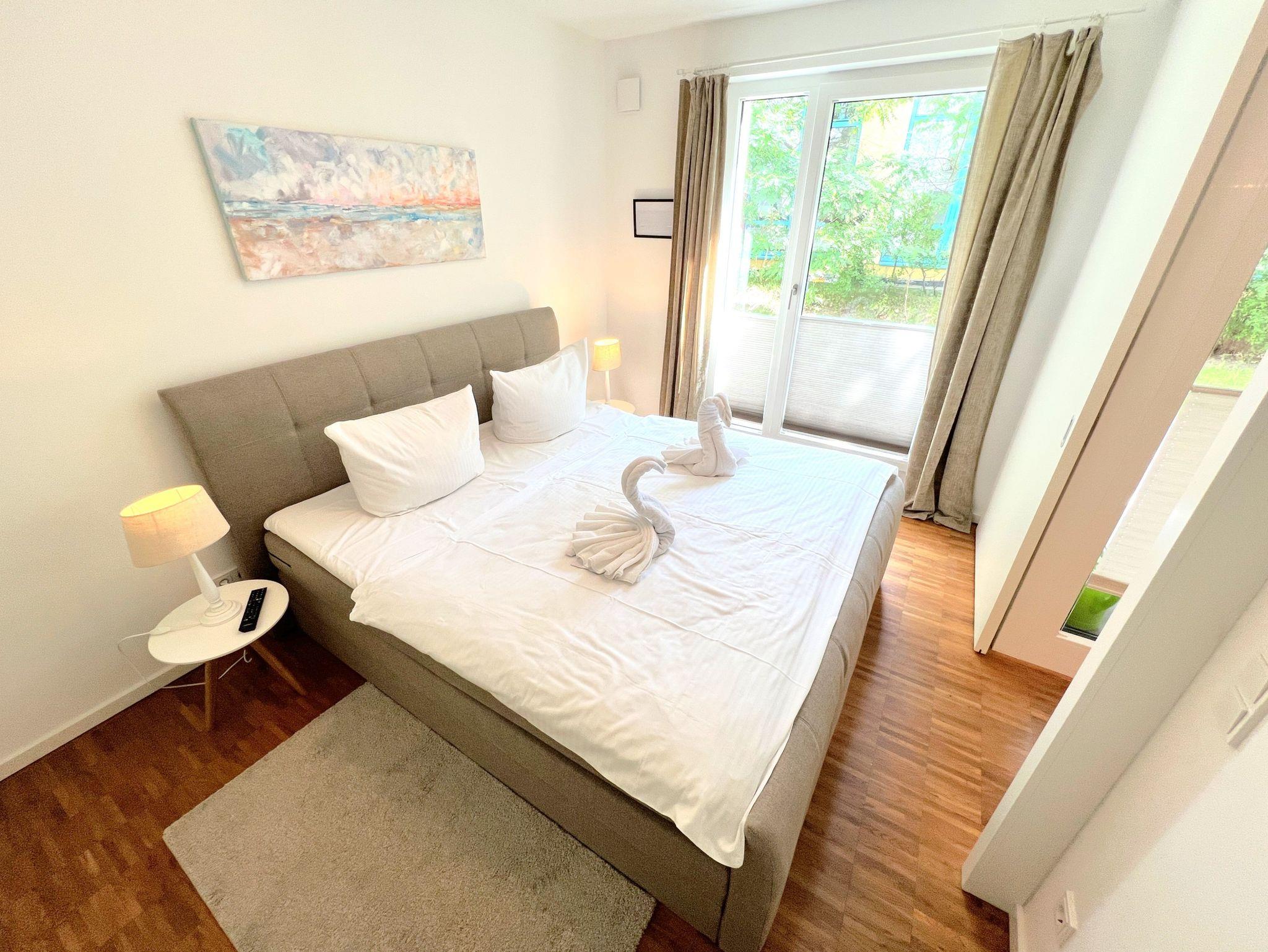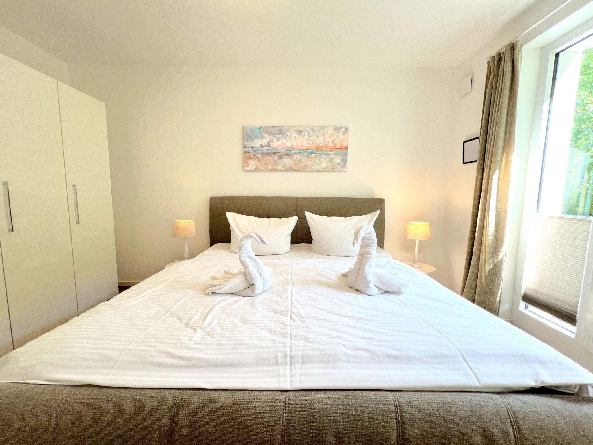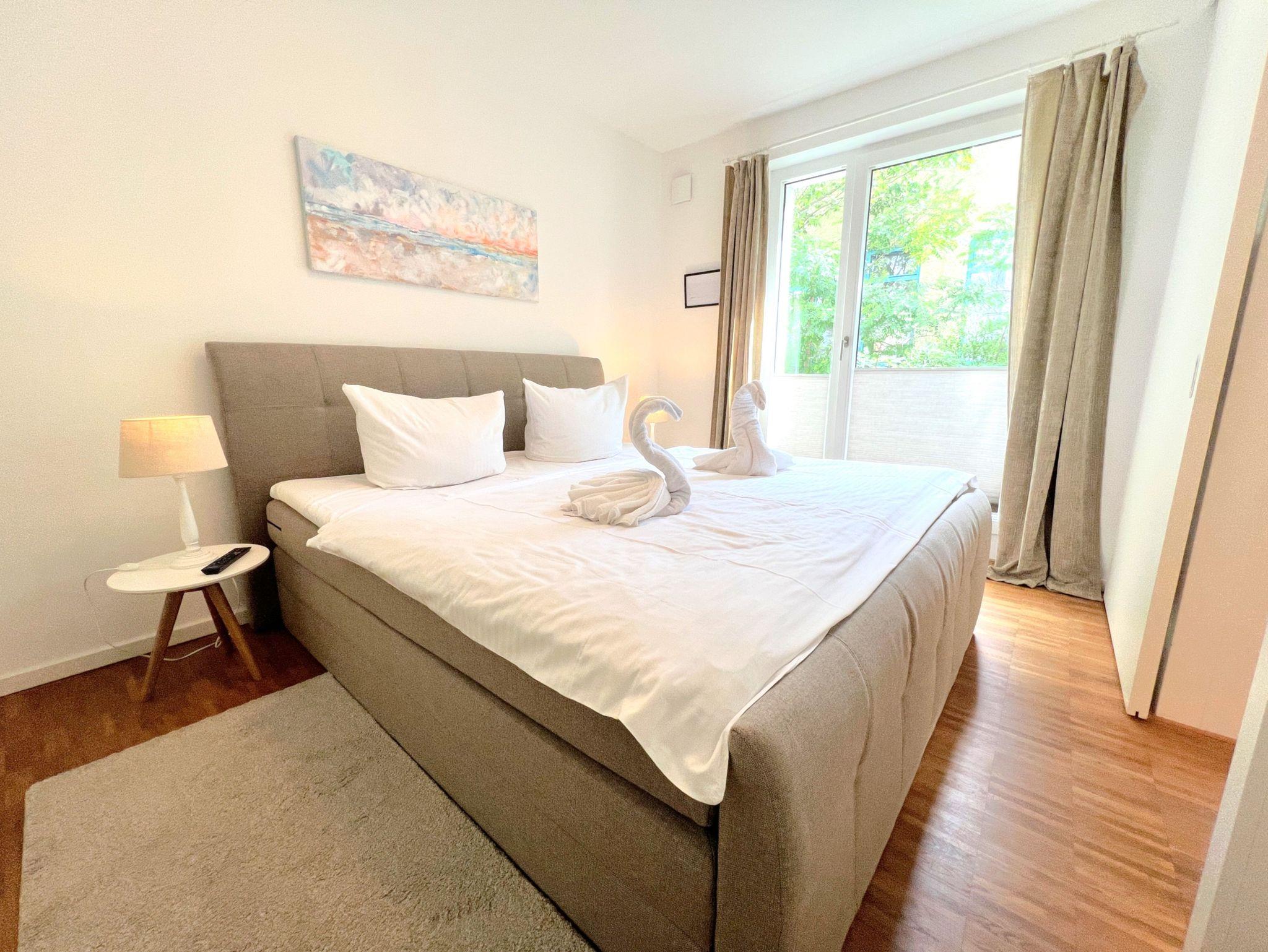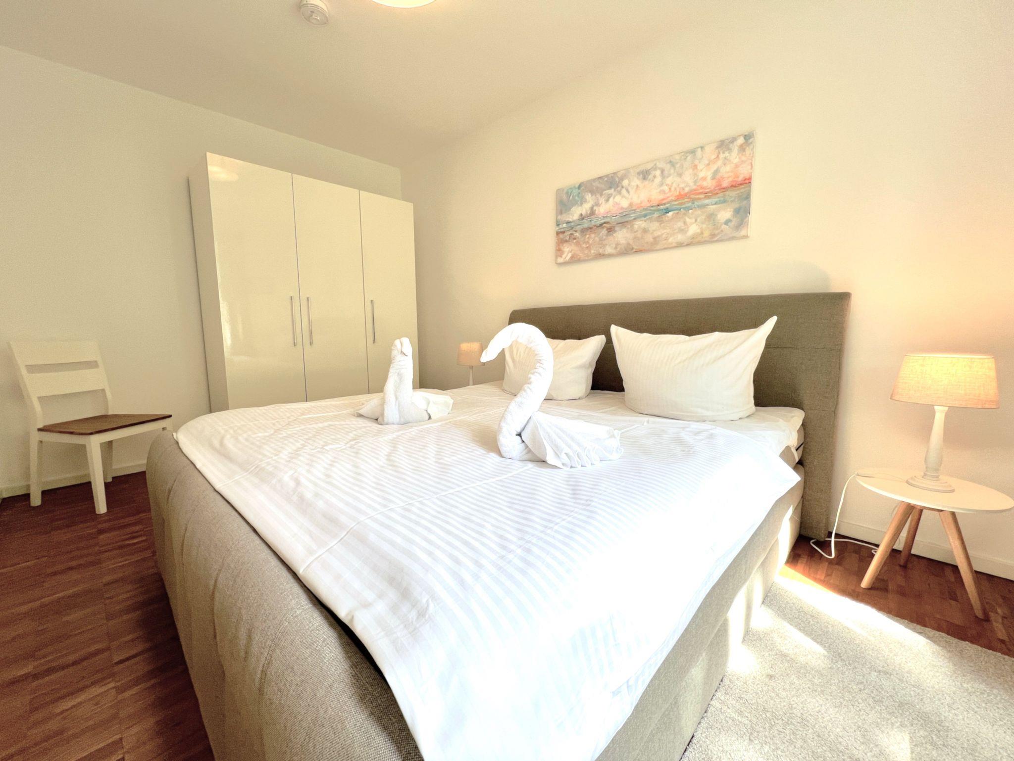 Das separate Schlafzimmer ist mit einem komfortablen Boxspringbett (1,80×2,00m) und TV ausgestattet. Die offene Küche verfügt u.a. über Backofen, Herd, Geschirrspüler, Kühlschrank mit Gefrierfach sowie Kaffeemaschine, Wasserkocher und Toaster. Das moderne Badezimmer bietet eine bodengleiche Dusche und eine Waschmaschine. WLAN, zwei Fernseher, Fußbodenheizung, ein Arbeitsplatz sowie ein Aufzug im Haus sorgen für zusätzlichen Komfort. Die Wohnung ist Nichtraucherbereich, Haustiere auf Anfrage.