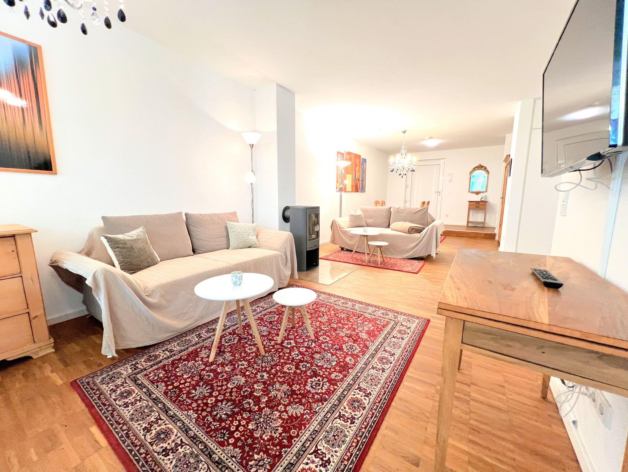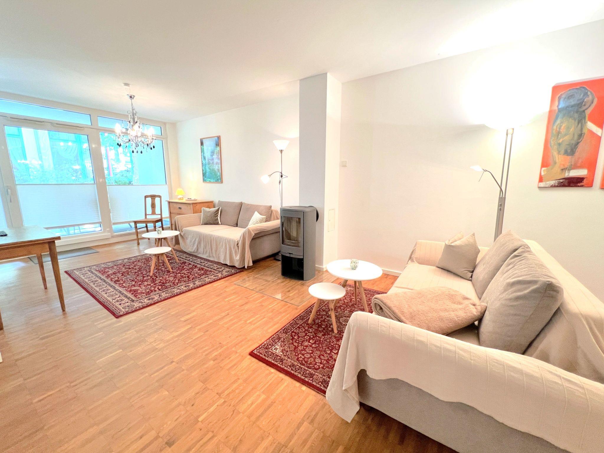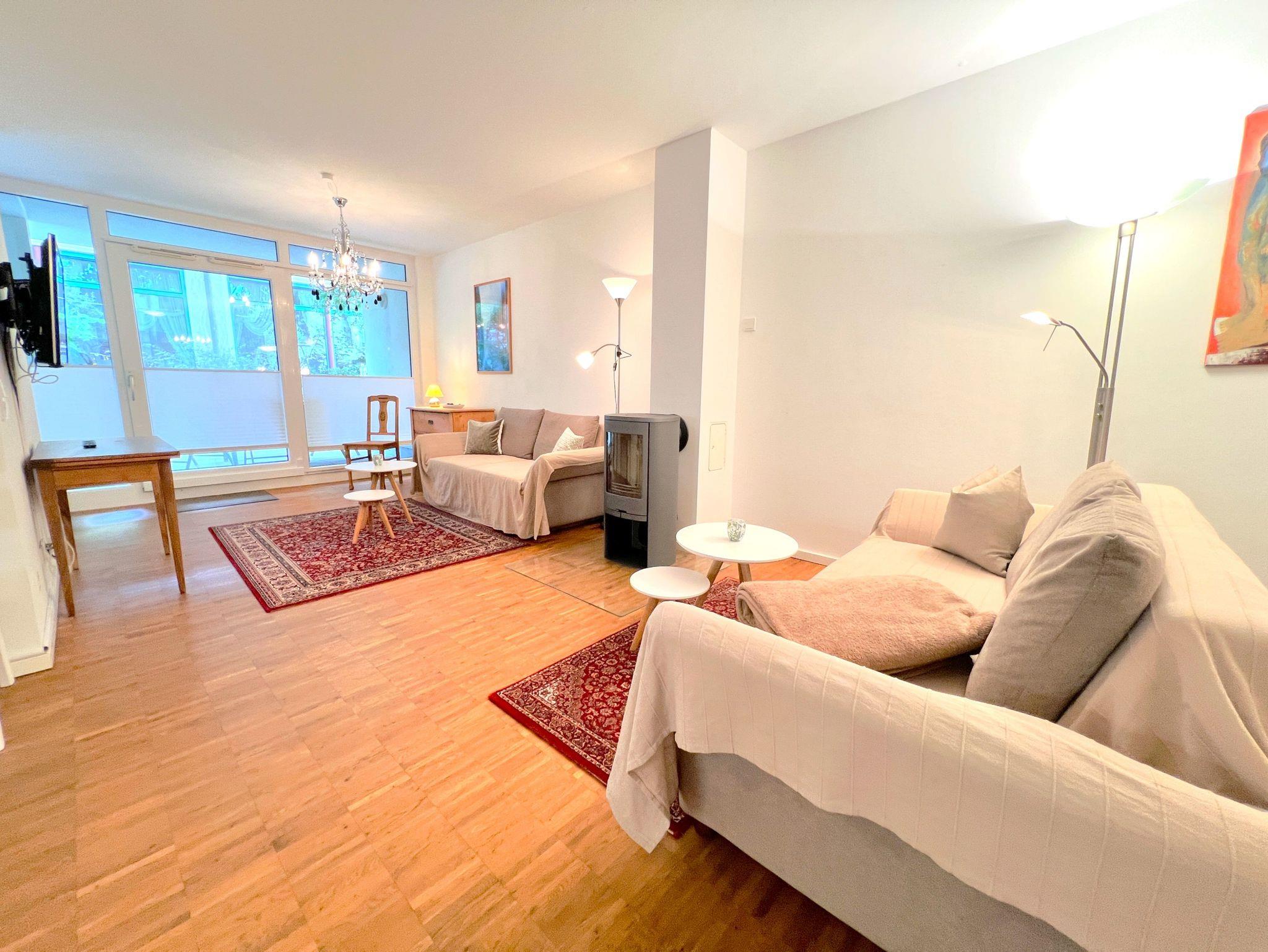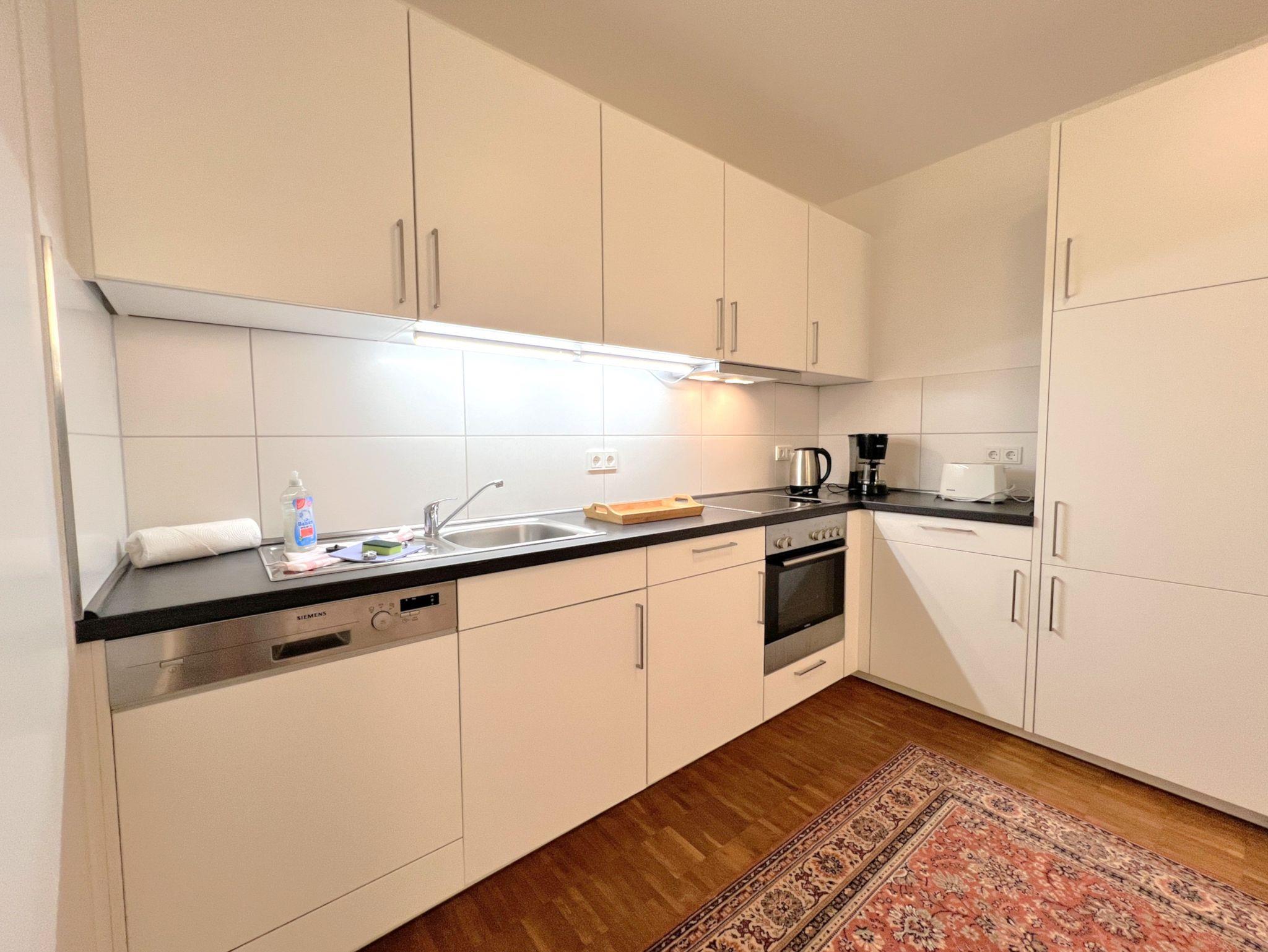 Das separate Schlafzimmer ist mit einem komfortablen Boxspringbett (1,80×2,00m) und TV ausgestattet. Die offene Küche verfügt u.a. über Backofen, Herd, Geschirrspüler, Kühlschrank mit Gefrierfach sowie Kaffeemaschine, Wasserkocher und Toaster. Das moderne Badezimmer bietet eine bodengleiche Dusche und eine Waschmaschine. WLAN, zwei Fernseher, Fußbodenheizung, ein Arbeitsplatz sowie ein Aufzug im Haus sorgen für zusätzlichen Komfort. Die Wohnung ist Nichtraucherbereich, Haustiere auf Anfrage.