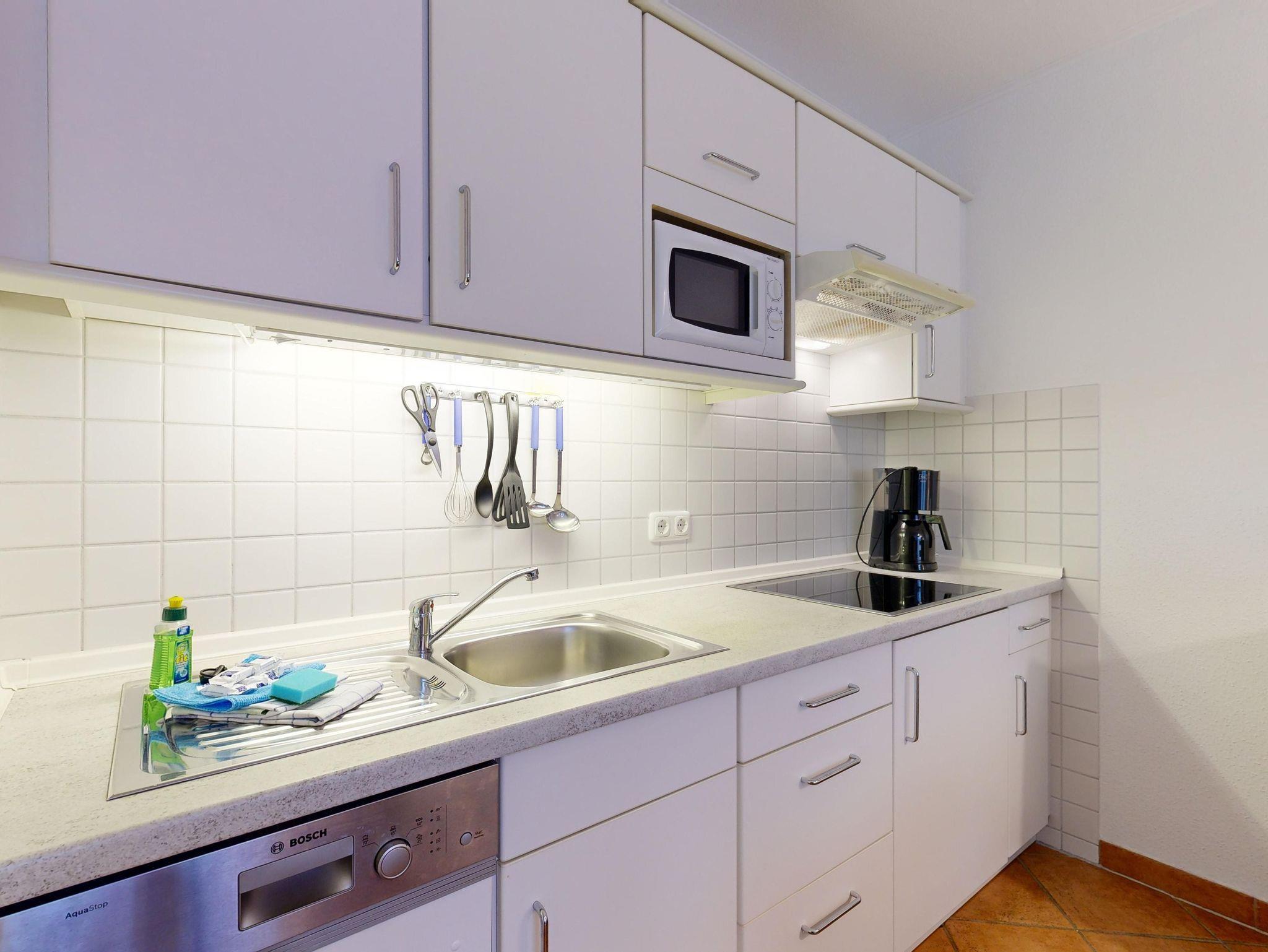 Küchenzeile mit Spülmaschine, Ceranfeld, Mikrowelle, Kaffeemaschine, Toaster und Kühlschrank mit Gefrierfach