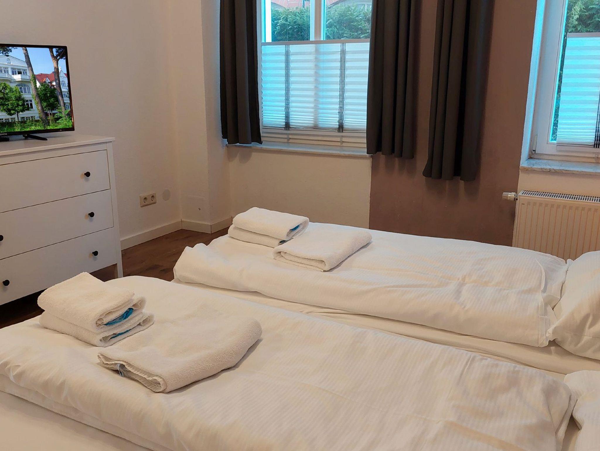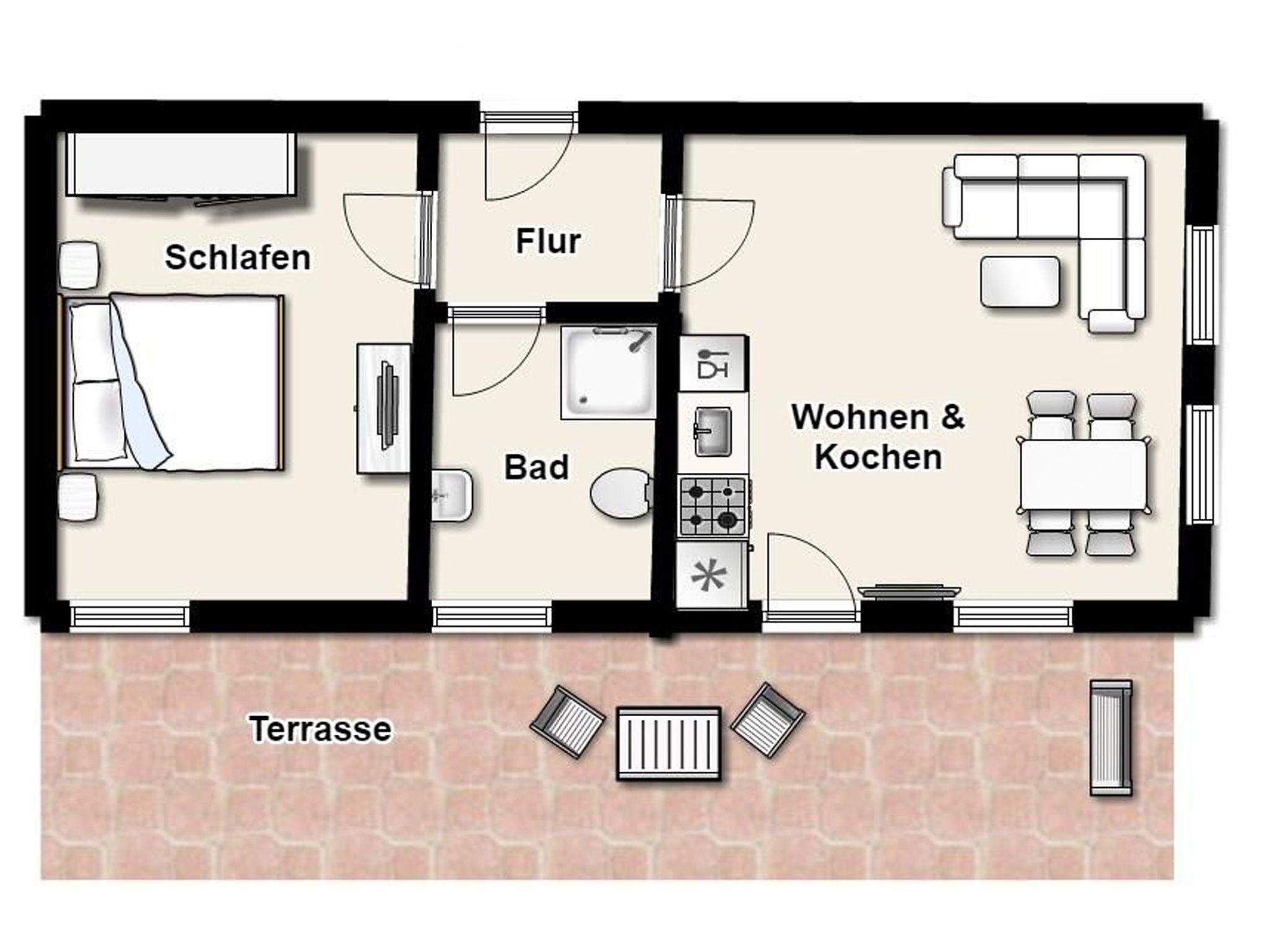 Es erwartet Sie die ebenerdige 2-Raum-Nichtraucherwohnung 30RB4 im Erdgeschoß der Villa Frigga. Sie ist 52 qm groß, verfügt über zwei Terrassen und ist für bis zu 4 Personen ausgelegt.