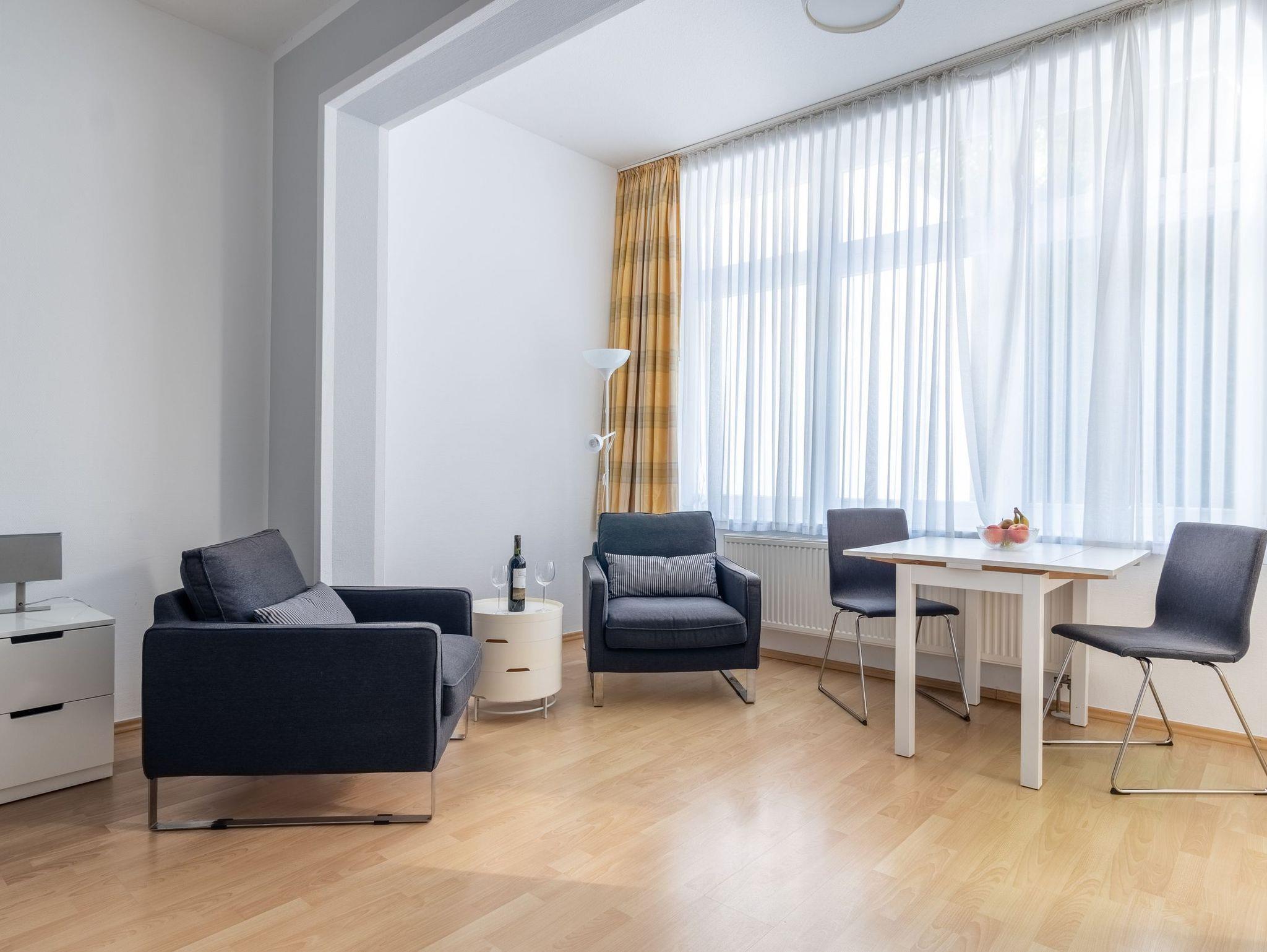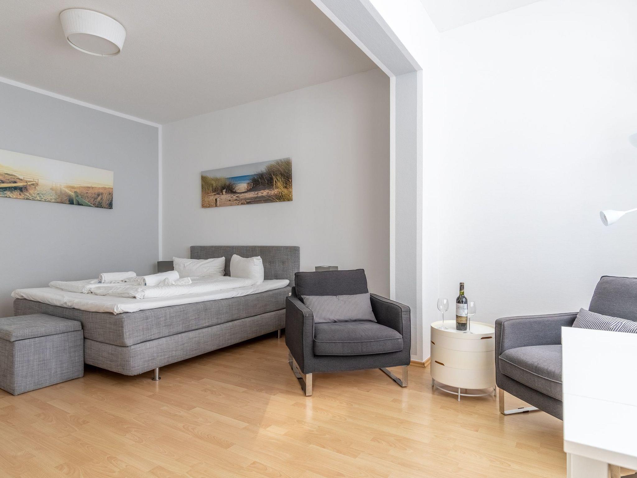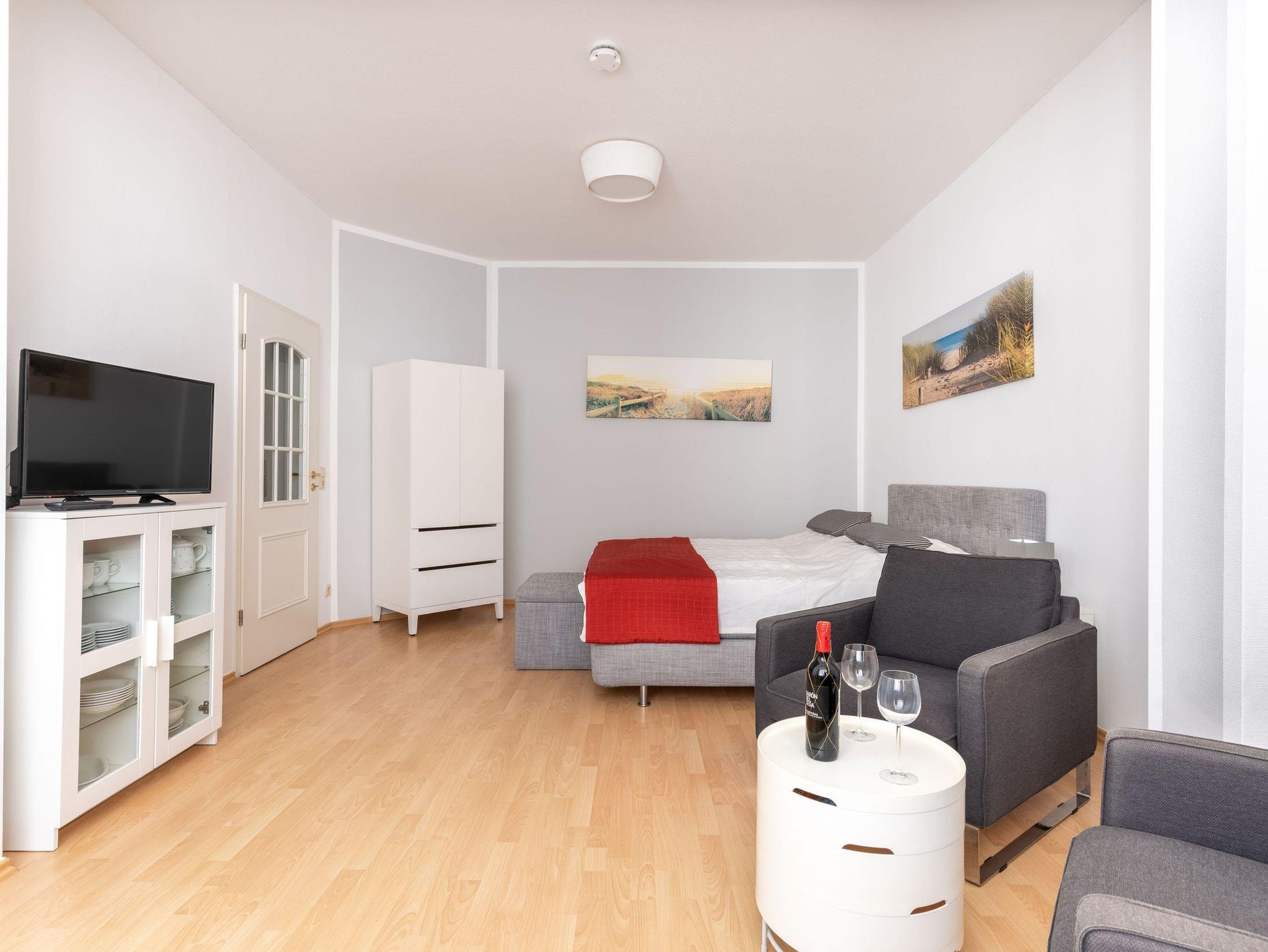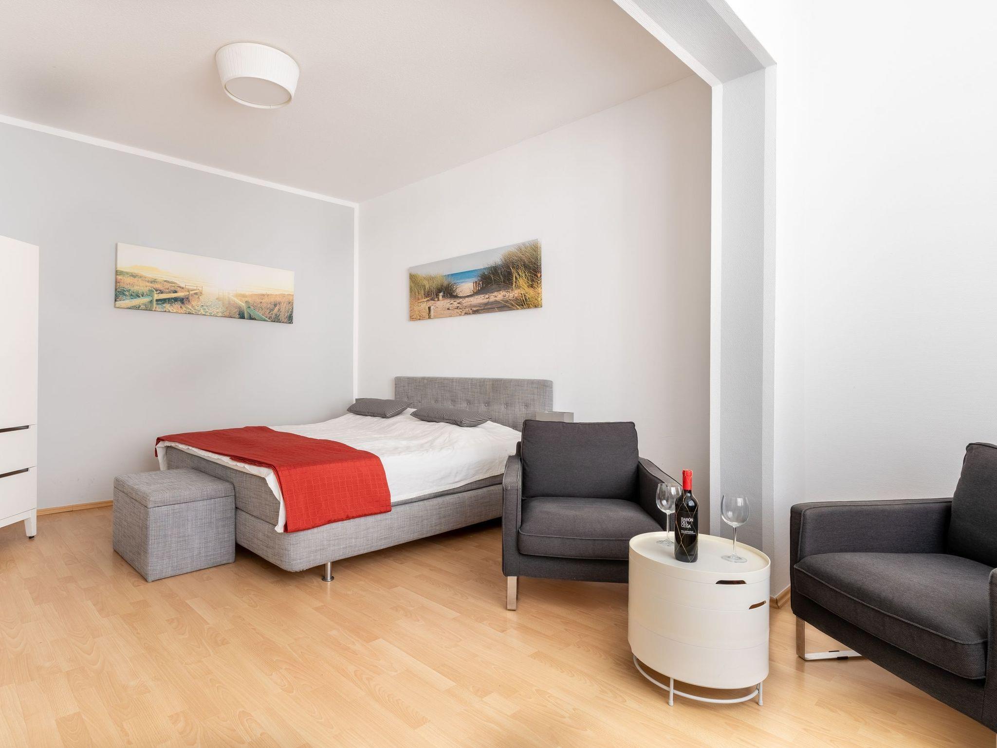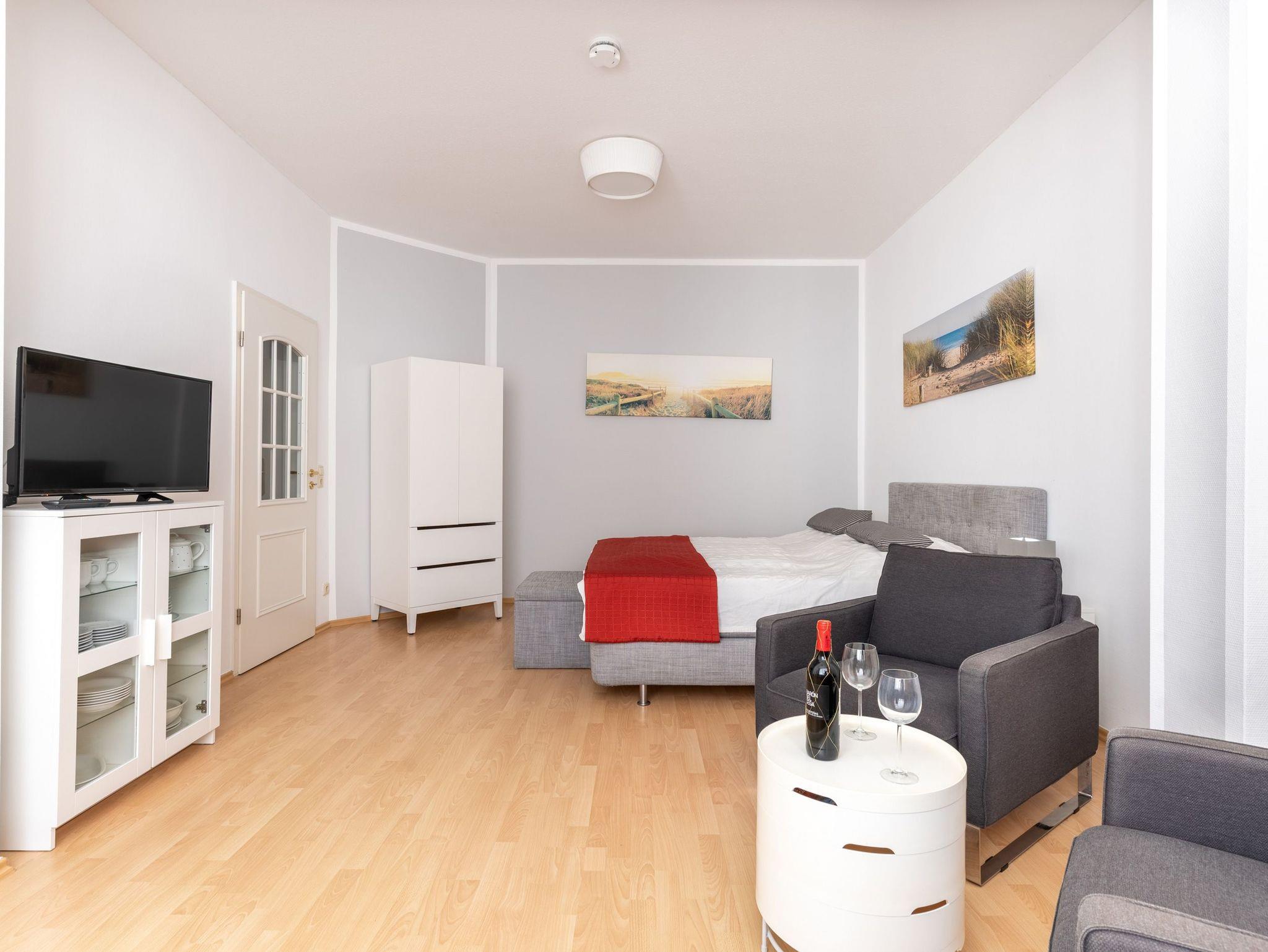Unsere 35 qm großes 1- Raum Apartments bieten Ihnen gemütliche und moderne Wohnqualität. Es ist für 2 Personen geeignet. Eine Aufbettung mit einem Babyreisebett ist möglich.