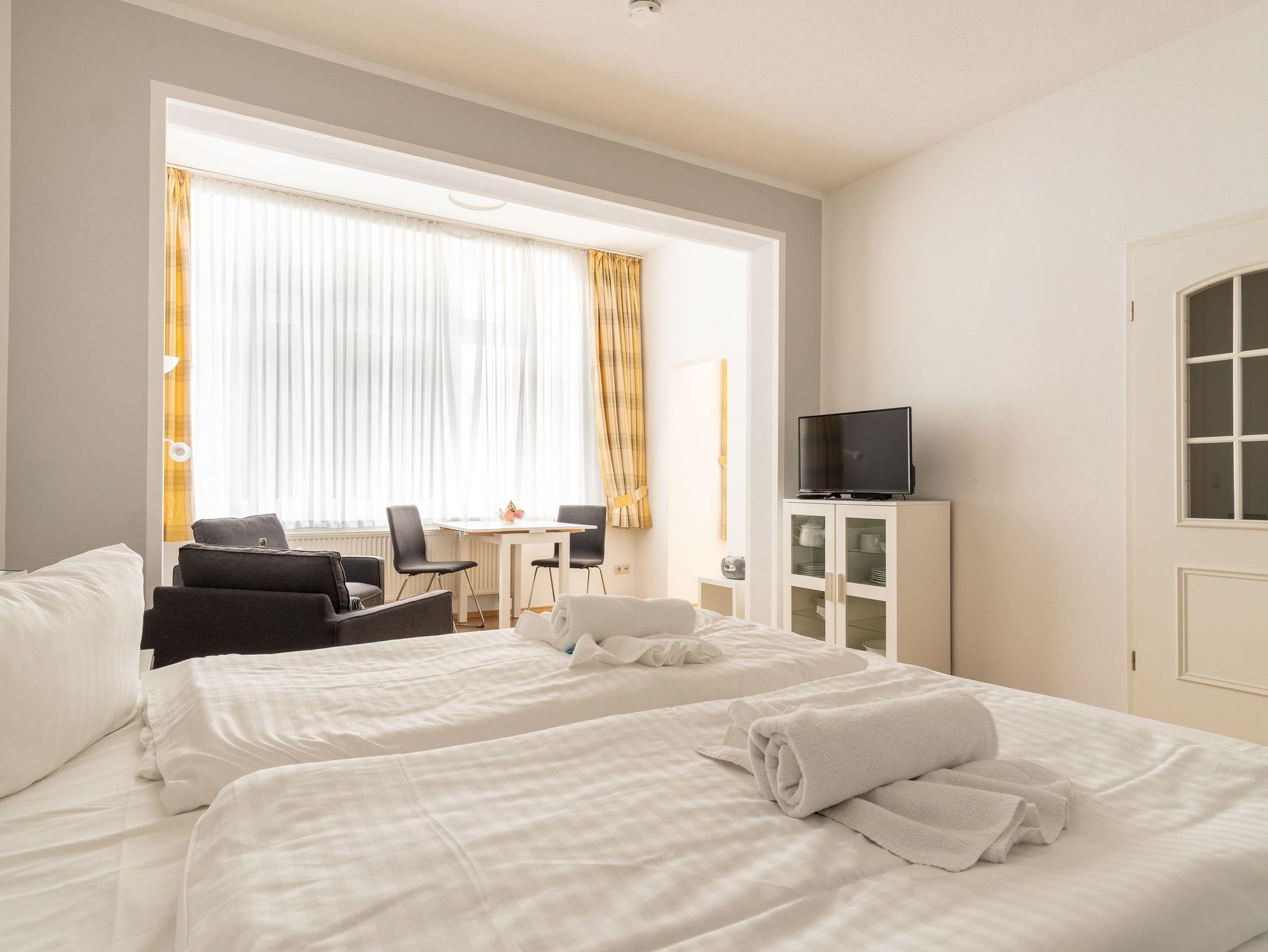 Im modern eingerichteten Wohn- Schlafzimmer steht Ihnen ein Doppelbett, eine gemütliche Sitzecke, ein Essbereich und TV zur Verfügung.,