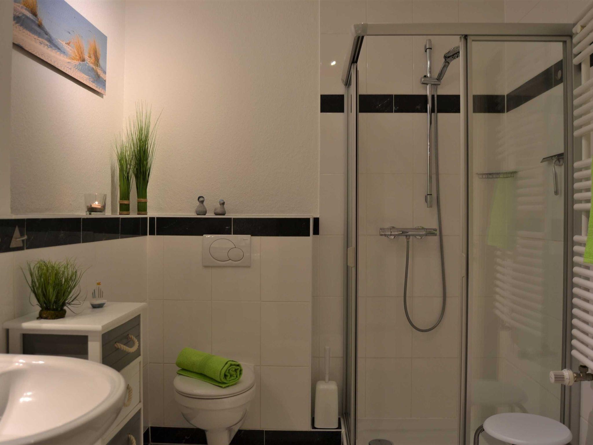 Das großzügige Duschbad ist sowohl vom Flur, als auch vom Schlafzimmer aus zugängig.