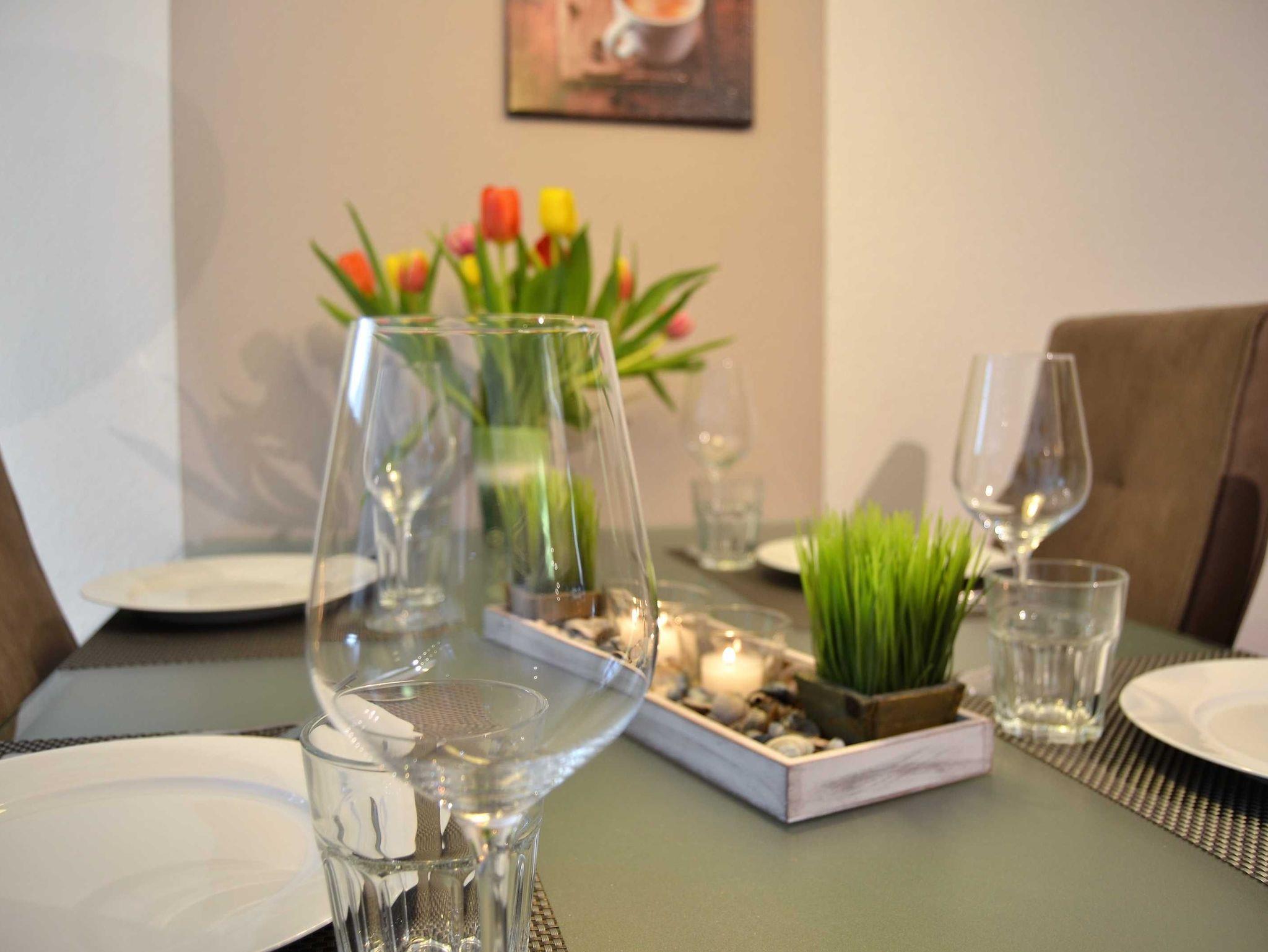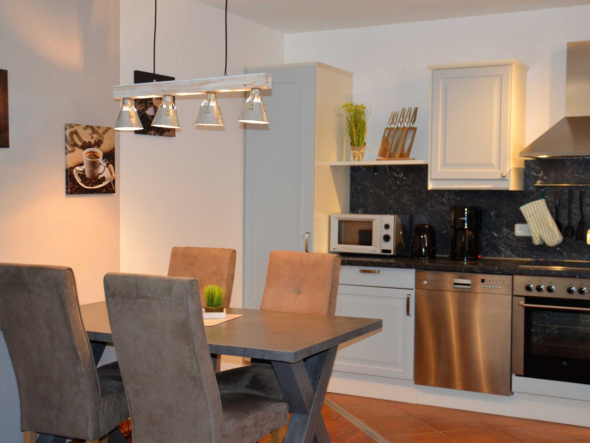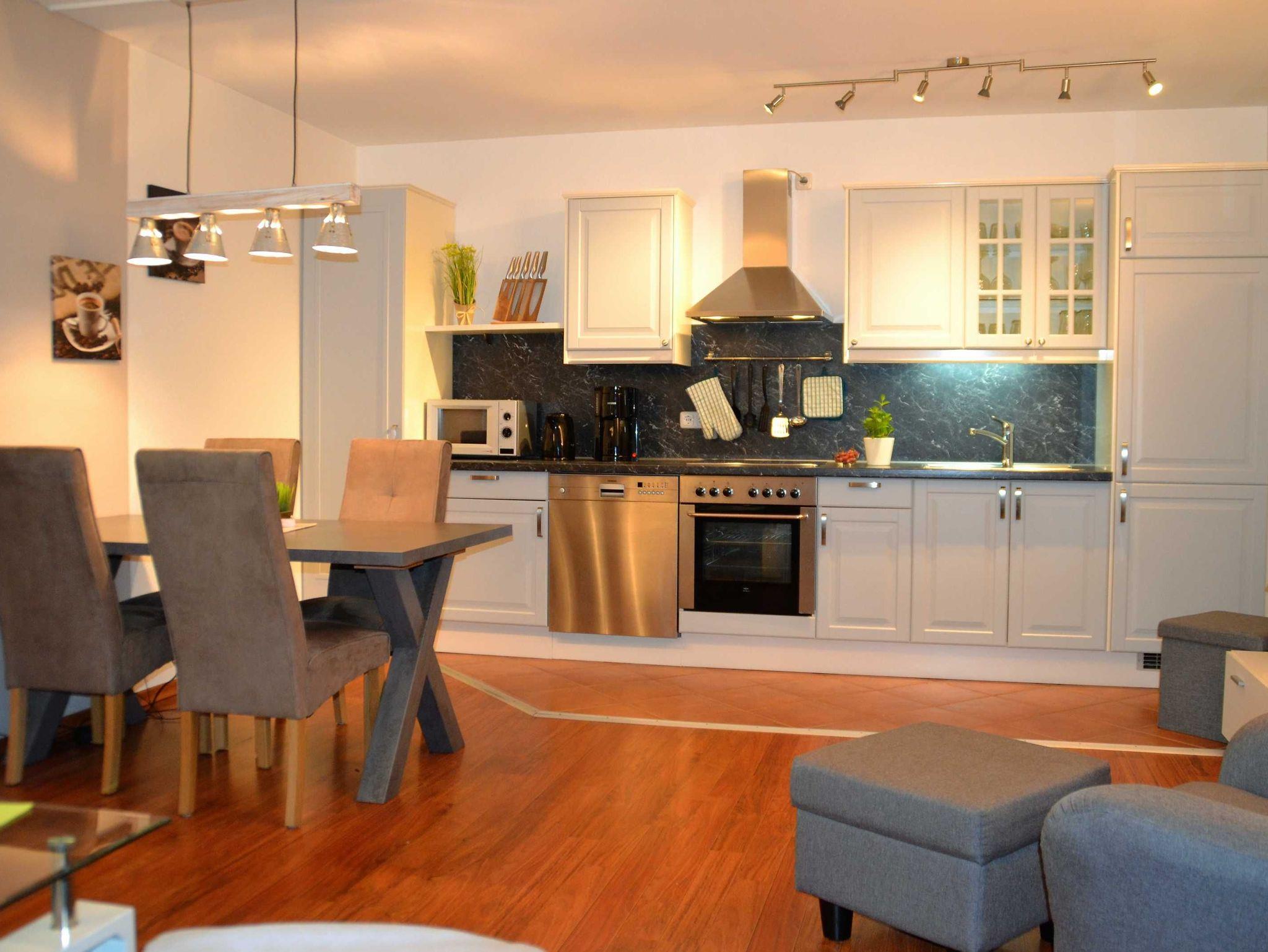 Mit dem Fahrstuhl erreicht man das moderne, komfortabel eingerichte Appartement in der 1. Etage, das über einen offenen Wohnbereich mit gemütlicher Couch und einem bequemen Ohrensessel mit Hocker verfügt, sowie über den integrierten Essbereich mit Tisch und 4 Stühlen. Es erwartet den Gast eine moderne Ausstattung mit internetfähigem Flat-TV, WiFi, Blu-ray-/DVD-Player (Panasonic) und Musikanlage (Teufel).