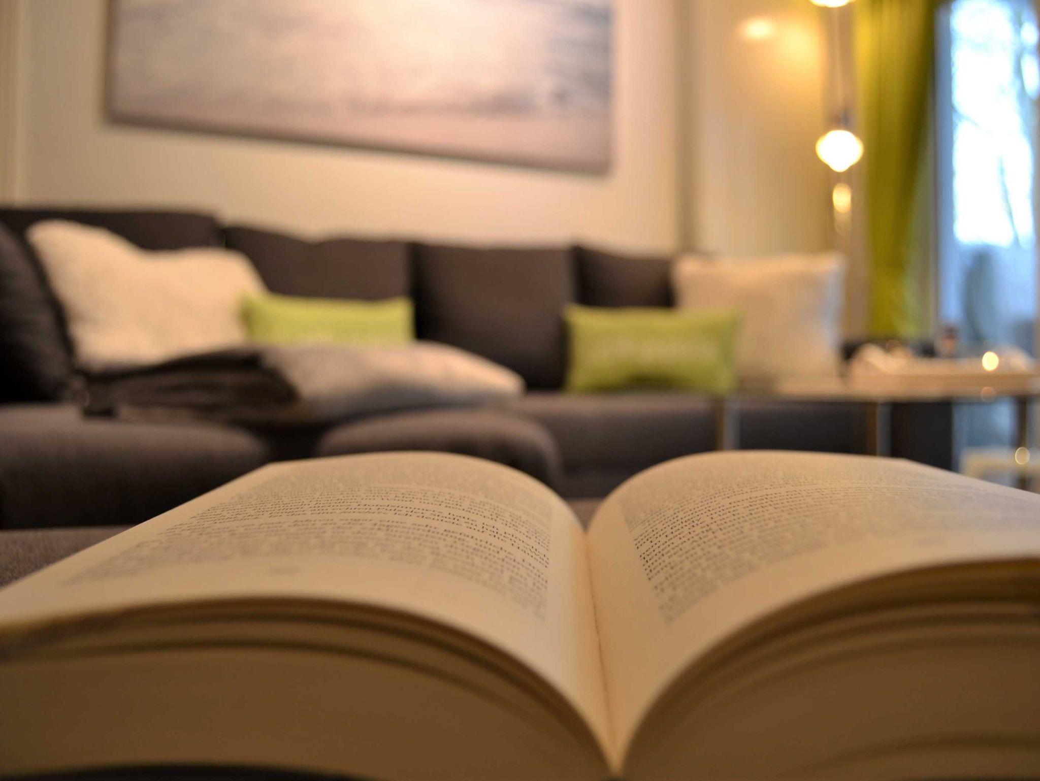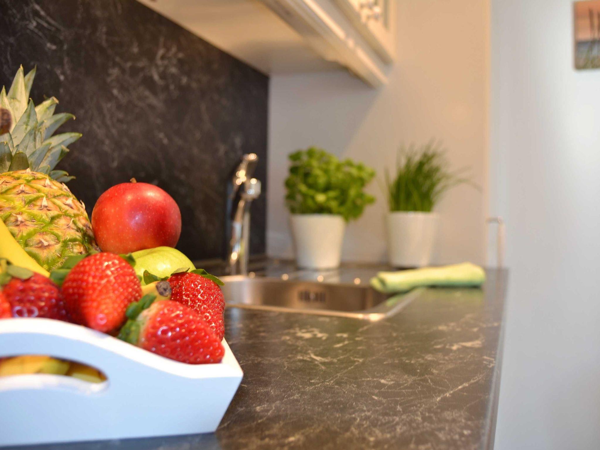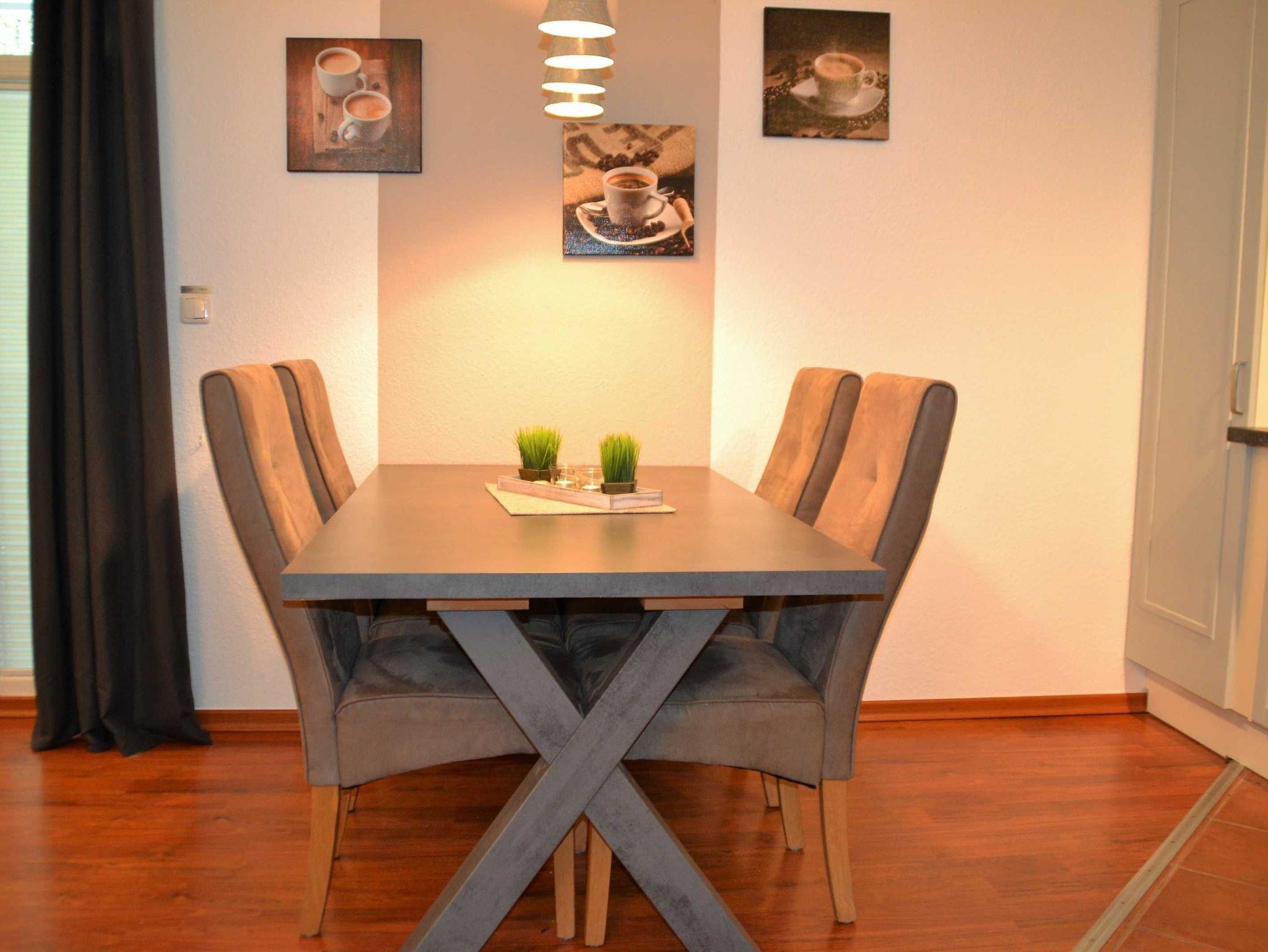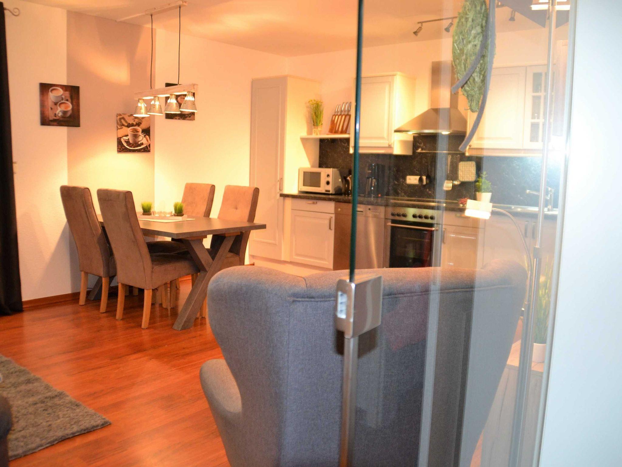 Mit dem Fahrstuhl erreicht man das moderne, komfortabel eingerichte Appartement in der 1. Etage, das über einen offenen Wohnbereich mit gemütlicher Couch und einem bequemen Ohrensessel mit Hocker verfügt, sowie über den integrierten Essbereich mit Tisch und 4 Stühlen. Es erwartet den Gast eine moderne Ausstattung mit internetfähigem Flat-TV, WiFi, Blu-ray-/DVD-Player (Panasonic) und Musikanlage (Teufel).