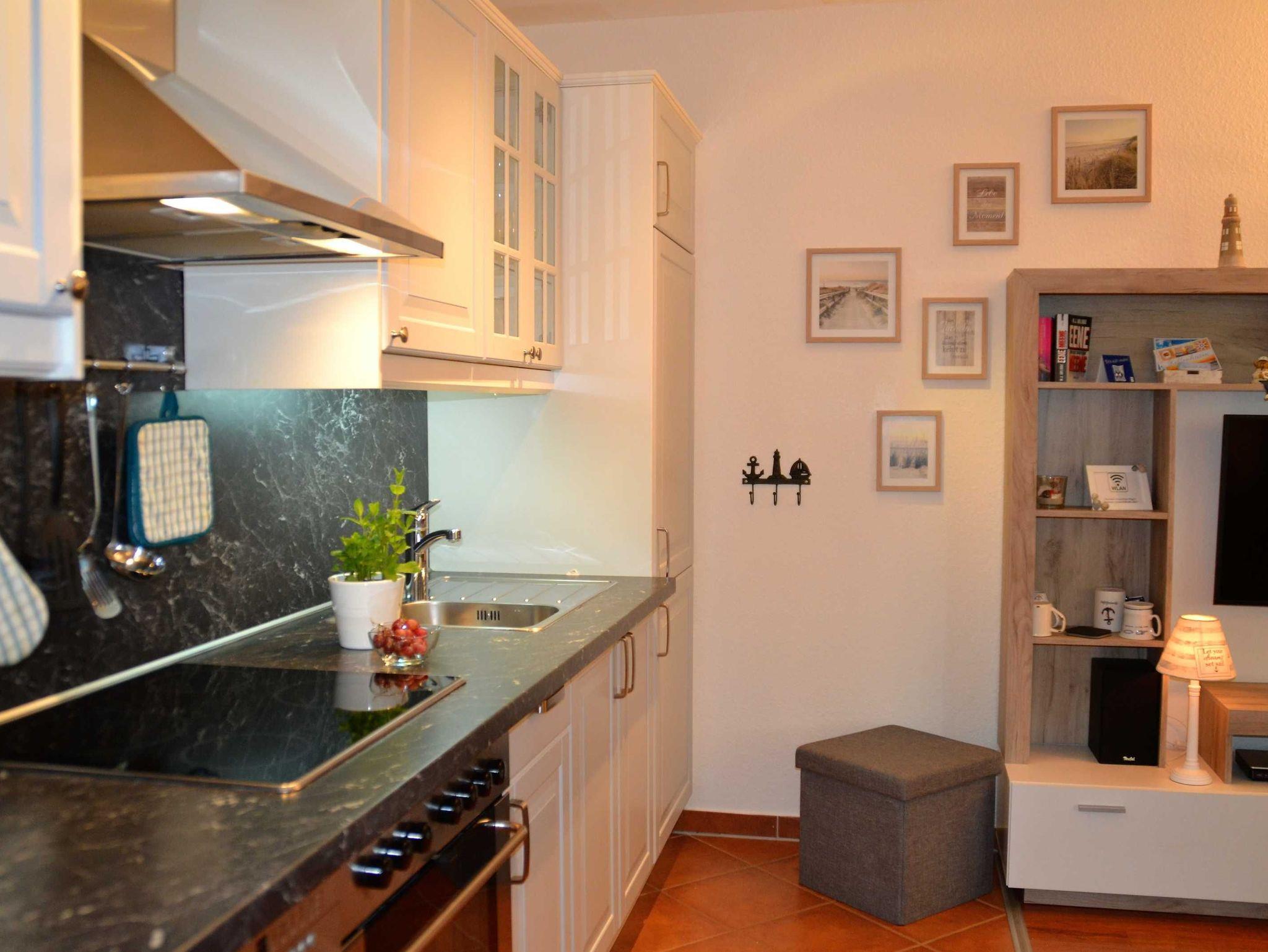 Der ansprechende Küchenbereich im Landhausstil ist ebenfalls in dieses offene Wohnkonzept integriert und ermöglicht so das gerade im Urlaub sehr beliebte, kommunikative Wohngefühl für alle Gäste. Die Küche ist selbstverständlich komplett ausgestattet und verfügt über alle Geräte wie Kühlschrank mit Gefrierfach, Geschirrspülmaschine, E-Herd, Backofen, Mikrowelle, Kaffeemaschine, Wasserkocher und Toaster.