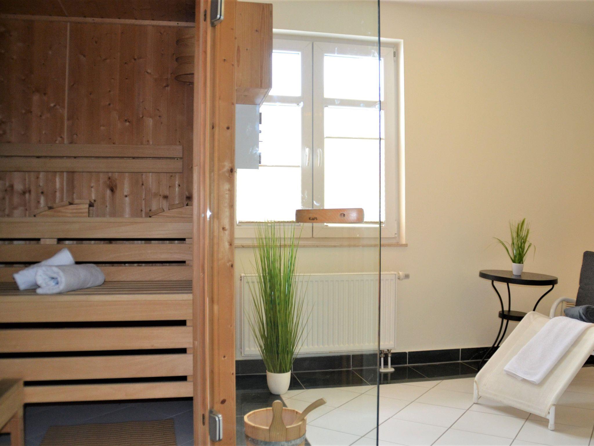 Ebenfalls auf der 1. Etage befindet sich ein Saunabereich mit Dusche. Ruheliegen in dem kleinen Wellness-Areal laden zum Erholen ein.