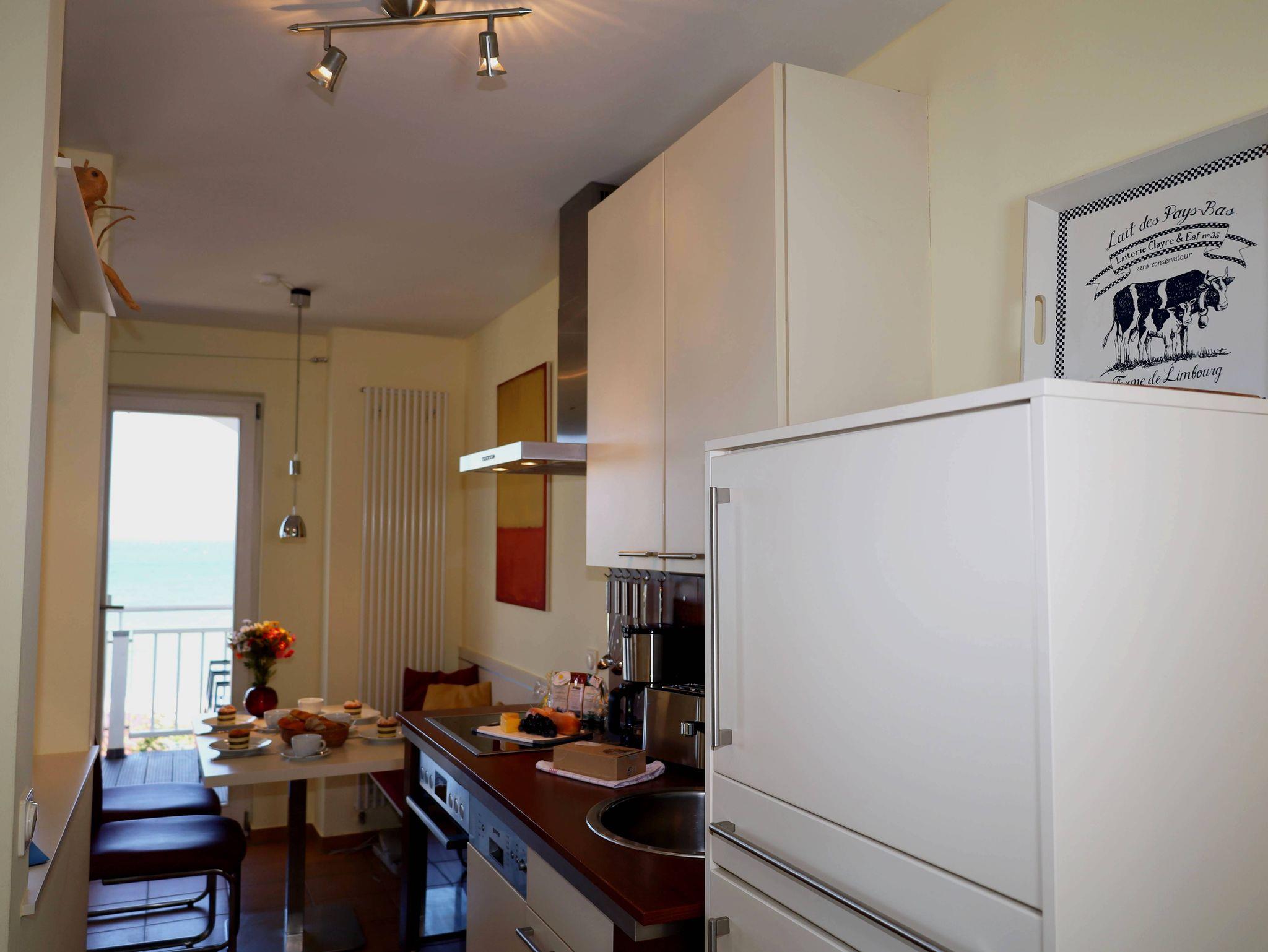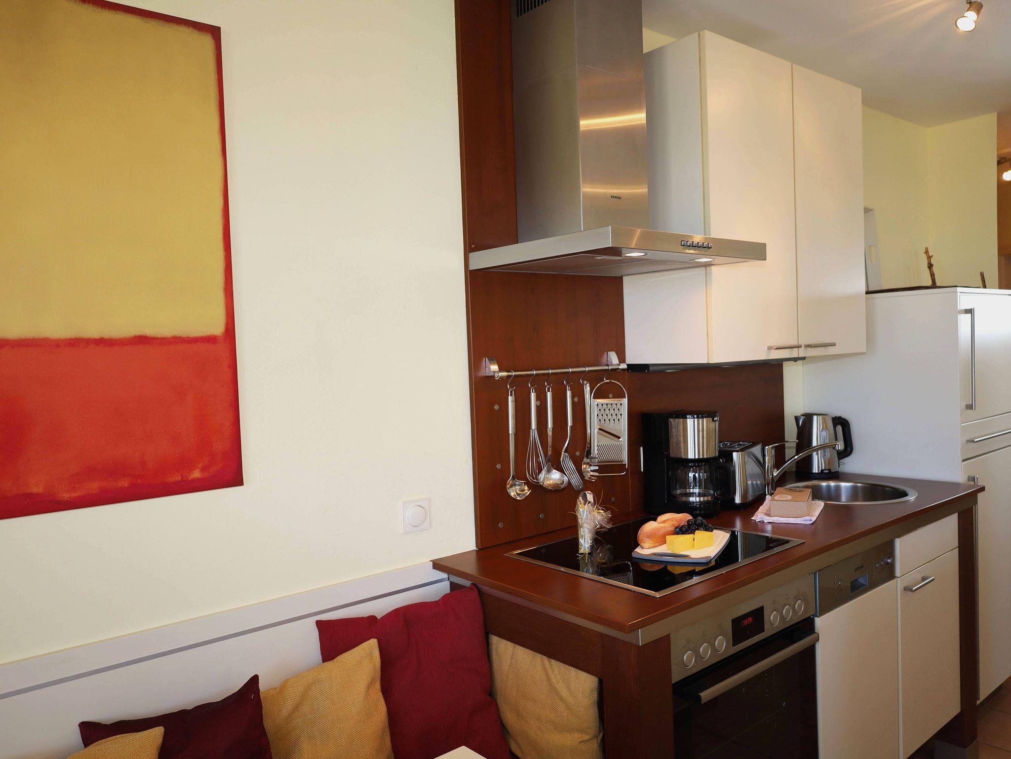 Die Küchenzeile ist mit Geschirrspüler, Ceran-Back-Herd und weiteren nützlichen Geräten wie Kaffeemaschine, Toaster, Wasserkocher etc. ausgestattet.