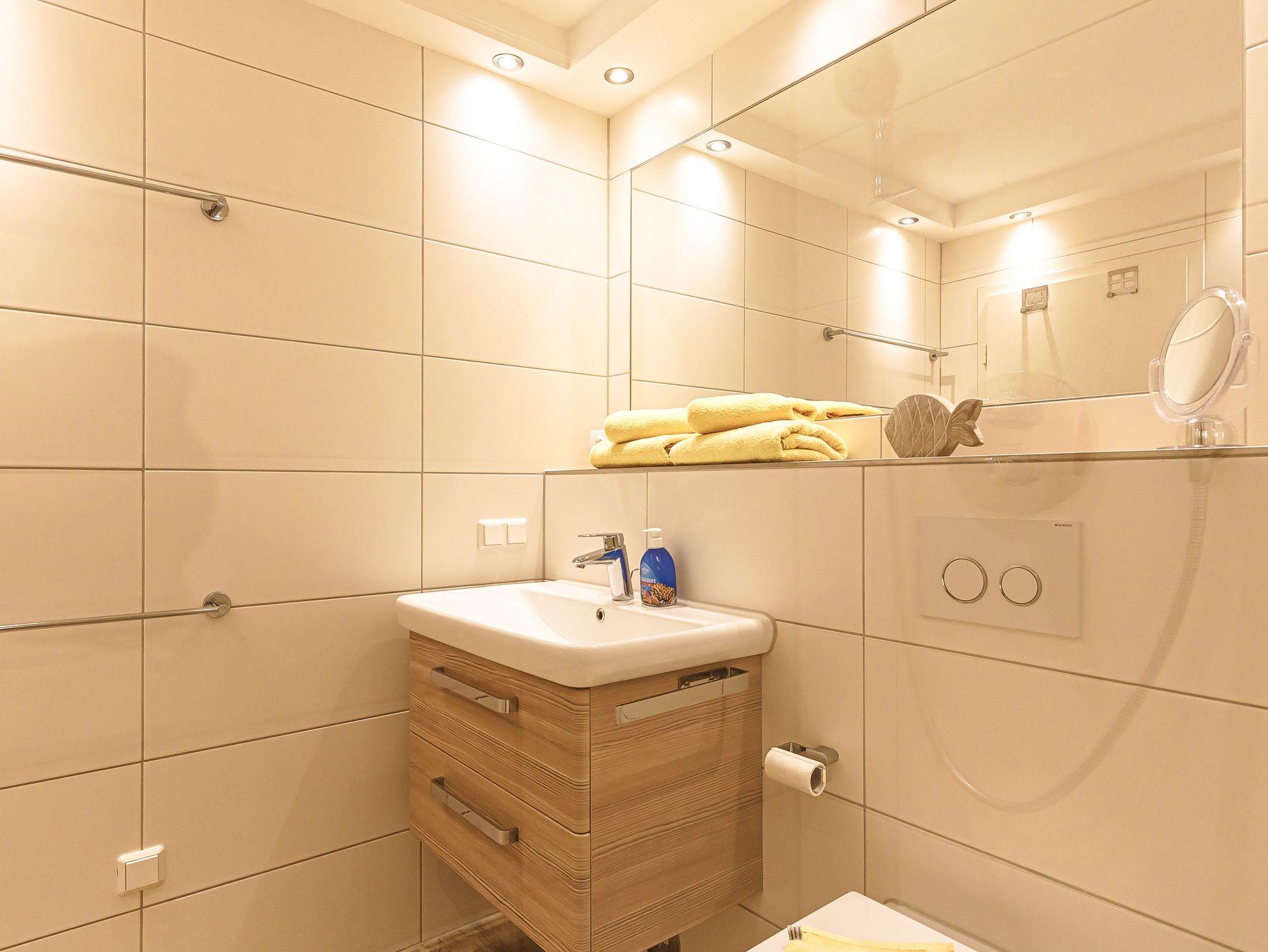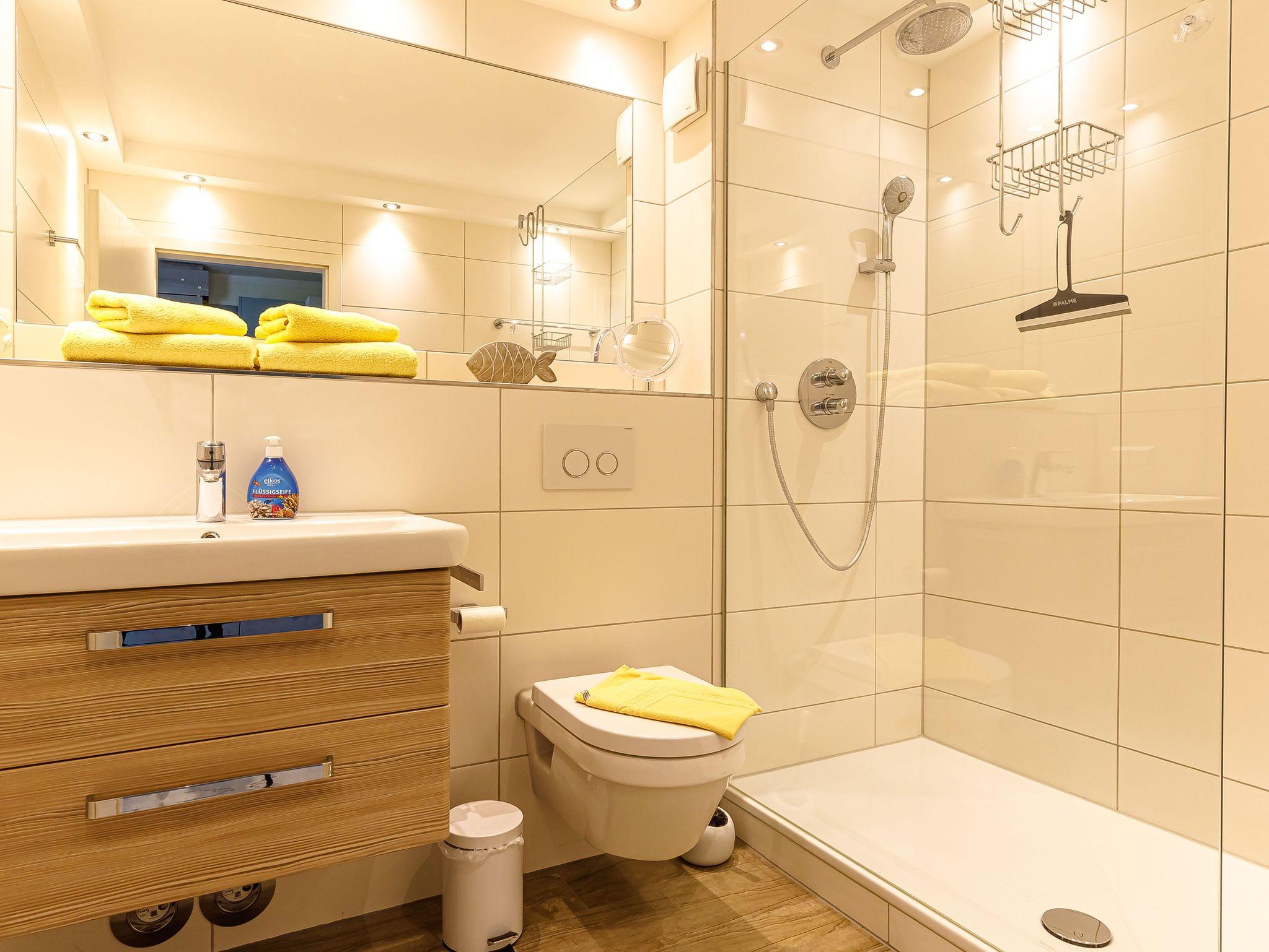 Das Bad verfügt über eine Dusche, Fußbodenheizung und ein Fön ist ebenfalls vorhanden.