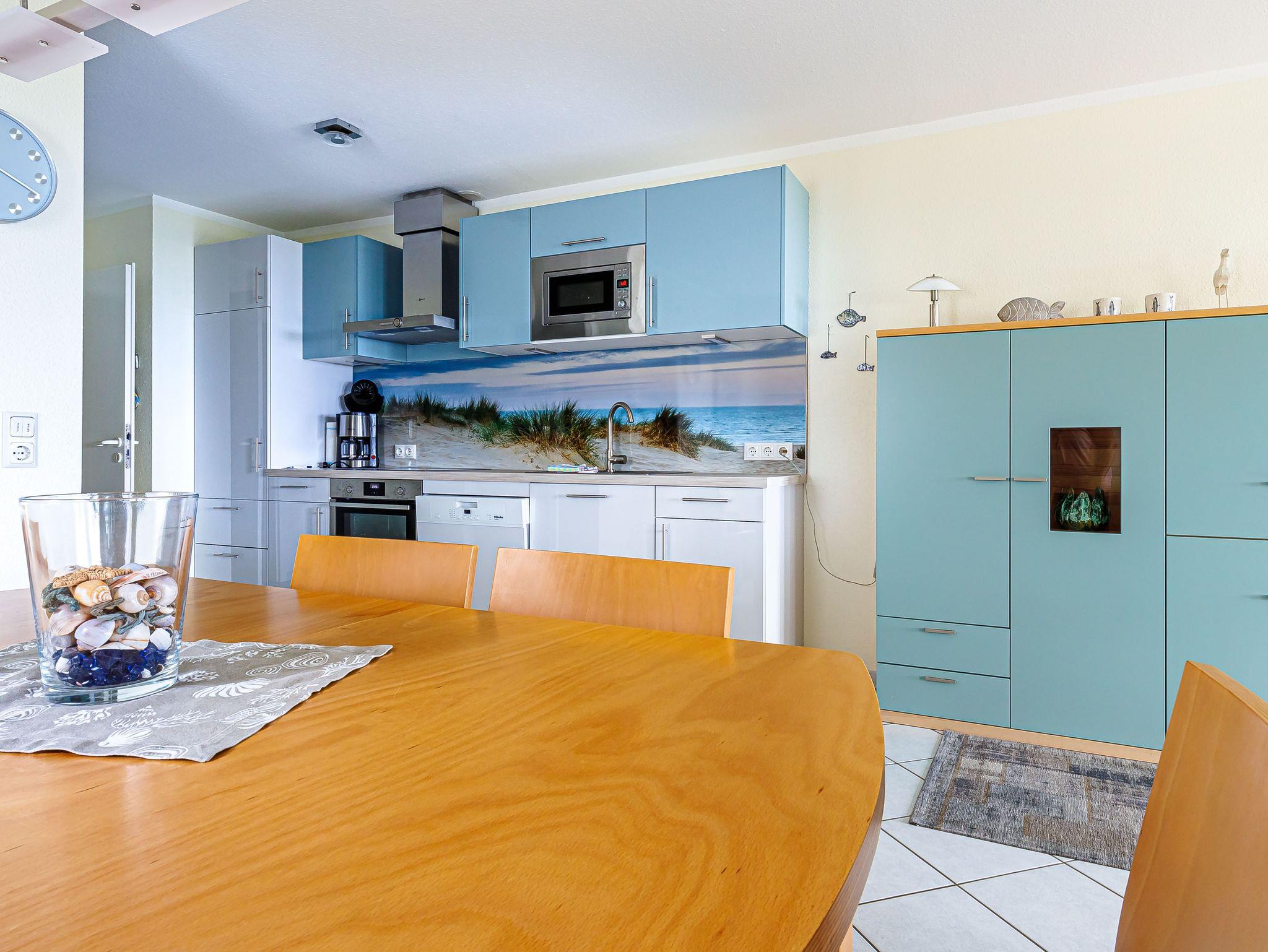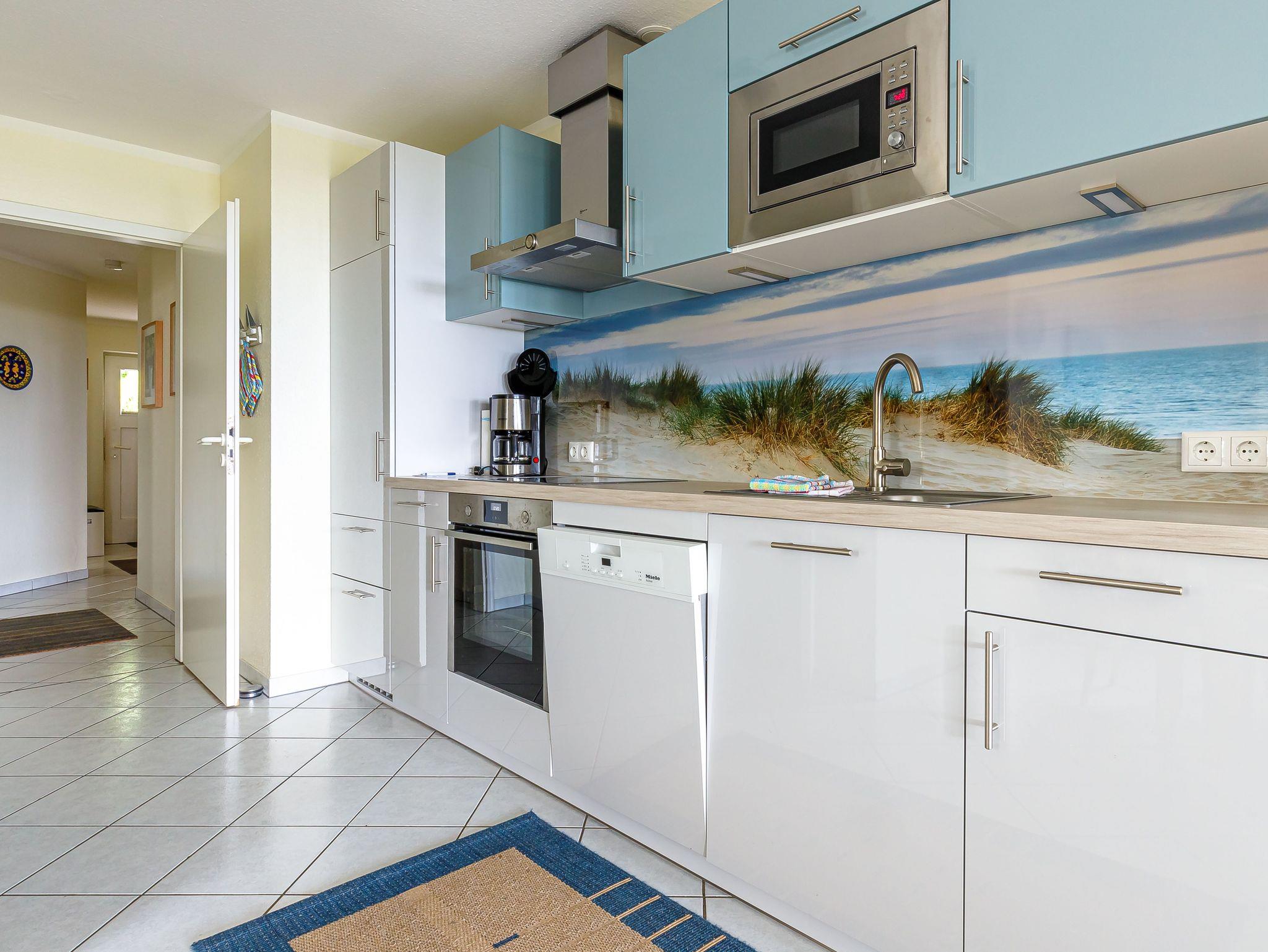 Die komplett ausgestattete Küche verfügt über einen Kühlschrank mit Gefrierfach, Mikrowelle, Cerankochfeld mit Backofen, Wasserkocher, Kaffeemaschine und Toaster.