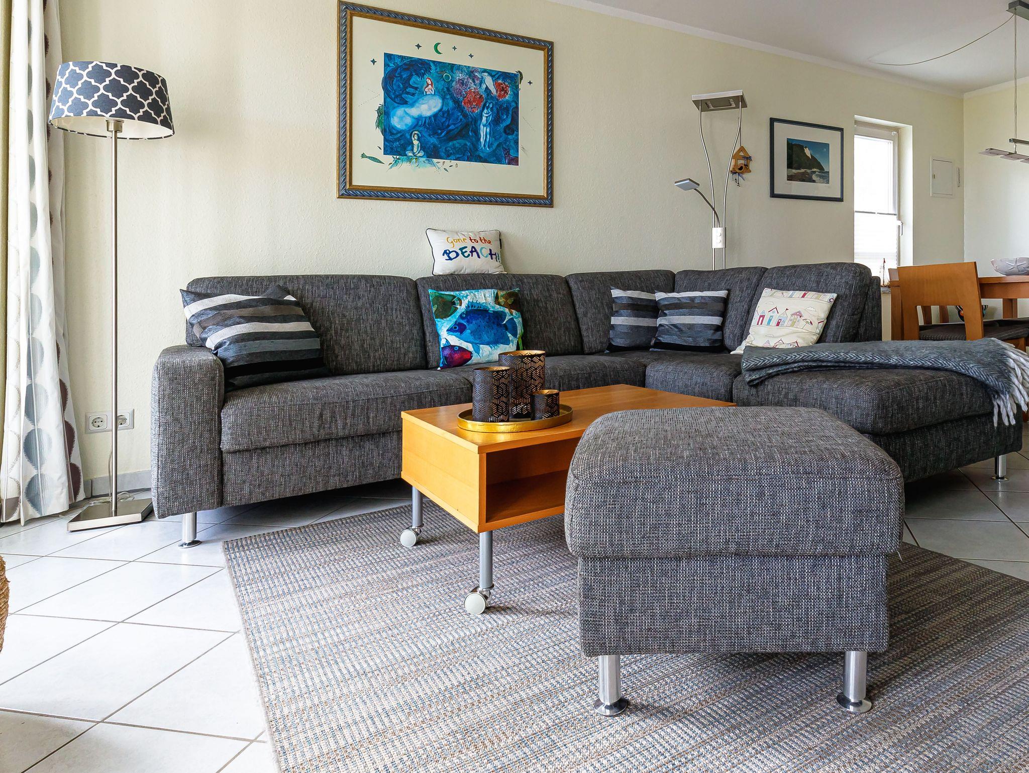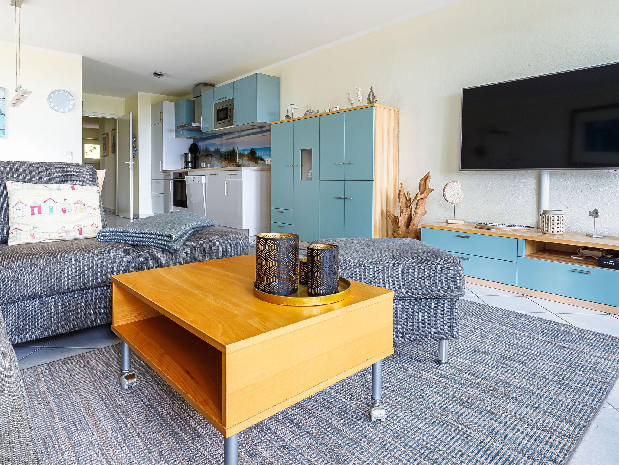 Im Wohnbereich lädt ein gemütliches Sofa und ein großer Flachbildfernseher zum verweilen ein. Der Essbereich bietet Platz für bis zu 4 Personen.