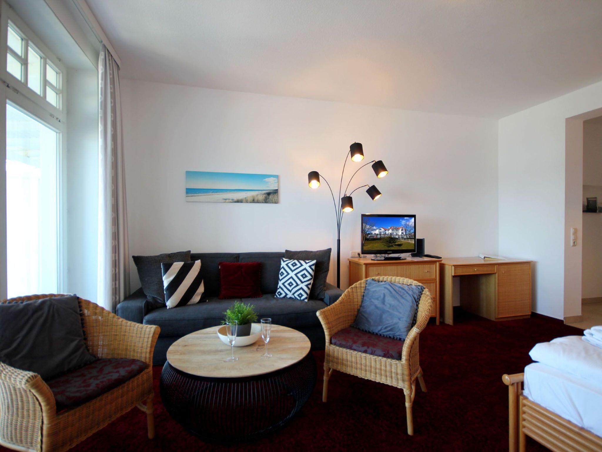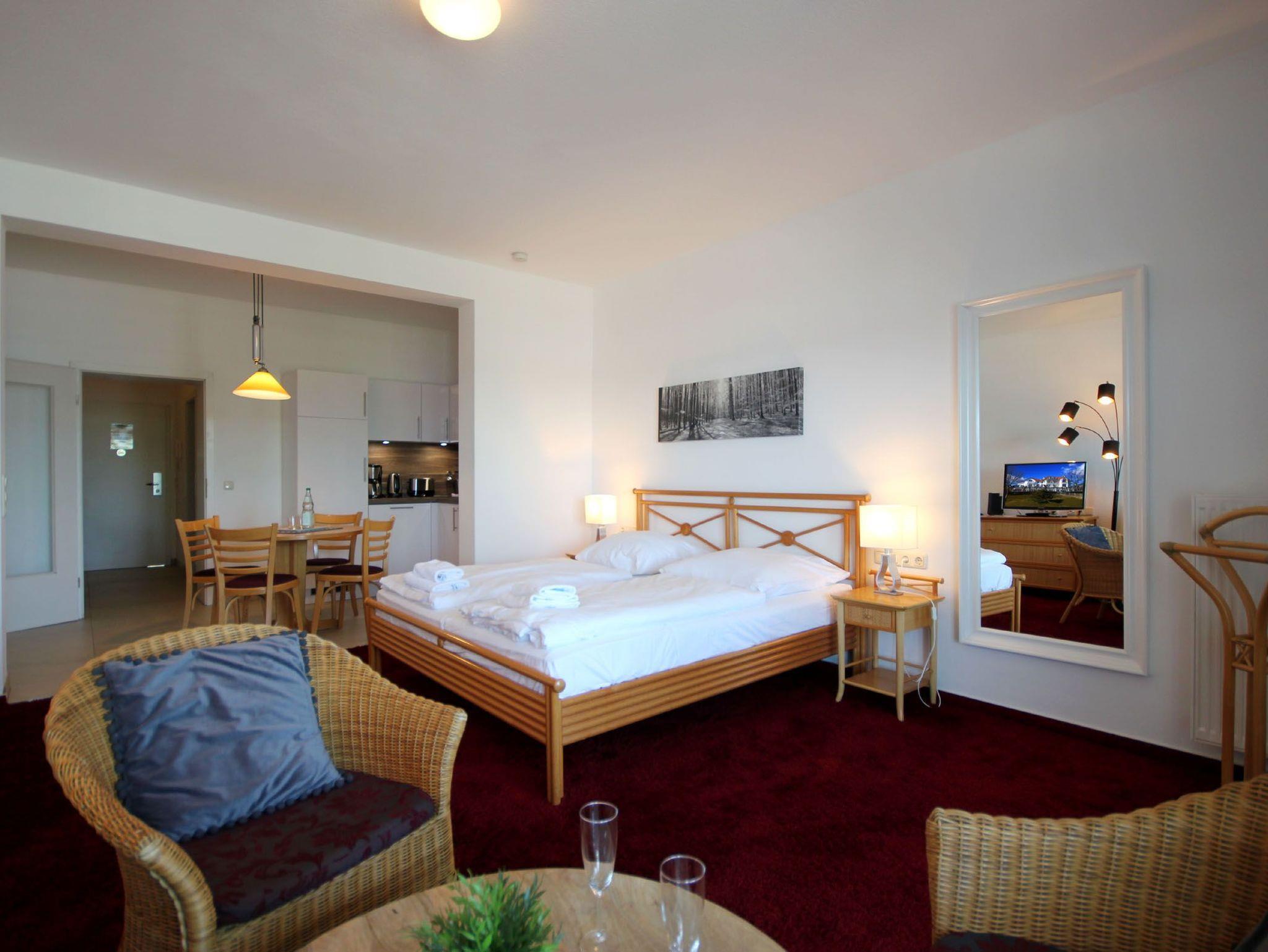 Ihre 1-Zimmer Ferienwohnung 225RB22 befindet sich im 2. Obergeschoss, ist ca. 45 qm groß und für bis zu 4 Personen gut geeignet. Neben dem kombinierten Wohn- und Schlafraum mit Doppelbett sowie Schlafsofa, auf dem die 3. und 4. Person gut schlafen können, gehört ein Essbereich, Flachbild TV sowie WLAN zur Nichtraucherwohnung. Vom überdachten Balkon haben Sie einen wundervollen Meerblick. Ebenfalls können Sie eine voll ausgestattete integrierte Küchenzeile mit Geschirrspüler, Nespresso-Maschine, Backofen, Mikrowelle, Wasserkocher, Toaster und Kaffeemaschine nutzen. Das Badezimmer erwartet Sie mit Waschtisch, WC und Dusche. Haustiere sind herzlich willkommen. Ein PKW-Stellplatz für Ihren PKW ist direkt am Haus vorhanden.