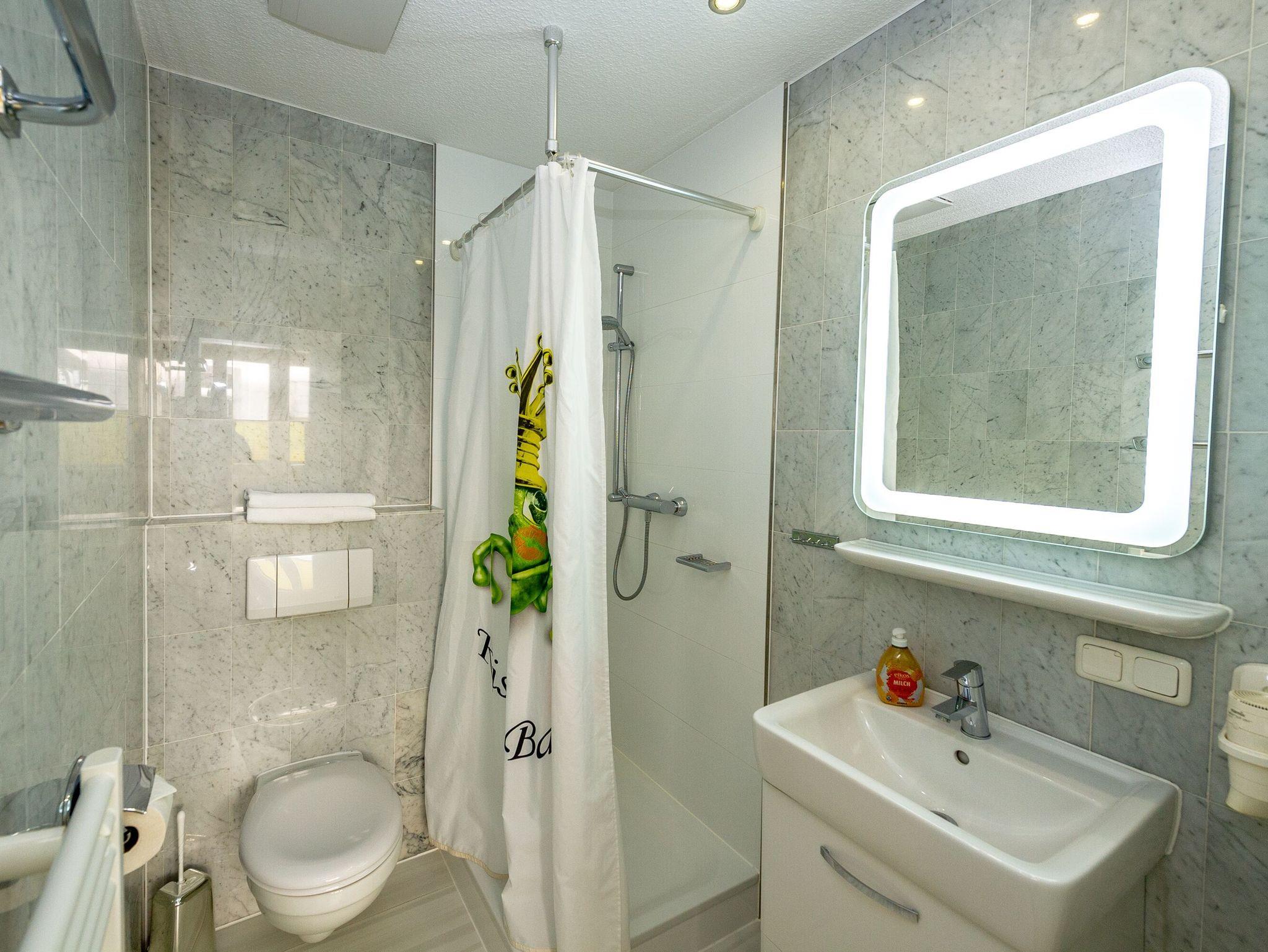 Im elegant gefliesten Duschbad mit WC, Waschtisch und Spiegel stehen Ihnen ein Haartrockner, ein Handtuch-Heizkörper und natürlich auch Ablageflächen für Ihre persönlichen Utensilien zur Verfügung.