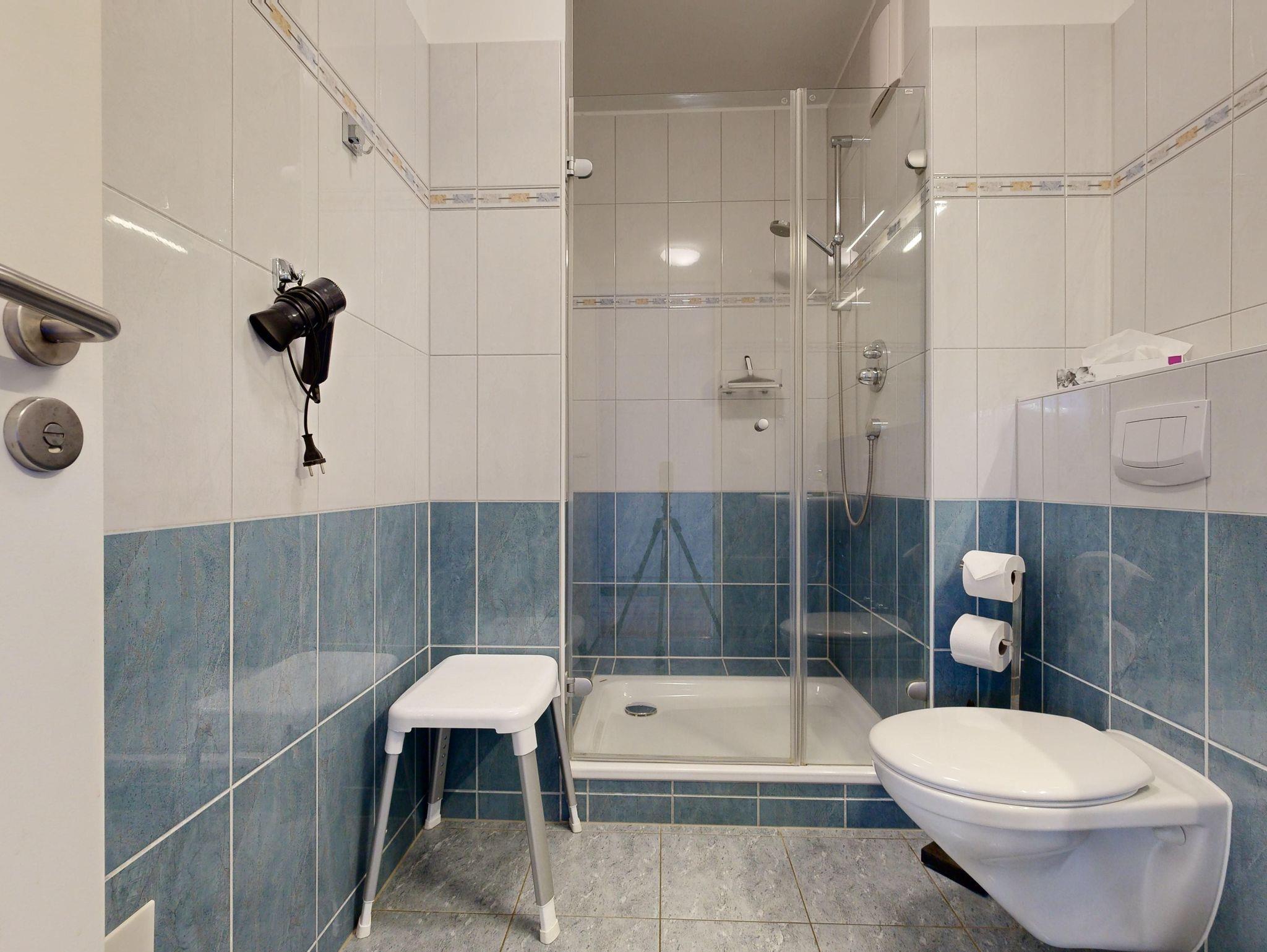 Badezimmer mit großer Dusche, WC und Föhn