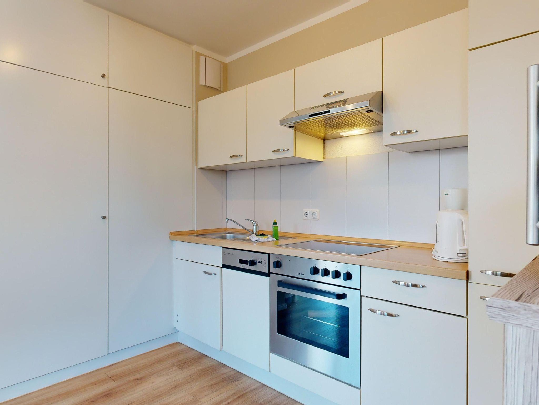 Küche mit Ceranfeld, Kühlschrank mit Gefrierfach, Backofen, Spülmaschine, Toaster, Wasserkocher, Kaffeemaschine