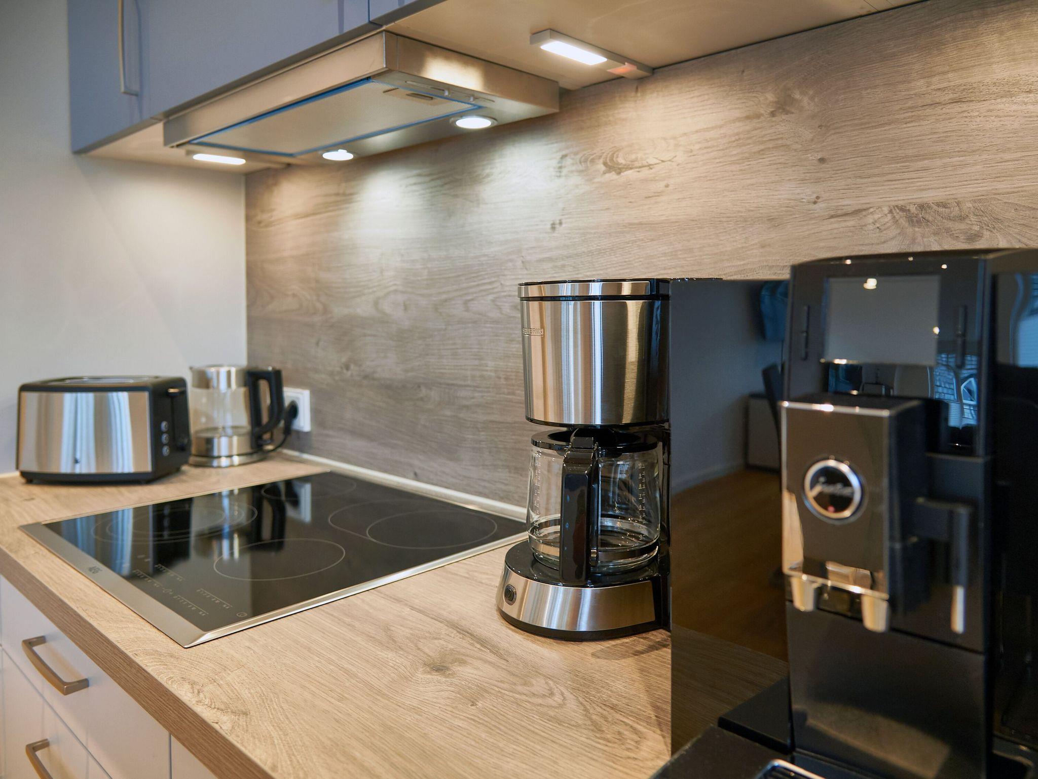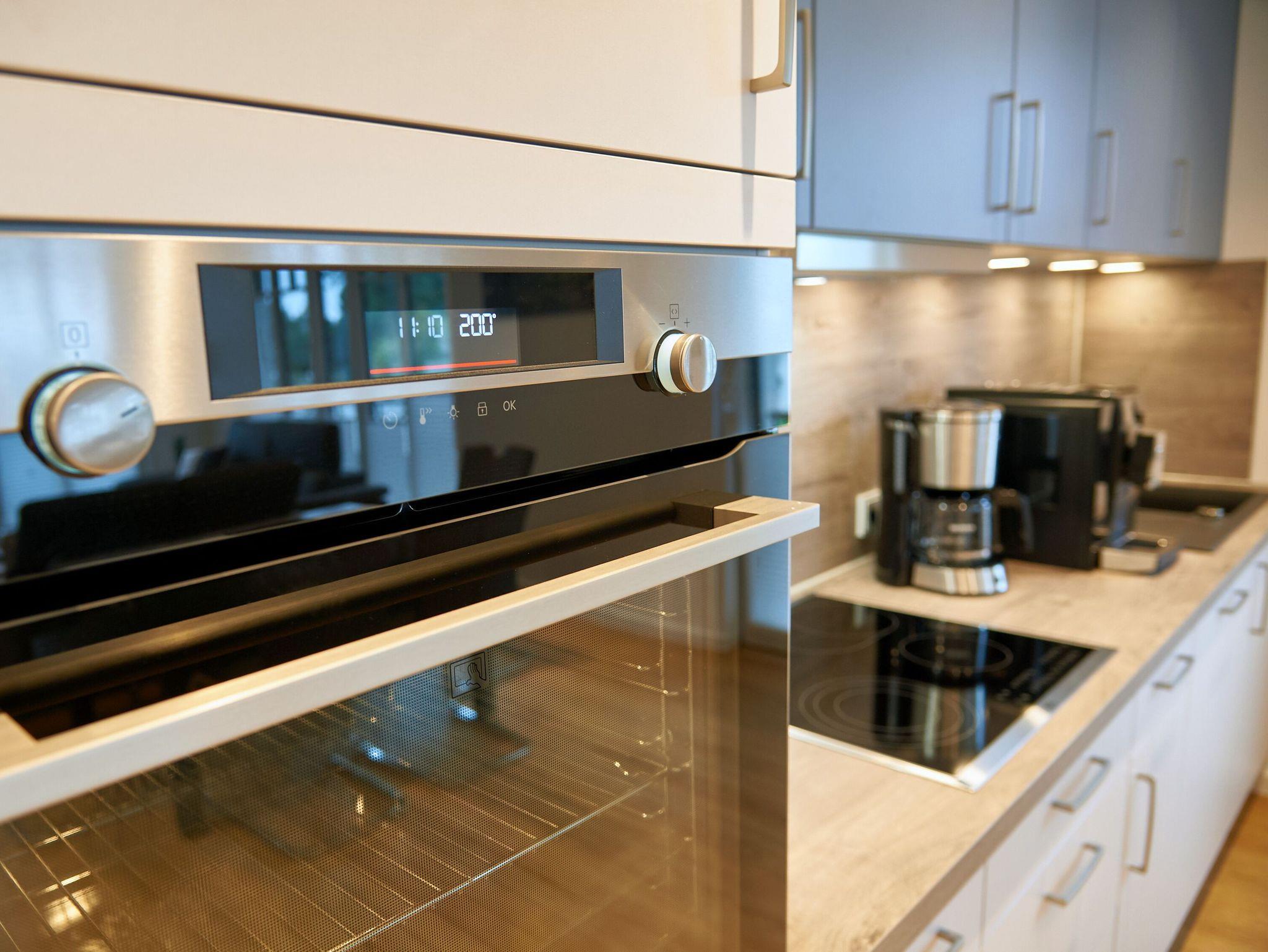 Die exklusive Einbauküche mit Markengeräten von Liebherr, Bosch, Neff, Bauknecht und WMF macht nicht nur optisch etwas her, sondern wartet förmlich darauf, dass Sie Ihren Kochkünsten freien Lauf lassen. Der 4-Zonen-Ceranherd mit Dunstabzugshaube, ein Raclette-Grill, ein Backofen in Komforthöhe, der Geschirrspüler, die große Kühl-/Gefrierkombi und dazu natürlich ein Wasserkocher, ein Toaster, eine Filterkaffeemaschine und sogar ein Kaffeevollautomat von JURA (inkl. Start-Ausstattung an Kaffeebohnen) machen es Ihnen leicht.