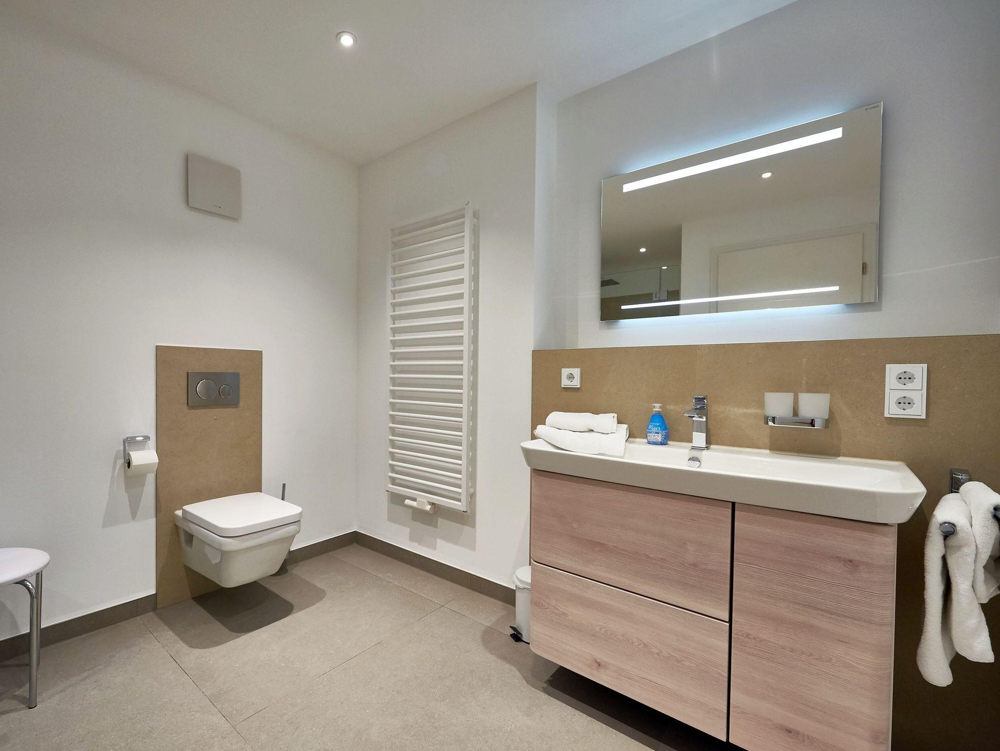 Die geräumigen Badezimmer überzeugen mit ebenerdigen Duschen, WC, beleuchteten Waschtischen mit großen Spiegeln, Fön sowie einem Handtuchwärmer. Die moderne Fußbodenheizung sorgt hier und auch in allen anderen Zimmern der Wohnung für ein angenehmes Raumklima.