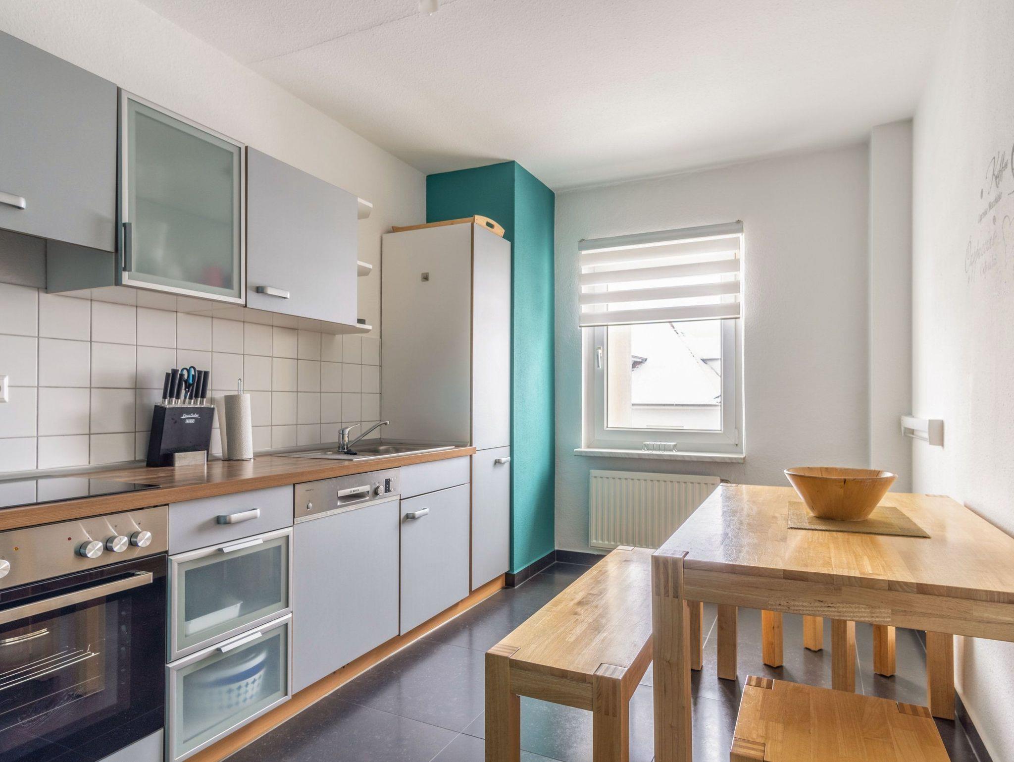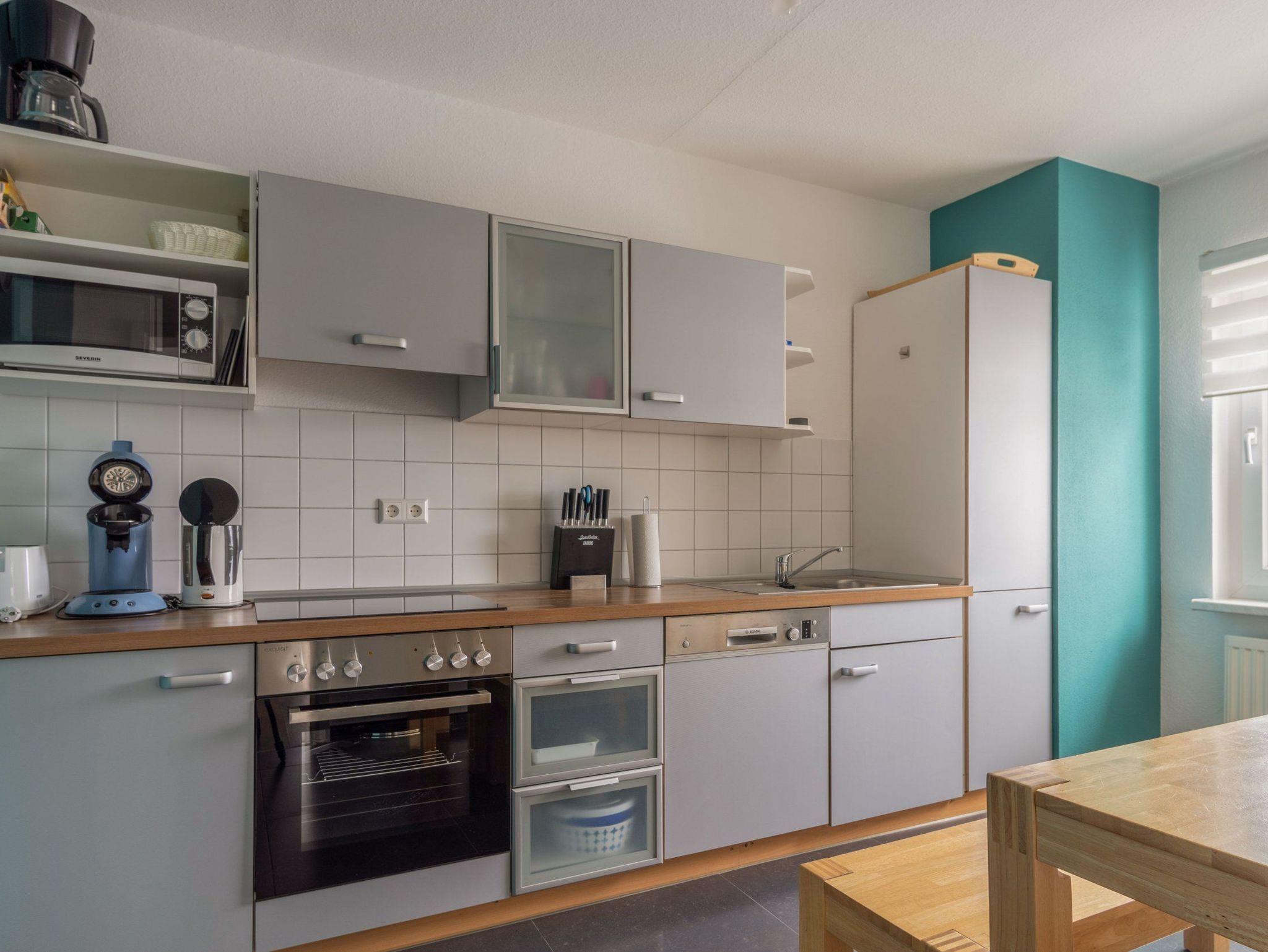 Die Küchenzeile ist mit einem Cerankochfeld mit 4 Platten, Backofen, Dunstabzugshaube, Mikrowelle, Kühlschrank mit Gefrierfach, Geschirrspüler, Elektrogeräten wie Filter-Kaffeemaschine, Senseo-Pad-Kaffeemaschine, Toaster, Wasserkocher und natürlich mit allem notwendigen Geschirr, Besteck und Gläser ausgestattet. Ebenso befindet sich ein Leifheit-Wandwäschetrockner und ein Staubsauger in der Küche.