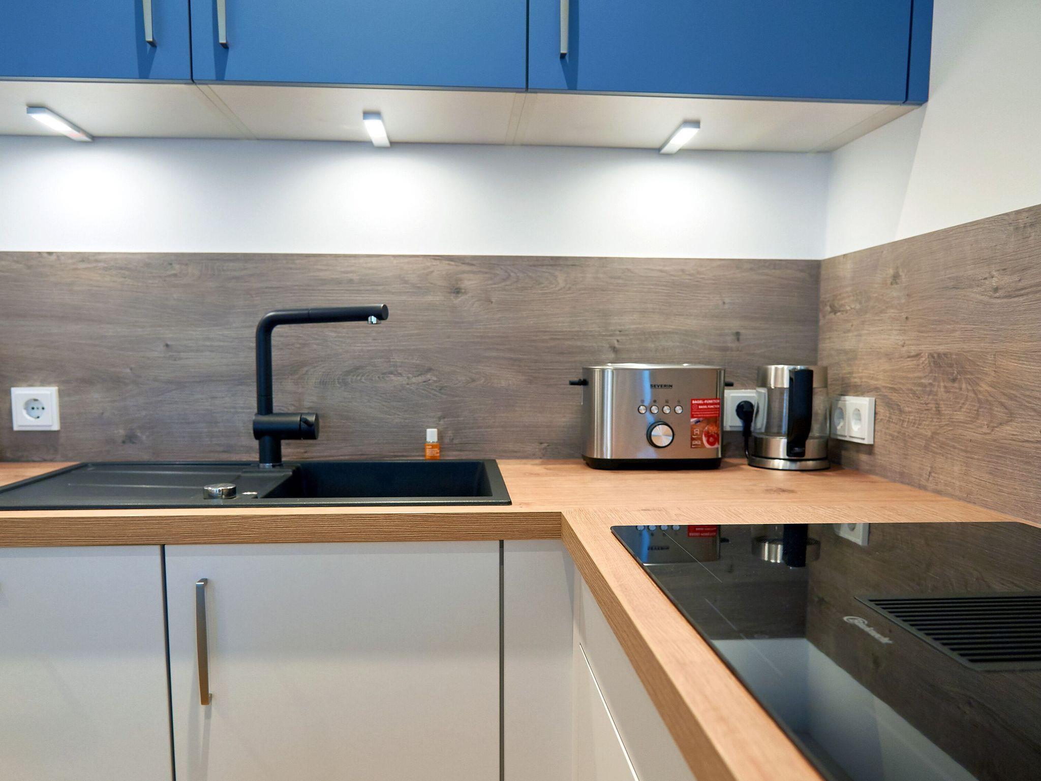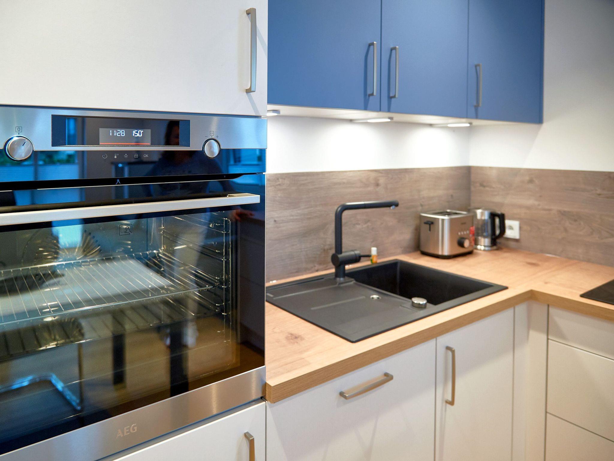 Die exklusive Einbauküche mit Markengeräten von Liebherr, Neff, Bosch, WMF und Bauknecht macht nicht nur optisch etwas her, sondern wartet förmlich darauf, dass Sie Ihren Kochkünsten freien Lauf lassen. Dazu stehen Ihnen u.a. ein 4-Zonen-Ceranherd mit integriertem Dunstabzug, ein Backofen, ein Geschirrspüler, eine große Kühl-/Gefrierkombi, ein Raclette-Grill sowie natürlich Wasserkocher, Toaster, eine Filterkaffeemaschine und eine extra Kaffee-Kapselmaschine zur Verfügung. Speisen können Sie wahlweise am großen Esstisch oder draußen auf der Terrasse in der frischen Ostseeluft. Wenn Sie sich stattdessen lieber in einem Restaurant oder Café verwöhnen lassen wollen, haben Sie in fußläufiger Entfernung genügend Auswahl.