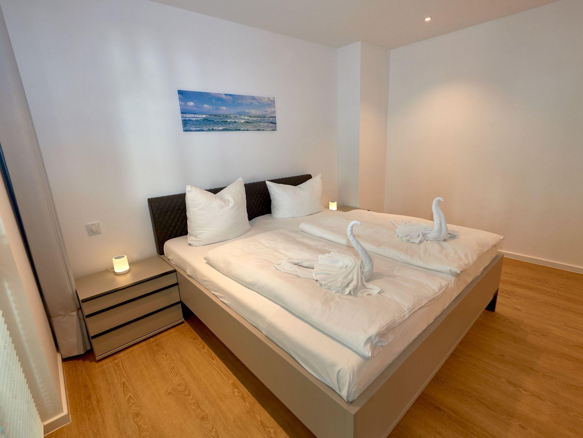 Im Schlafzimmer mit großem Kleiderschrank für Ihre Urlaubsgarderobe und einem zweiten Fernsehgerät verspricht ein herrlich bequemes Boxspringbett (1,80 x 2,00 m) süße Träume. Als besonderer Clou entpuppen sich die beiden Nachttischlampen. Diese dienen nämlich nicht nur der stimmungsvollen Beleuchtung, sondern können über Bluetooth auch die eigene Playlist oder das Lieblingshörbuch abspielen.