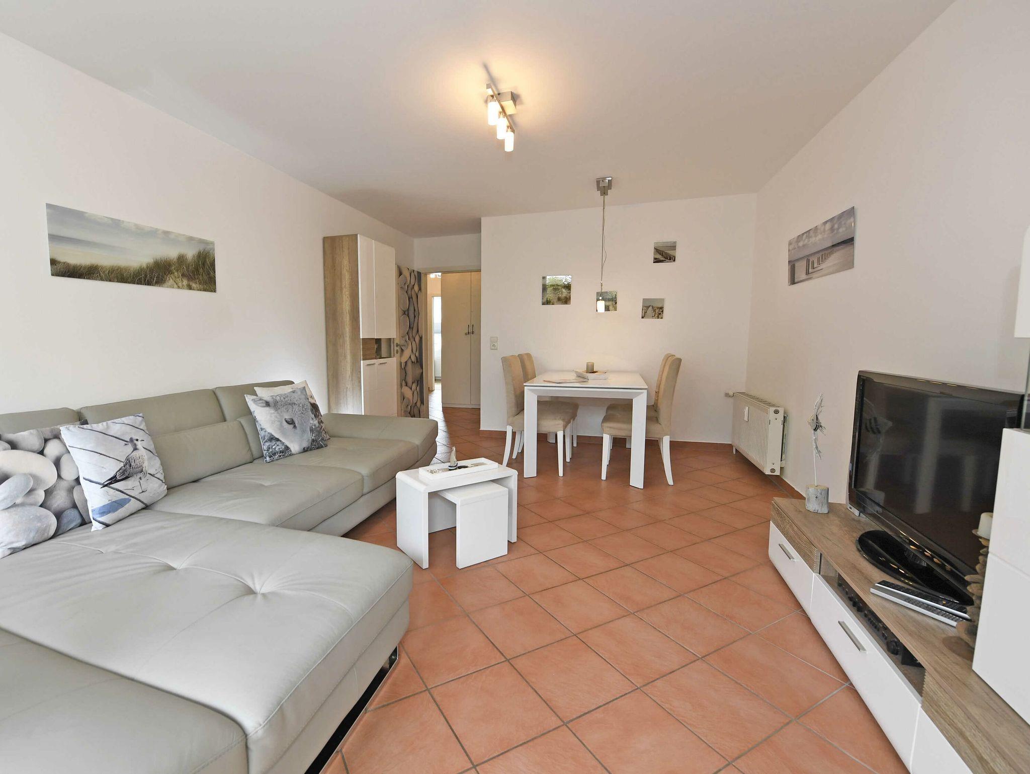 Wohnung Seedorf: Dieses ca. 62 m² große, komfortabel und exklusiv eingerichtete 3-Raum-Appartement erwartet Sie im Erdgeschoss. Vom Eingangsbereich aus gelangen Sie über einen Flur in das große und modern eingerichtete Wohnzimmer mit wunderschönem Erker. Der Wohnraum ist ausgestattet mit einer Eckcouchgarnitur, großem Flachbild-TV, einem DVD-Player, einem Radio mit Dockingstation und WLAN sowie einem Esstisch für 4 Personen. Dem Wohnzimmer vorgelagert ist eine kleine, möblierte Terrasse.