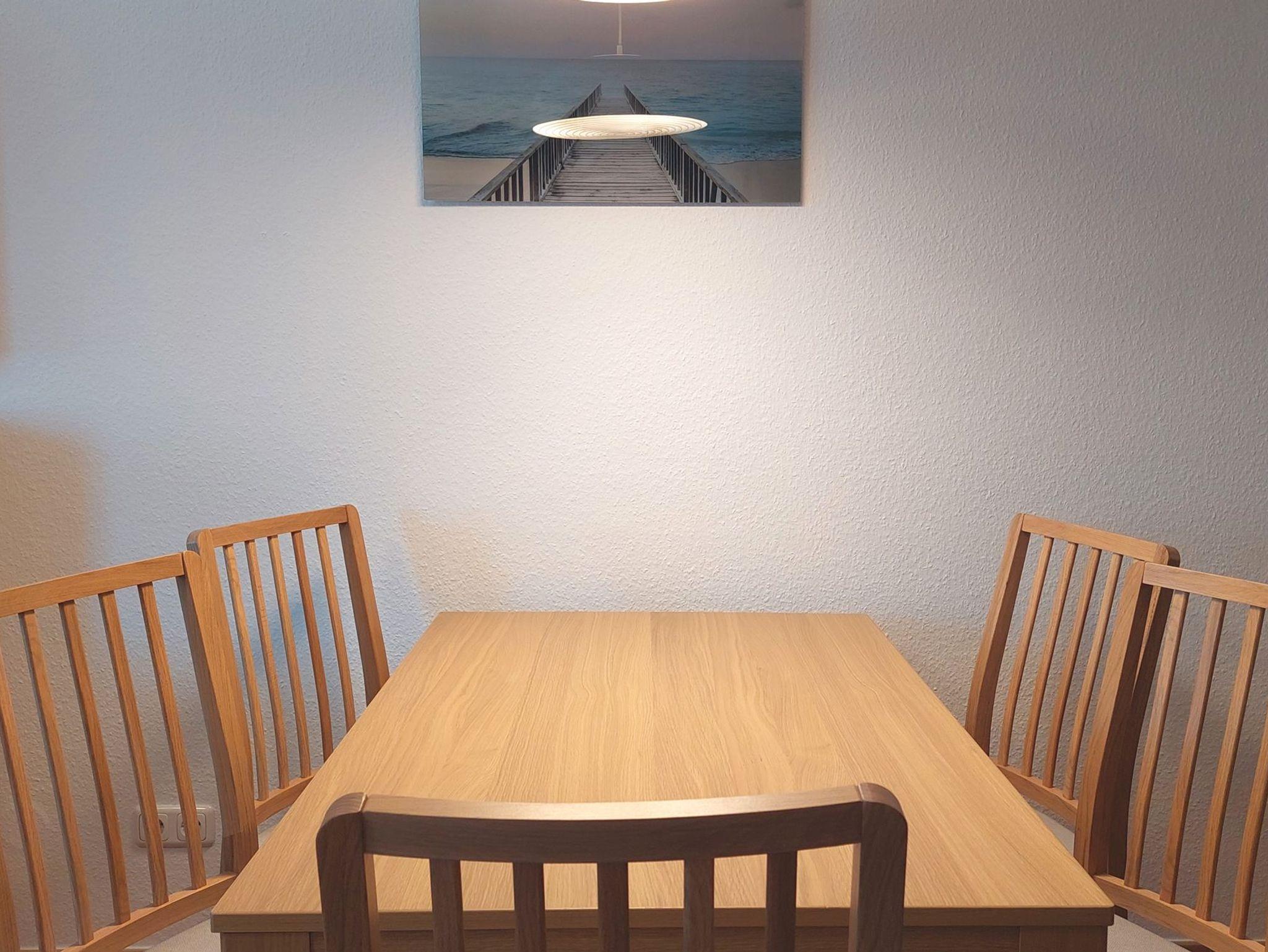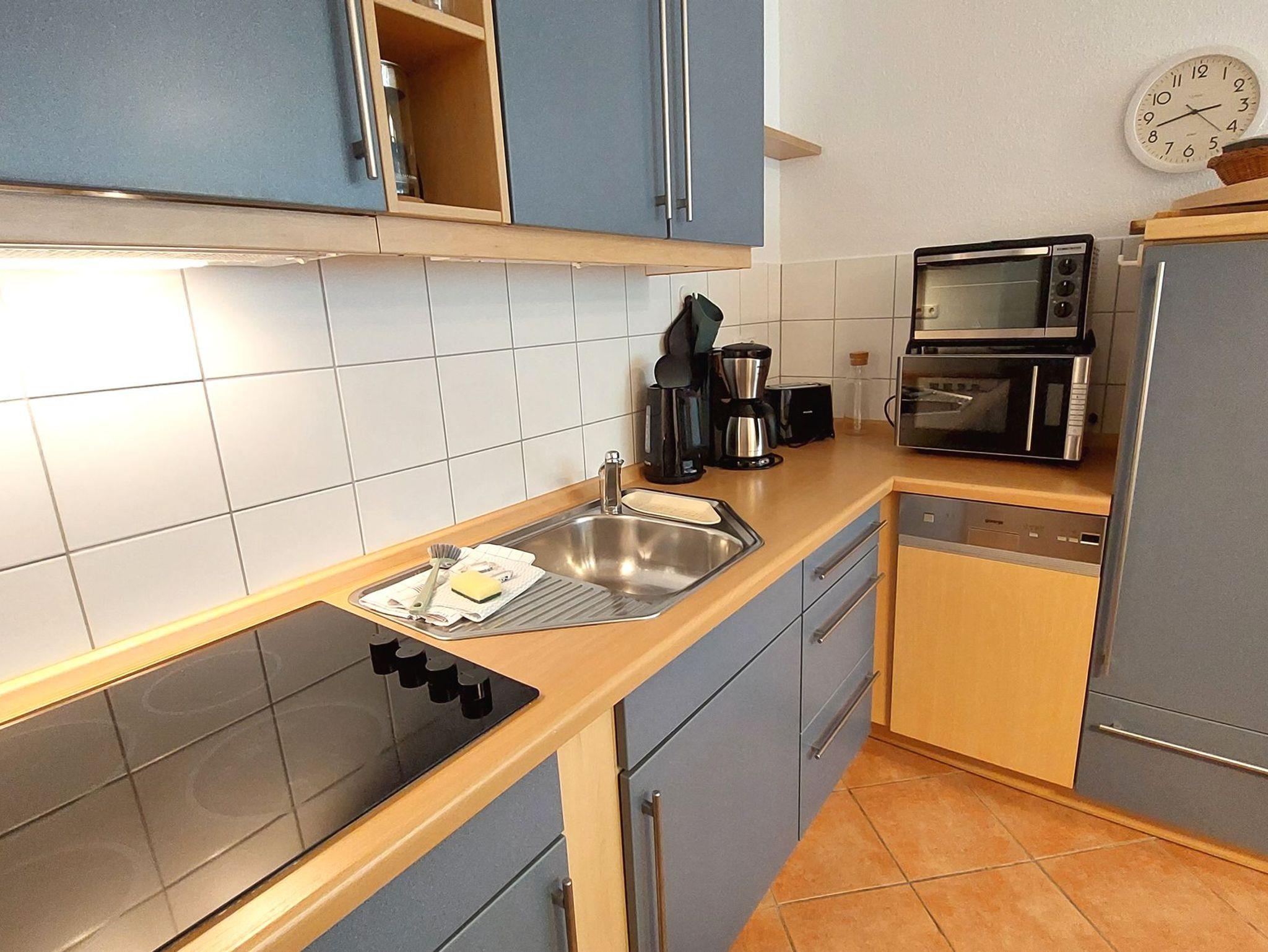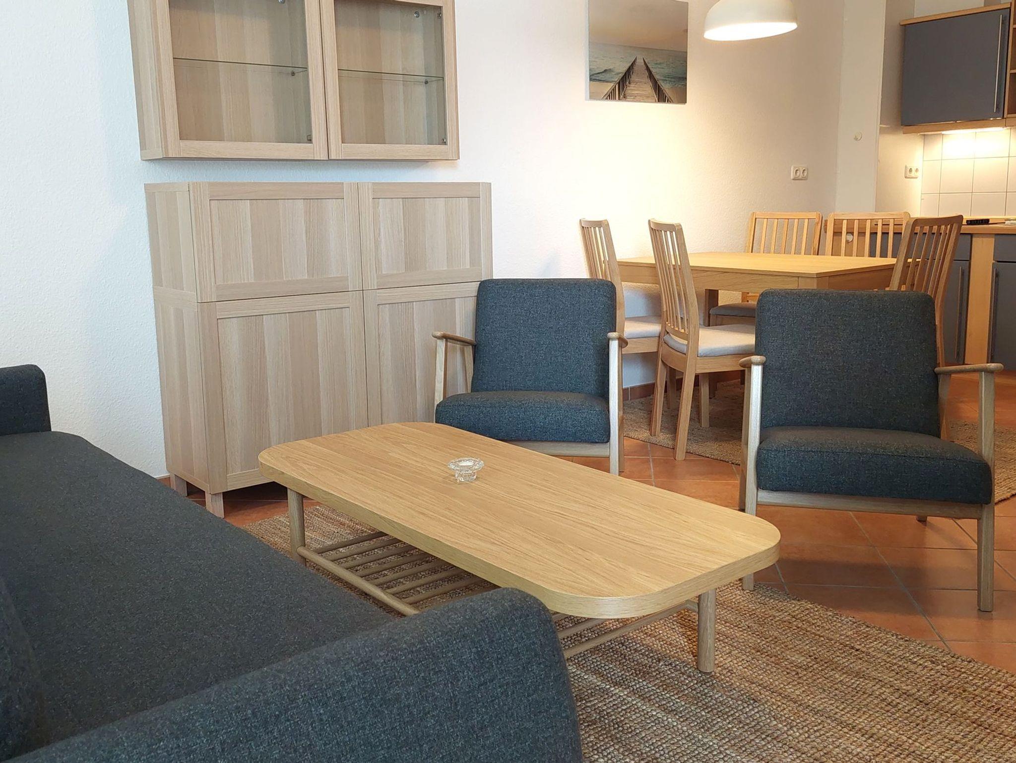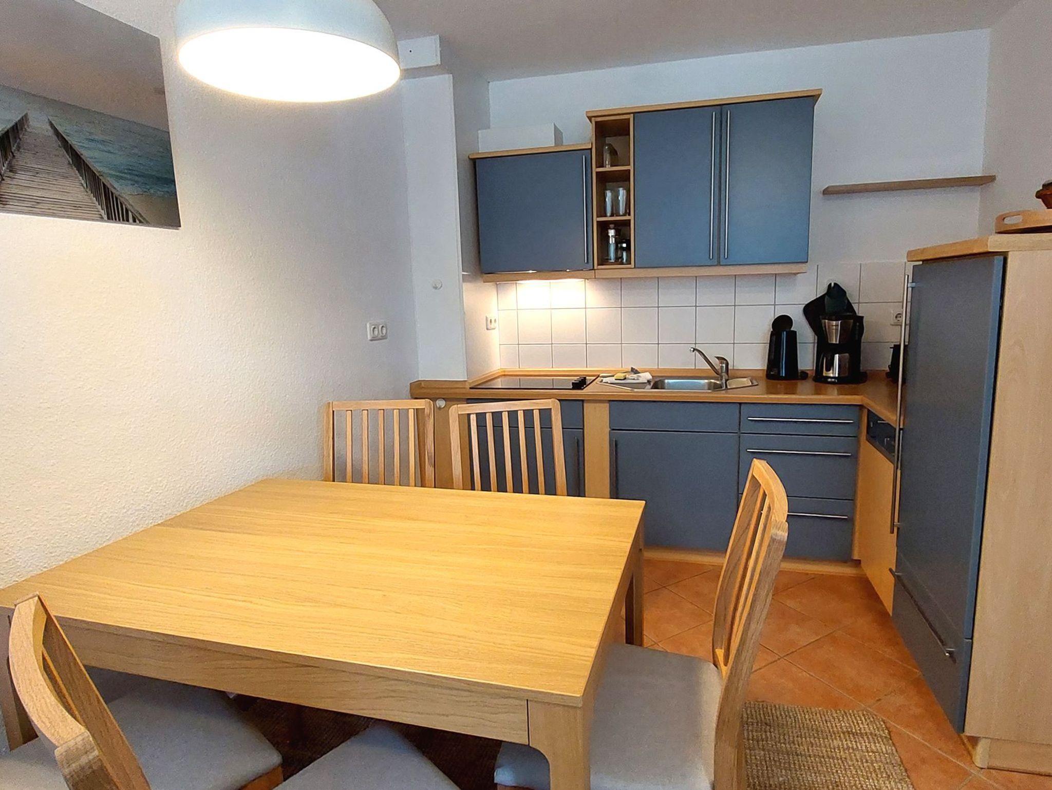 Es gibt einen Essbereich für 5 Personen sowie eine moderne Küchenzeile mit allen Möglichkeiten sich im Urlaub selbst zu verpflegen.