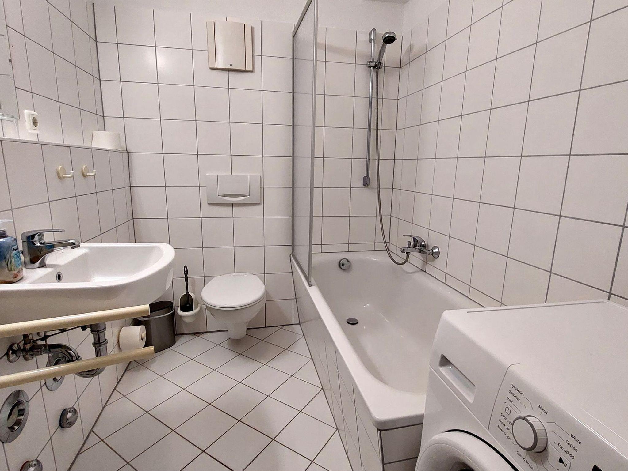 Das helle Badezimmer bietet eine Badewanne (mit Duschfunktion), WC, Waschtisch sowie eine eigene Waschmaschine.