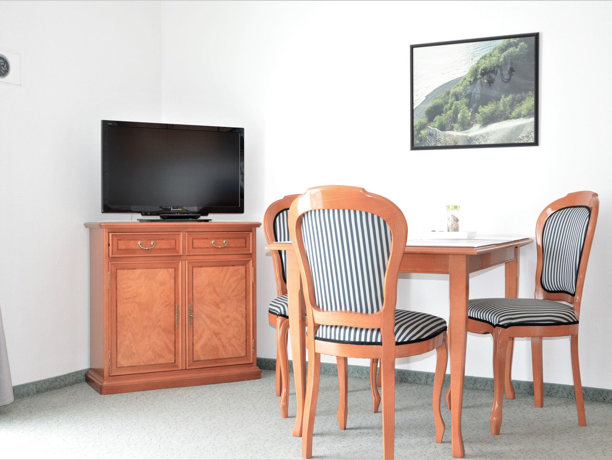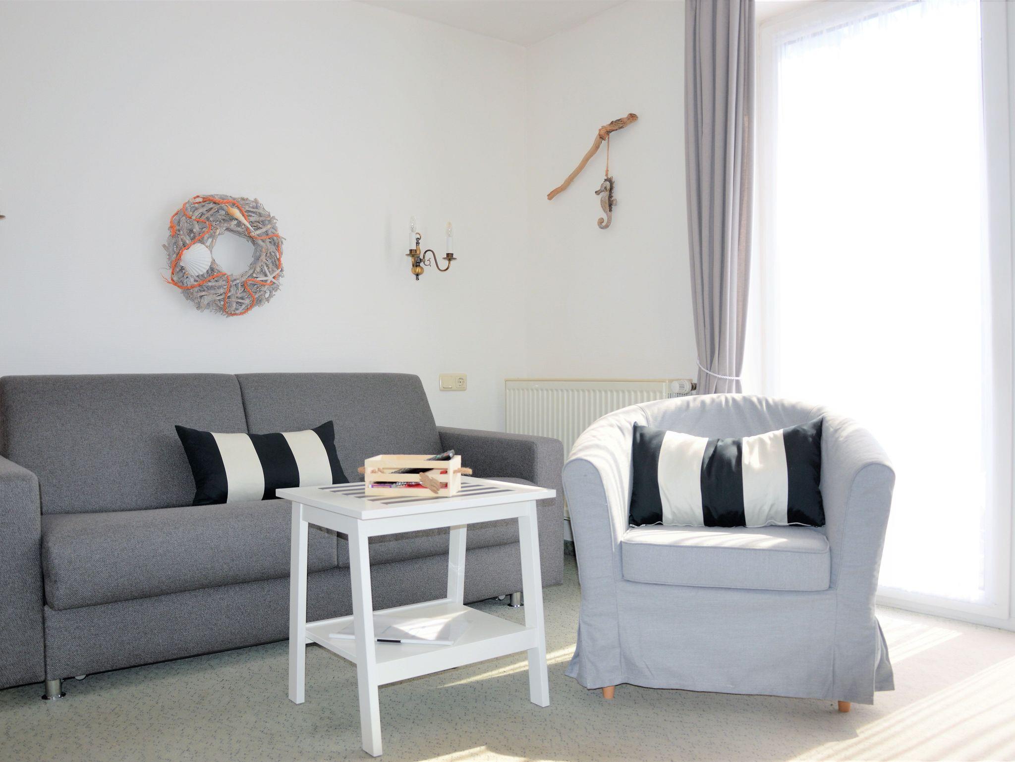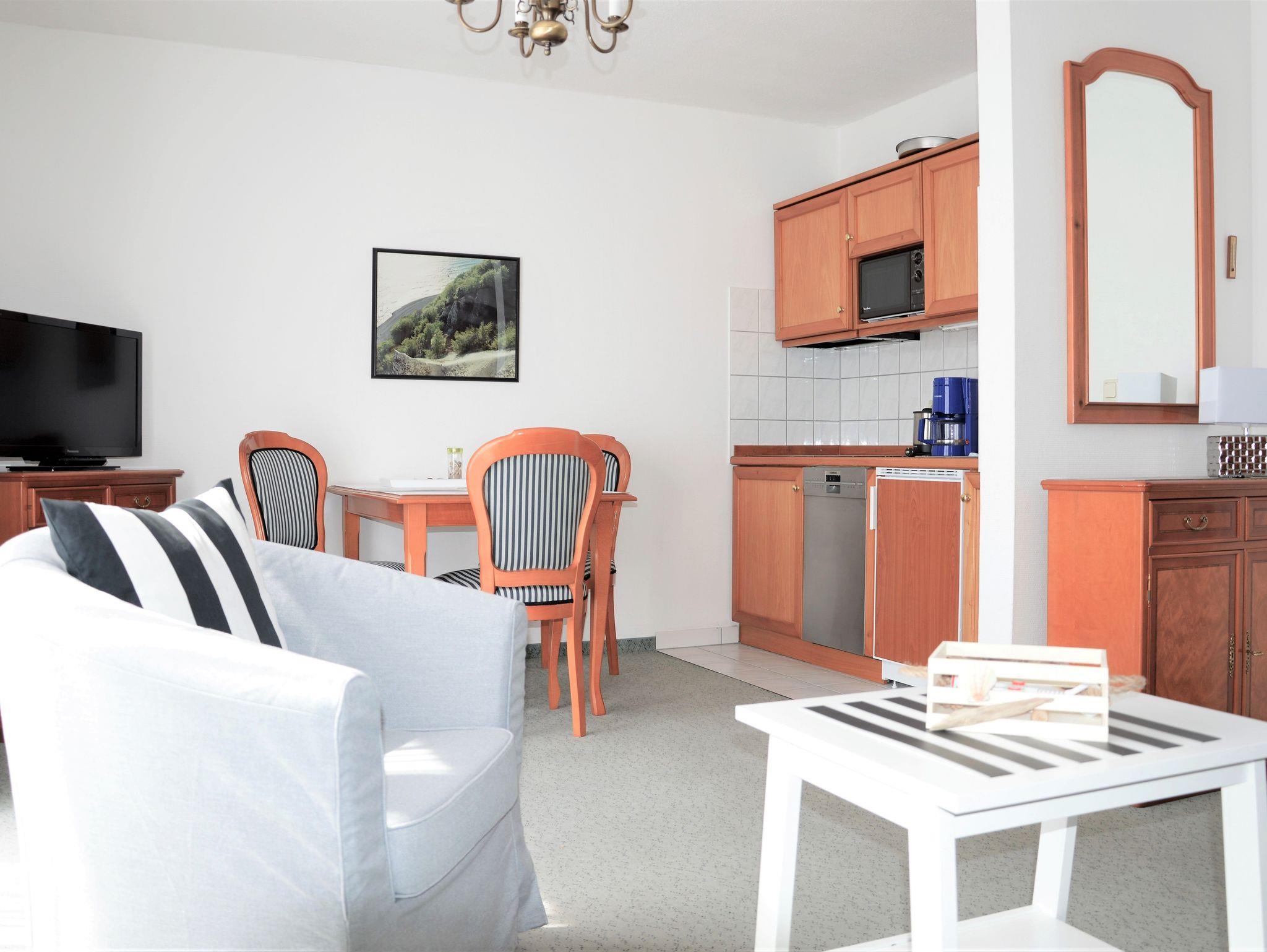 Das Apartment im 2. Obergeschoss mit 45m² befindet sich in der Apartment-Villa Steinfurth, welche direkt am Meer liegt und bietet Platz für 2 Personen. Vom Wohnraum aus erreicht man einen möblierten Balkon in Südostausrichtung, von hier aus kann man das Meer sehen. Der helle, große Wohnbereich mit Küchenzeile, Essplatz und TV ist gemütlich und klassisch möbliert. Die Küchenzeile ist ausgestattet mit 4-Platten-Cerankochfeld, Mikrowelle, Geschirrspüler, Kühlschrank, Kaffeemaschine, Wasserkocher und Toaster. Das Schlafzimmer verfügt über ein Doppellbett mit einer Liegefläche von 180 x 200 cm. Ein Duschbad mit WC und Haartrockner ist ebenfalls vorhanden.