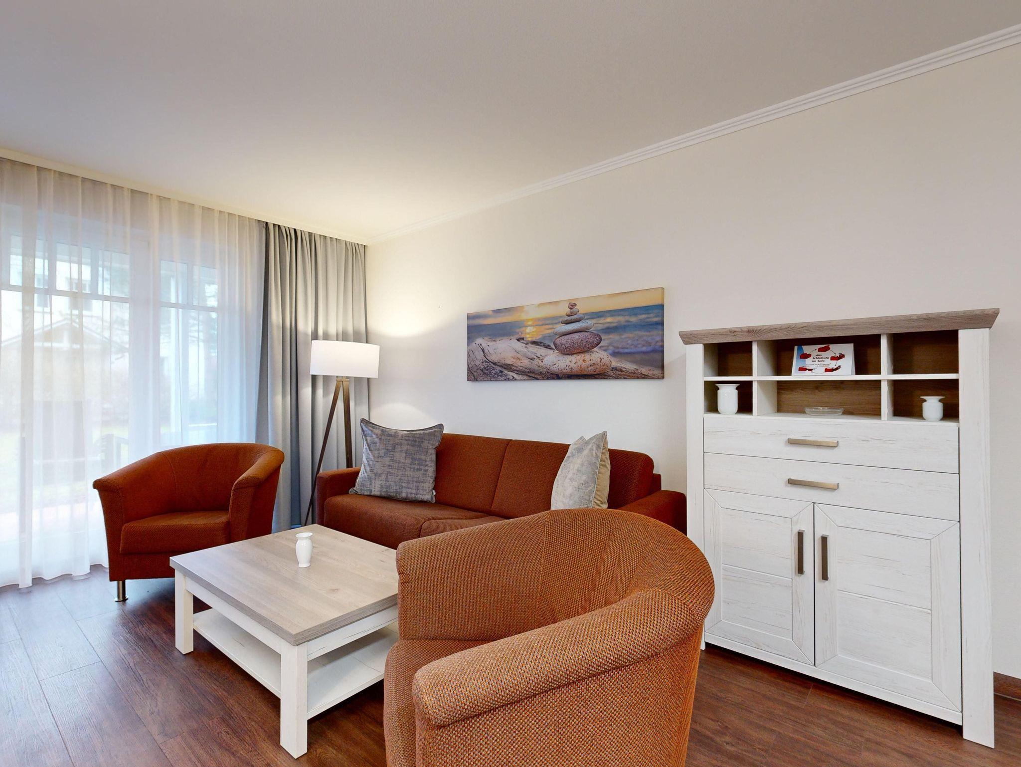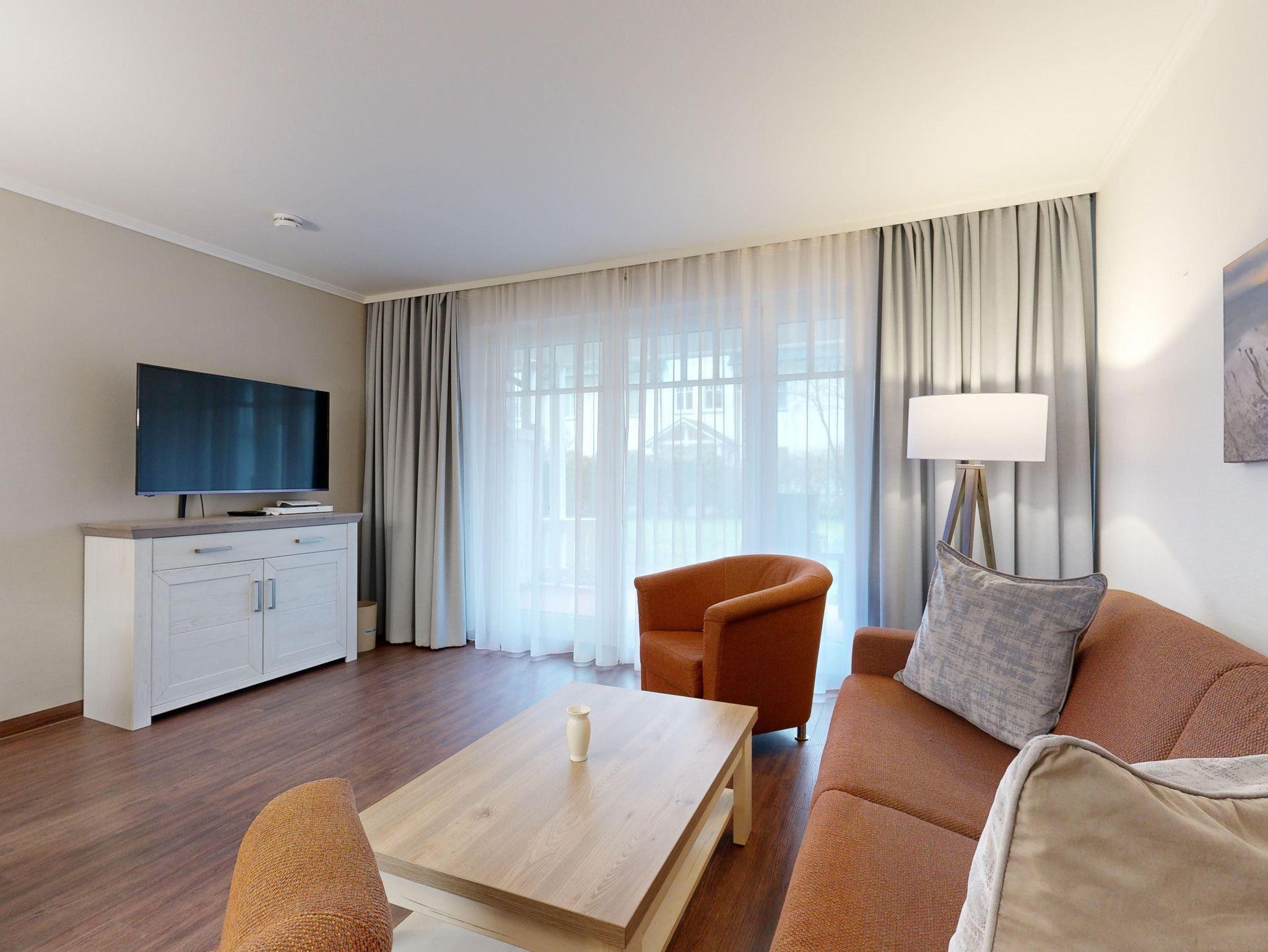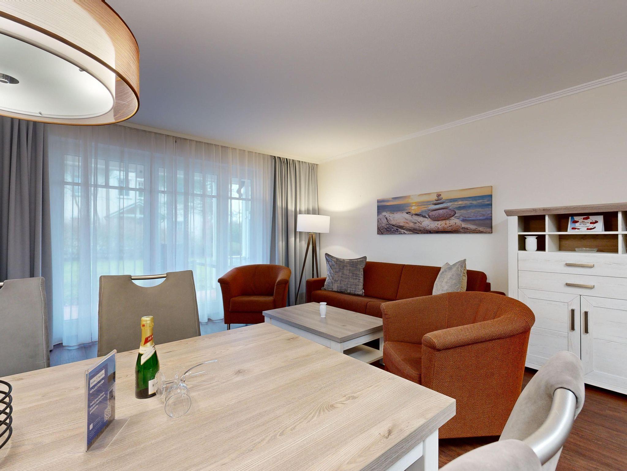 Im Dünenpark Binz befindet sich im Haus 21 die großzügige Komfort-Ferienwohnung im Erdgeschoss (2 Zimmer / 61 m²) mit 1 Schlafzimmer, einer Schlafcouch und mit großer Terrasse