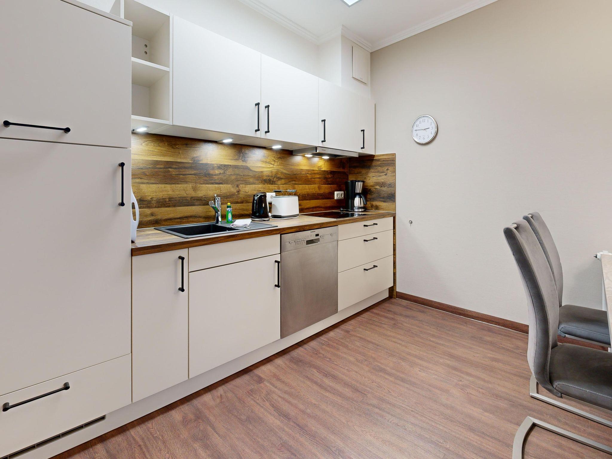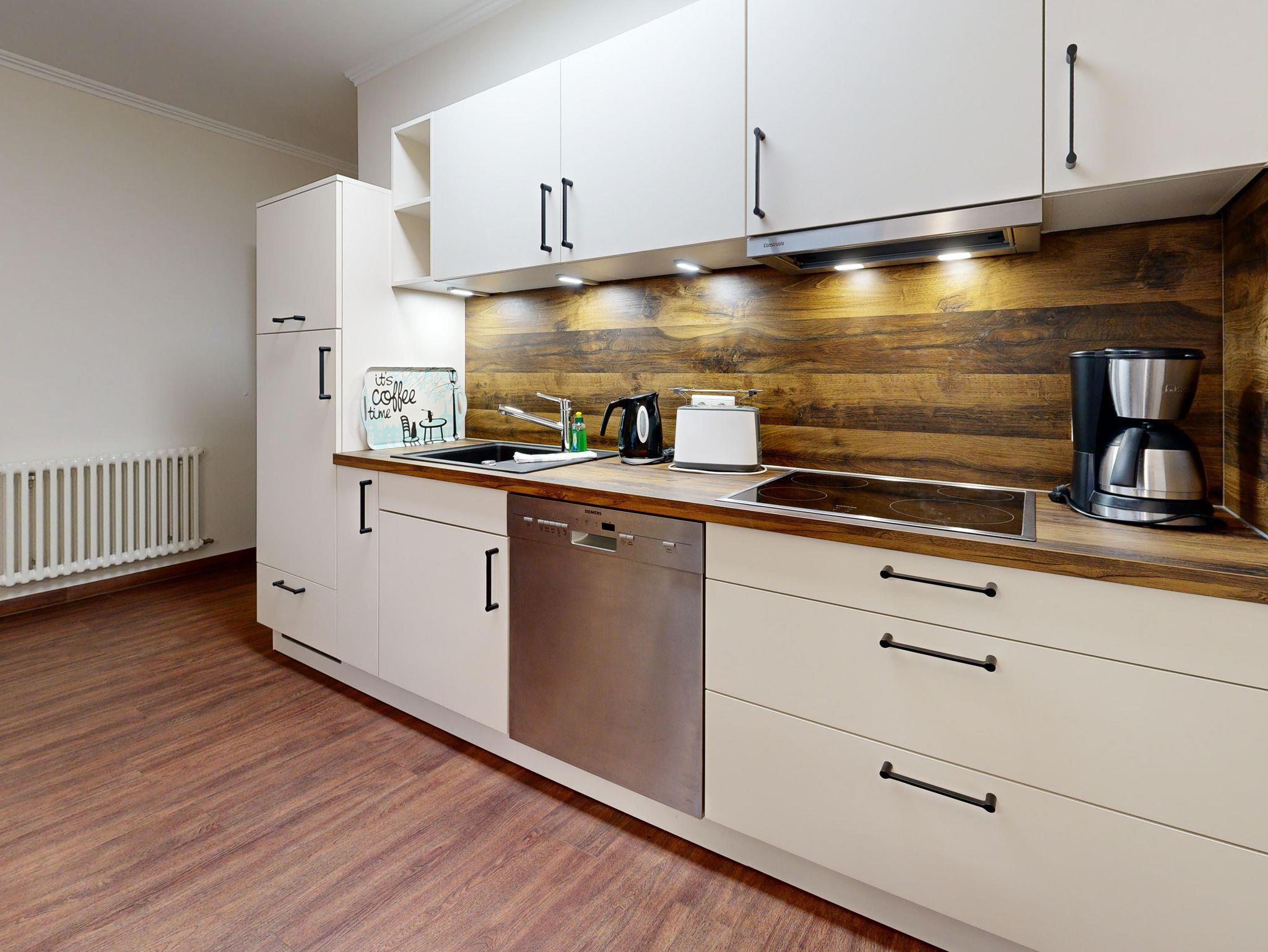 Küche: Moderne Küchenzeile, Ceran-Herd, Mikrowelle mit Back- und Grillfunktion, Spülmaschine, Kühlschrank mit Gefrierfach, Kaffeemaschine, Toaster, Wasserkocher