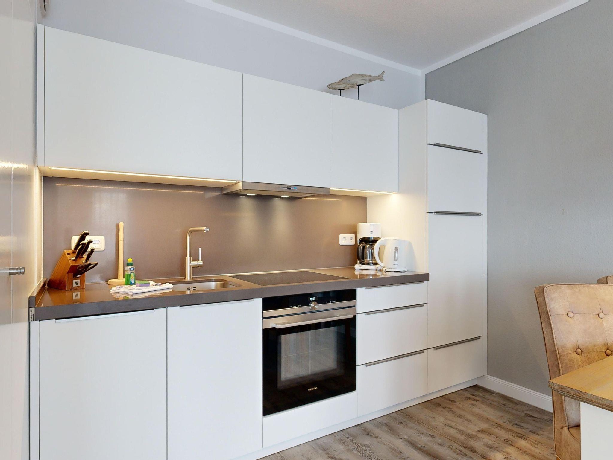 Küche mit Ceranfeld, Kühlschrank mit Gefrierfach, Backofen mit integrierter Mikrowelle, Spülmaschine, Toaster, Wasserkocher, Kaffeemaschine
