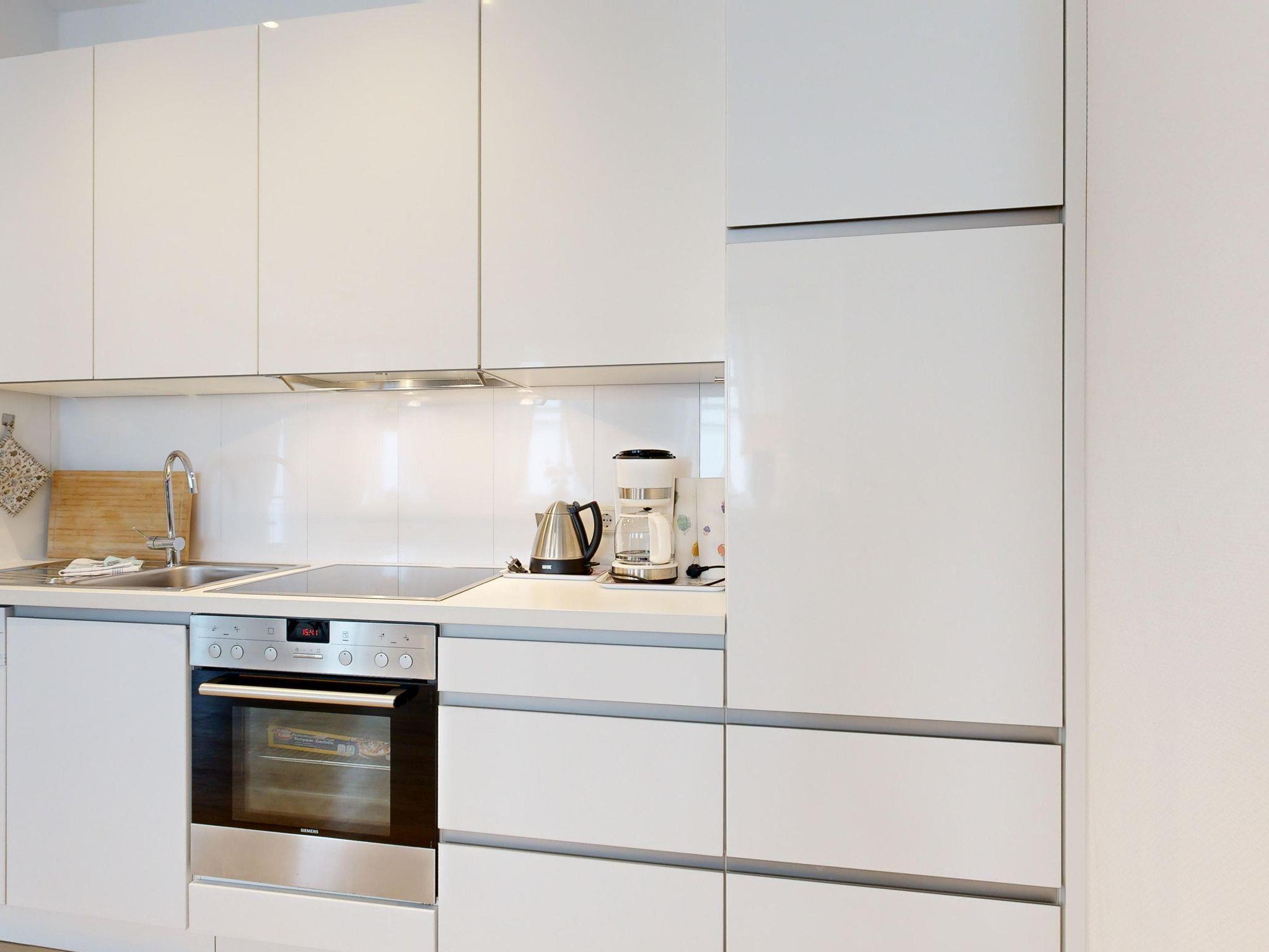 * Küche: Moderne Küchenzeile, E-Herd mit Backofen, Spülmaschine und Nespresso-Maschine, Wasserkocher, Toaster