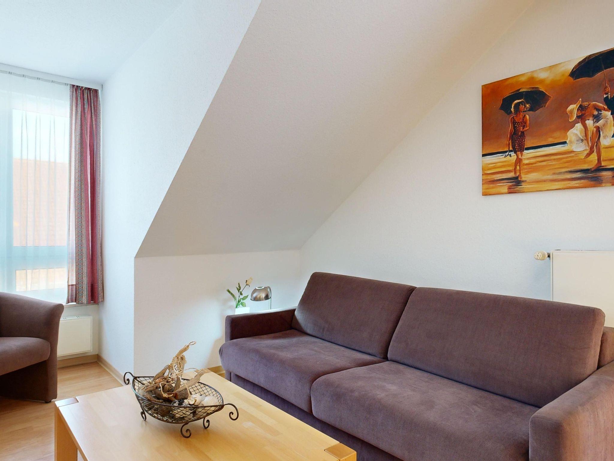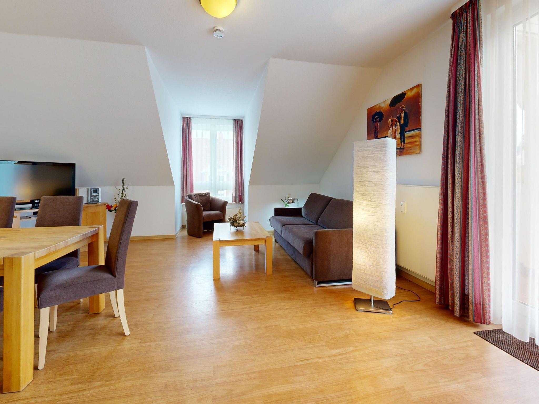 Wohnzimmer: Couchgarnitur (Schlafgelegenheit für 2 Personen), Kabel-TV, Stereoanlage, Internetanschluss (WLAN), Esstisch