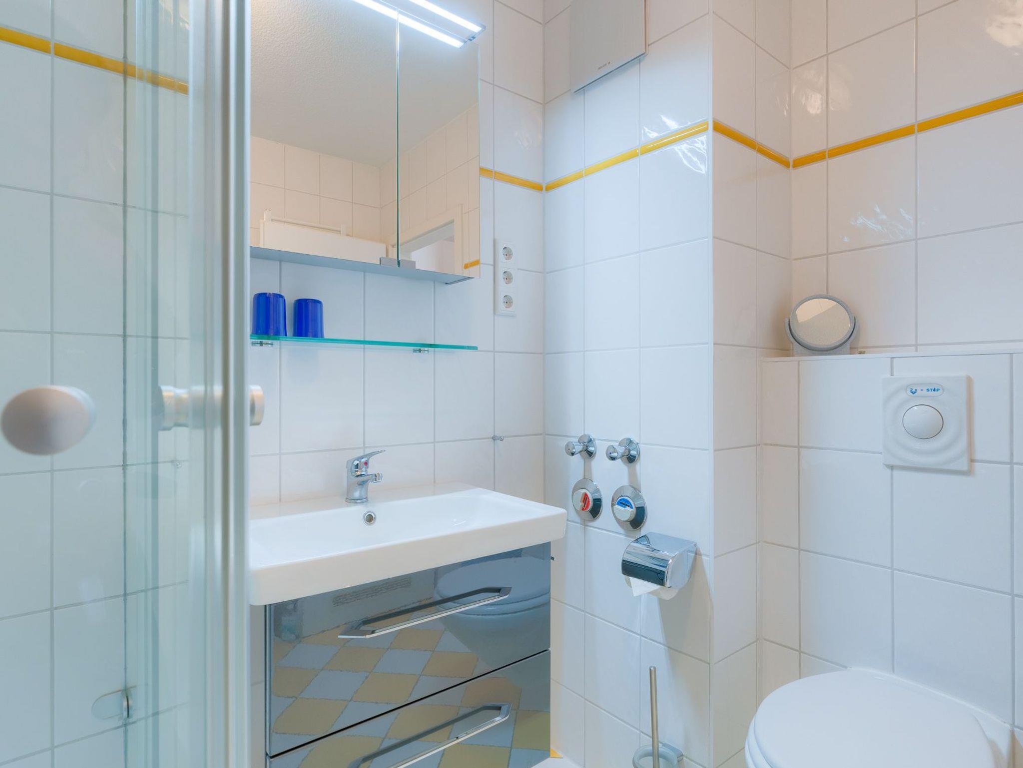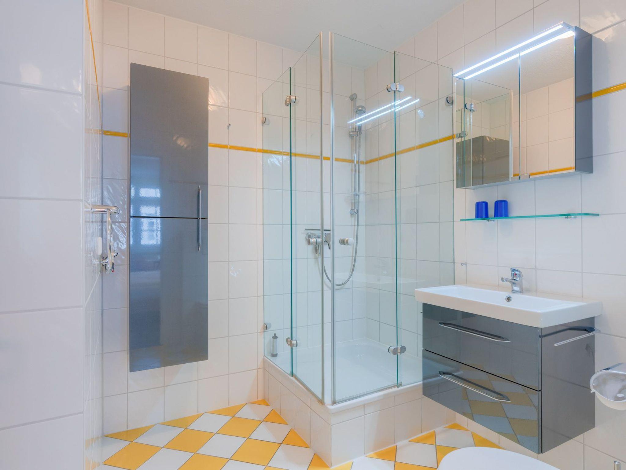 Das Badezimmer ist mit einer Dusche, WC und einem Handtuchheizkörper ausgestattet. In den Schränken haben Sie genügend Stauraum für Ihre Wasch- und Kosmetikutensilien.