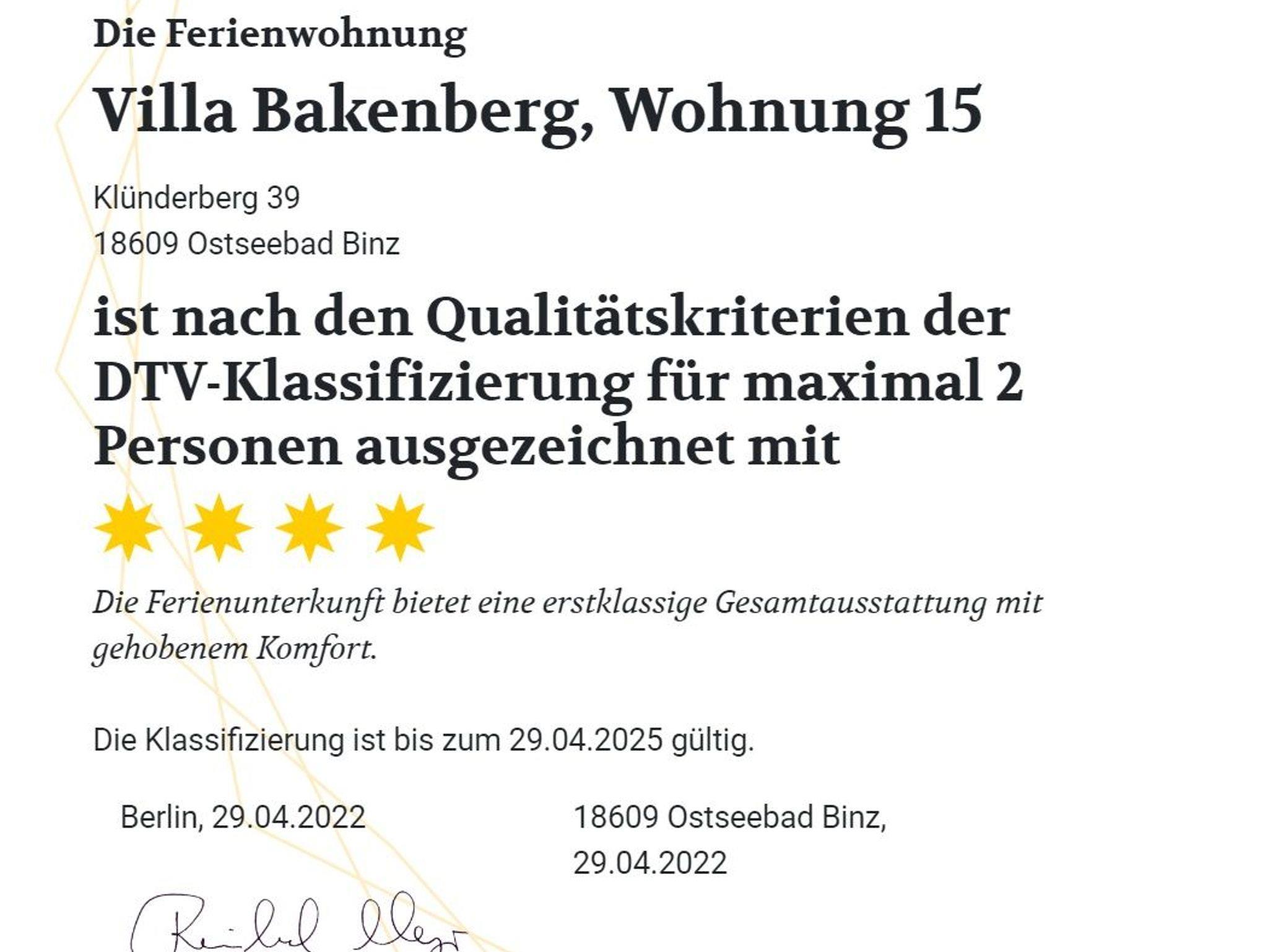 Die 48 m ² große und mit 4 DTV Sternen klassifizierte Ferienwohnung 15 befindet sich im 1. Obergeschoss in der Villa Bakenberg. Sie bietet mit ihren zwei Zimmern ausreichend Platz für 2 Personen. (2 weitere Personen sind zusätzlich möglich)