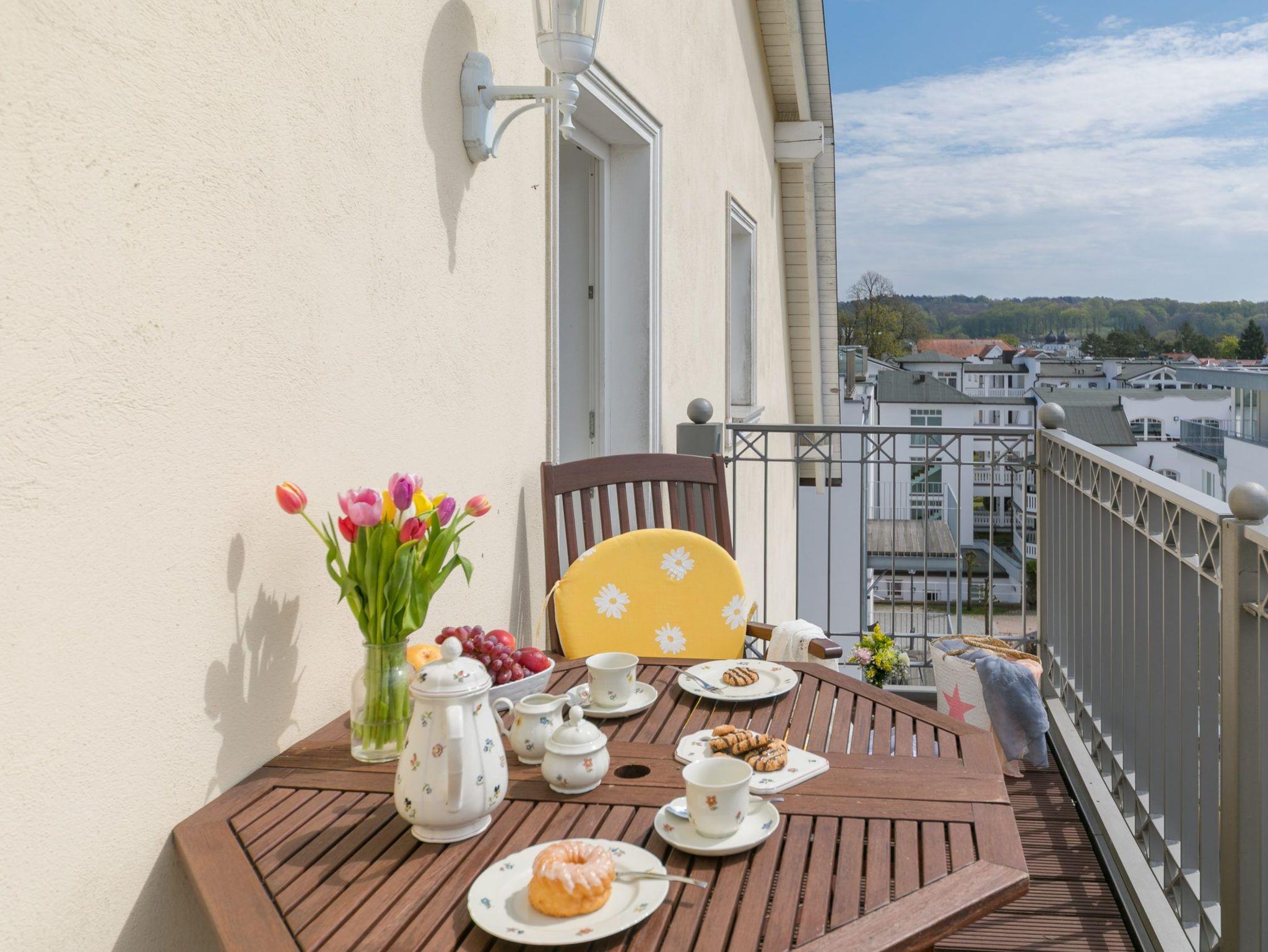 Der Südbalkon, von dem Sie ab mittags die Sonne genießen können, bietet eine schöne Aussicht über die Dächer von Binz.