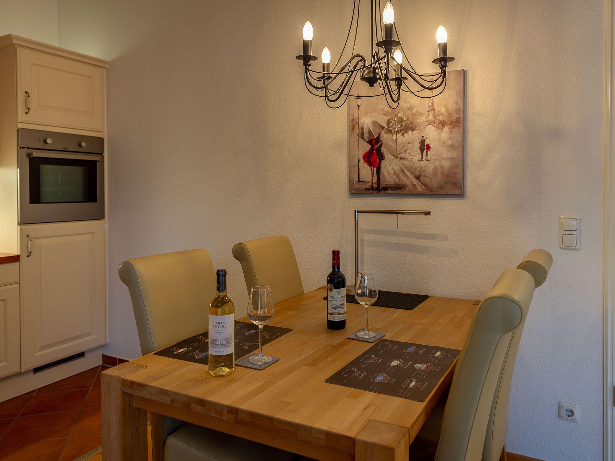 Herzstück Ihres Zuhauses auf Zeit ist das kombinierte Wohn- und Esszimmer mit integrierter Landhaus-Küche und vorgelagertem Balkon. Zur Ausstattung zählen hier u.a. ein Flachbild-TV, kostenfreies W-LAN und eine bequeme Couch. Die offene Küche ist komplett ausgestattet und verfügt u.a. über einen Ceranherd, einen Backofen, eine Geschirrspülmaschine, eine Mikrowelle, einen Kühlschrank sowie Kaffeemaschine, Wasserkocher, Toaster, Stabmixer usw. Speisen können Sie ganz nach Belieben am großen Esstisch im Wohnzimmer oder auch draußen auf dem überdachten Balkon in der frischen Ostseeluft.