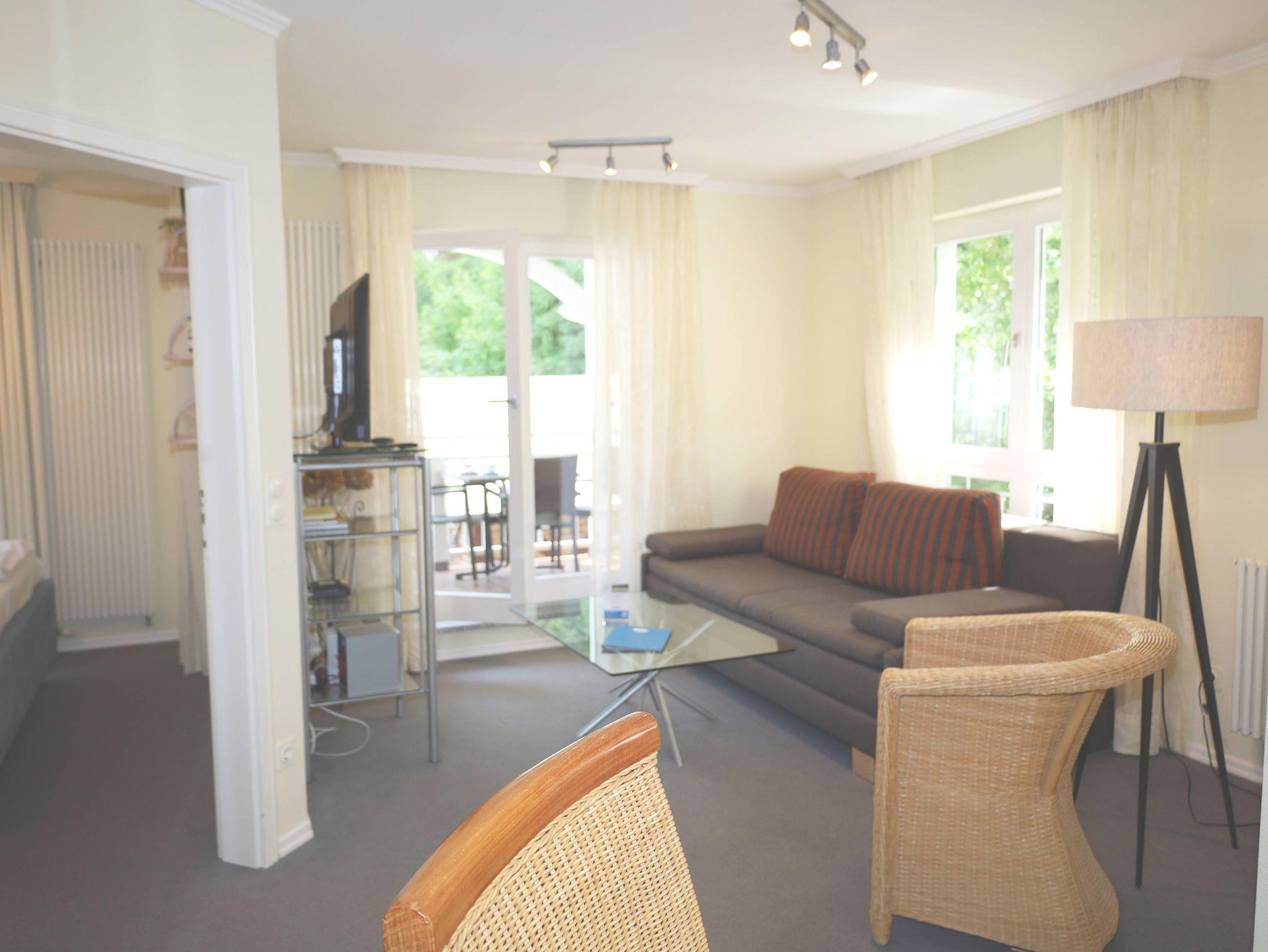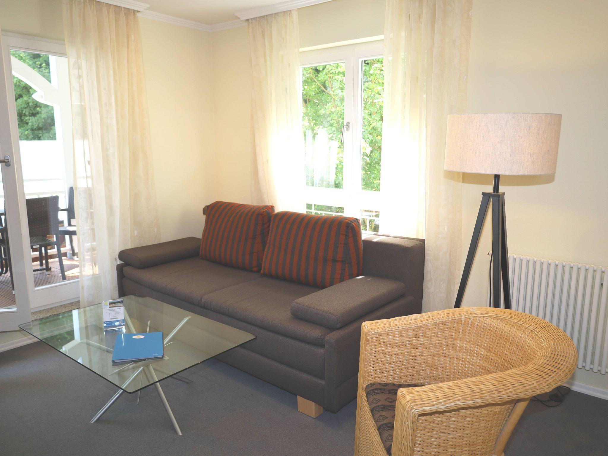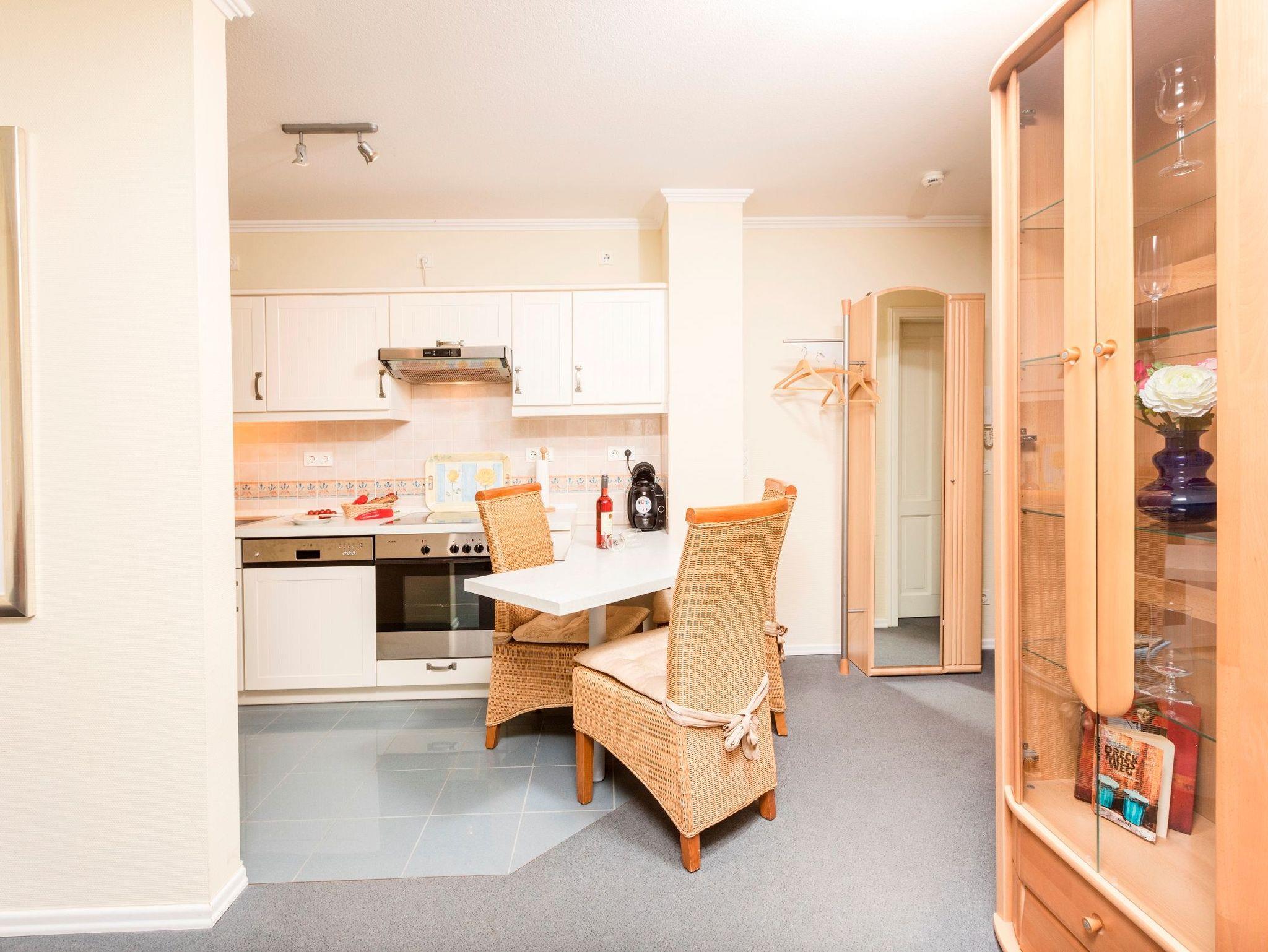 Das 2-Raum-Apartment befindet sich im 1. Obergeschoss und ist eine Nichtraucher- und Haustierfreie Wohnung. Die Wohnung ist ca. 40 m² und verfügt über einen möbilierten Balkon mit seitlichem Ostseeblick. Das Wohnzimmer verfügt über einen Flachbildschirm-TV und eine Stereoanlage mit CD-Player sowie einer Schlafcouch. Die Küchenzeile ist ausgestattet mit einen Backofen mit Ceranfeld, Geschirrspüler, Kühlschrank, Kaffeemaschine, Toaster, Wasserkocher. Im Schlafzimmer befindet sich ein Doppelbett und ein grosser Kleiderschrank. Badezimmer mit Eckdusche, WC und Fön. In den Sommermonaten steht Ihnen ein Strandkorb zur Verfügung. Ein PKW-Stellplatz gehört kostenfrei zum Apartment dazu. W-Lan ist ebenfalls vorhanden.