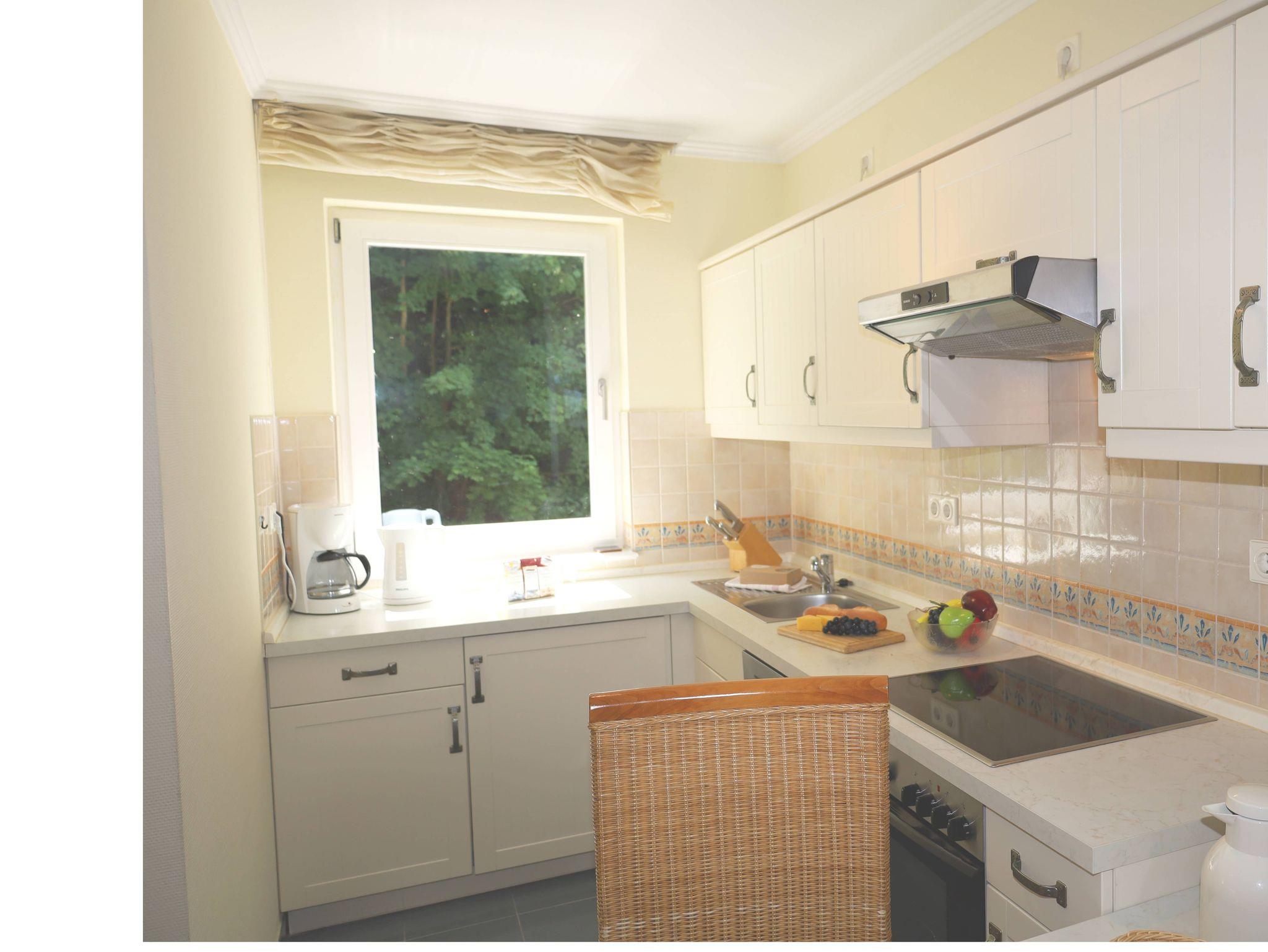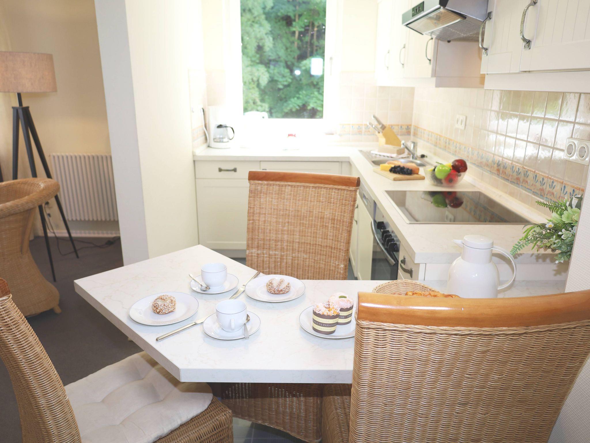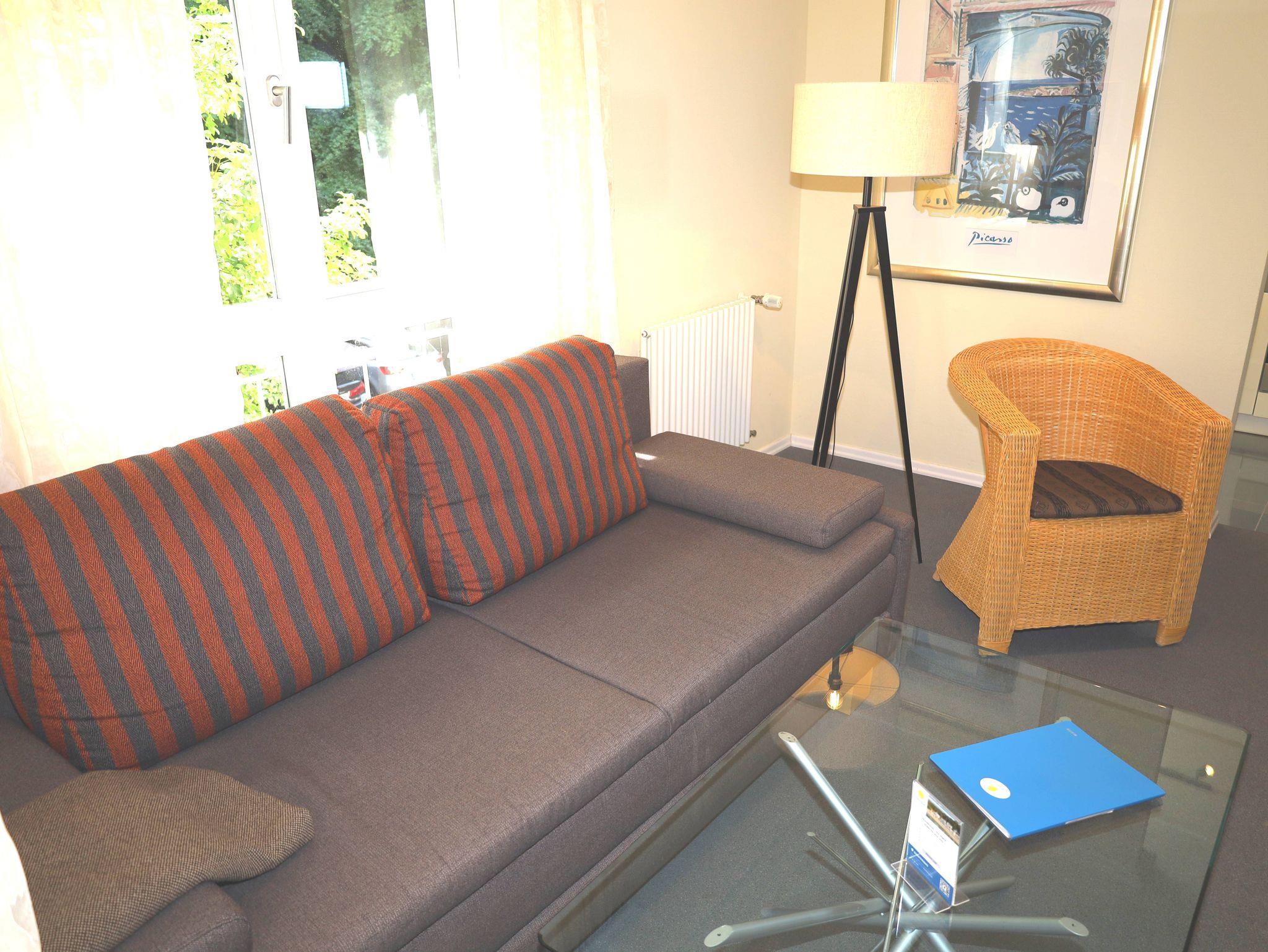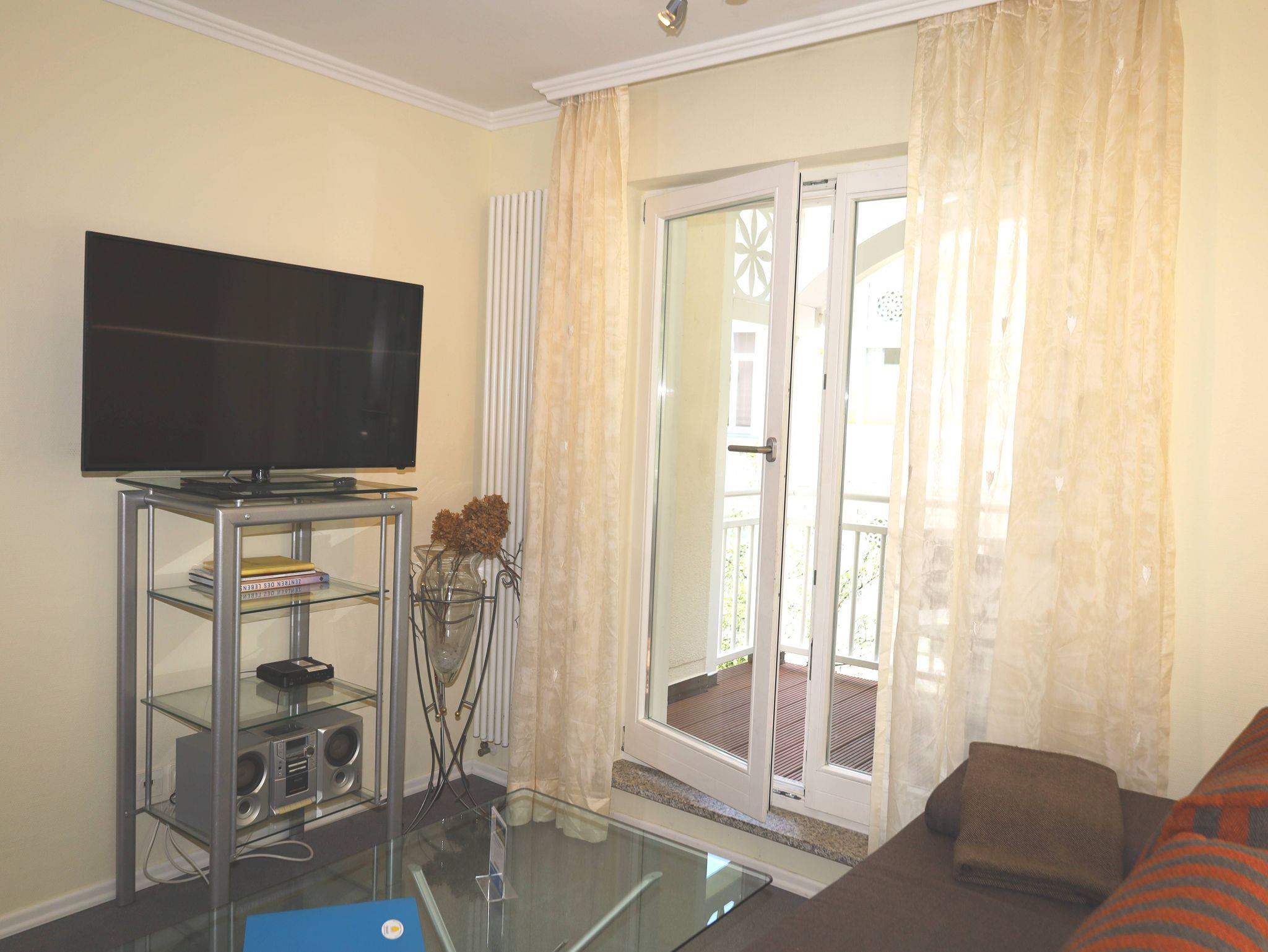 Das 2-Raum-Apartment befindet sich im 1. Obergeschoss und ist eine Nichtraucher- und Haustierfreie Wohnung. Die Wohnung ist ca. 40 m² und verfügt über einen möbilierten Balkon mit seitlichem Ostseeblick. Das Wohnzimmer verfügt über einen Flachbildschirm-TV und eine Stereoanlage mit CD-Player sowie einer Schlafcouch. Die Küchenzeile ist ausgestattet mit einen Backofen mit Ceranfeld, Geschirrspüler, Kühlschrank, Kaffeemaschine, Toaster, Wasserkocher. Im Schlafzimmer befindet sich ein Doppelbett und ein grosser Kleiderschrank. Badezimmer mit Eckdusche, WC und Fön. In den Sommermonaten steht Ihnen ein Strandkorb zur Verfügung. Ein PKW-Stellplatz gehört kostenfrei zum Apartment dazu. W-Lan ist ebenfalls vorhanden.