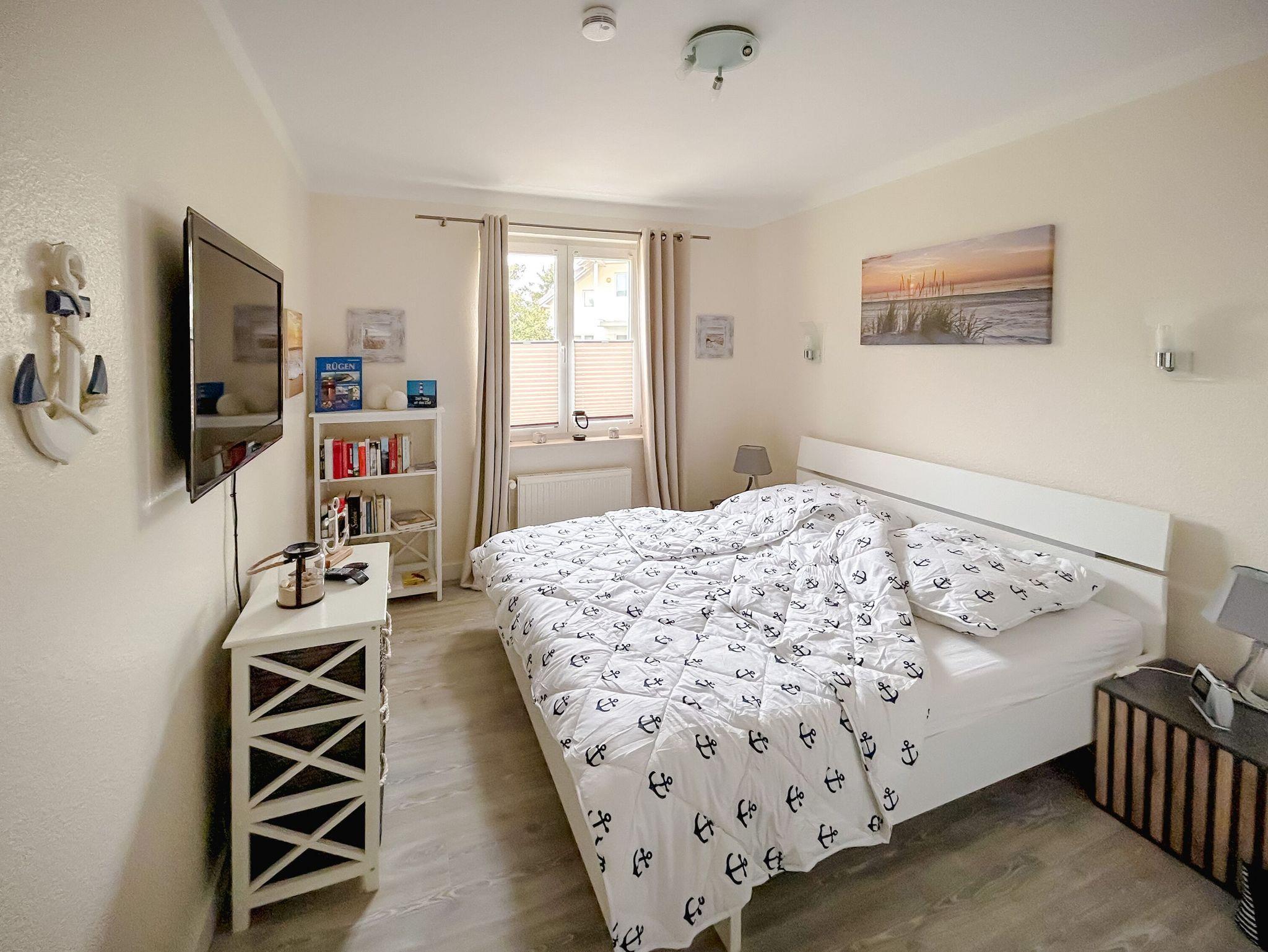 Im Schlafzimmer Ihres Urlaubsdomizils finden Sie ein bequemes Doppelbett (1,80 x 2,00 m), einen zweiten Flachbild-TV und einen geräumigen Kleiderschrank für Ihre Urlaubsgarderobe. Für gemütliche Stunden ist ein Regal mit einer kleinen Buchauswahl zum Schmökern für Sie vorbereitet.