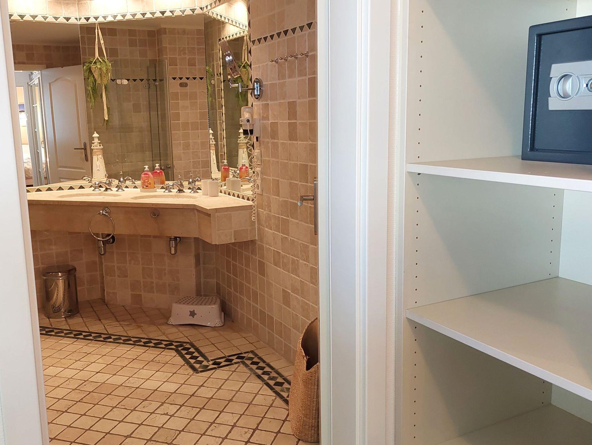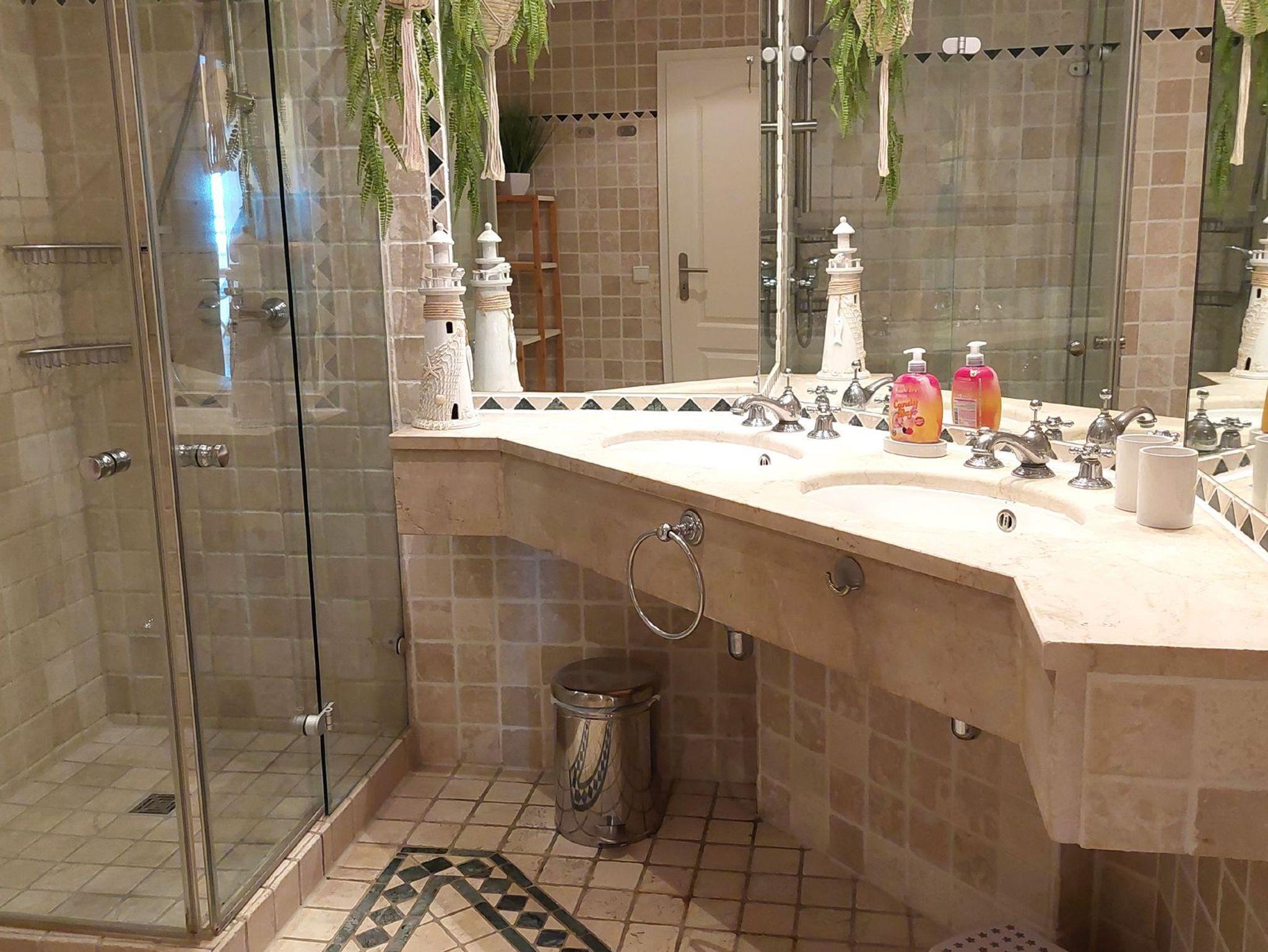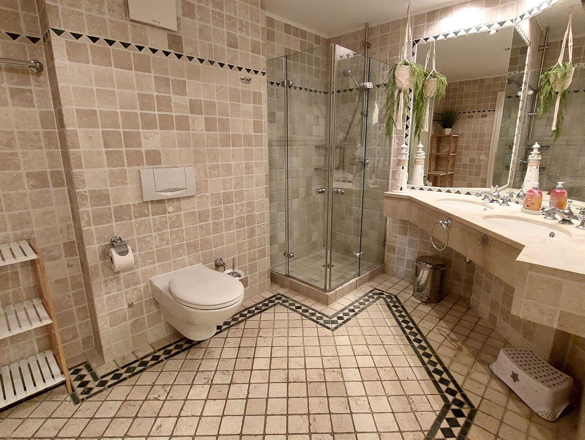Das Badezimmer mit Antikmamor verfügt über einen Doppelwaschtisch, Dusche, Kosmetikspiegel, Haartrockner und WC.
