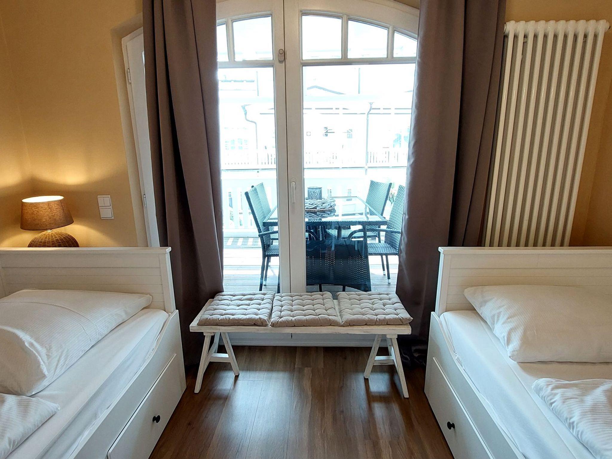 Im zweiten Schlafbereich finden Sie zwei Einzelbetten, einen weiteren Zutritt zum Balkon sowie eine Verdunklungsmöglichkeit vor.