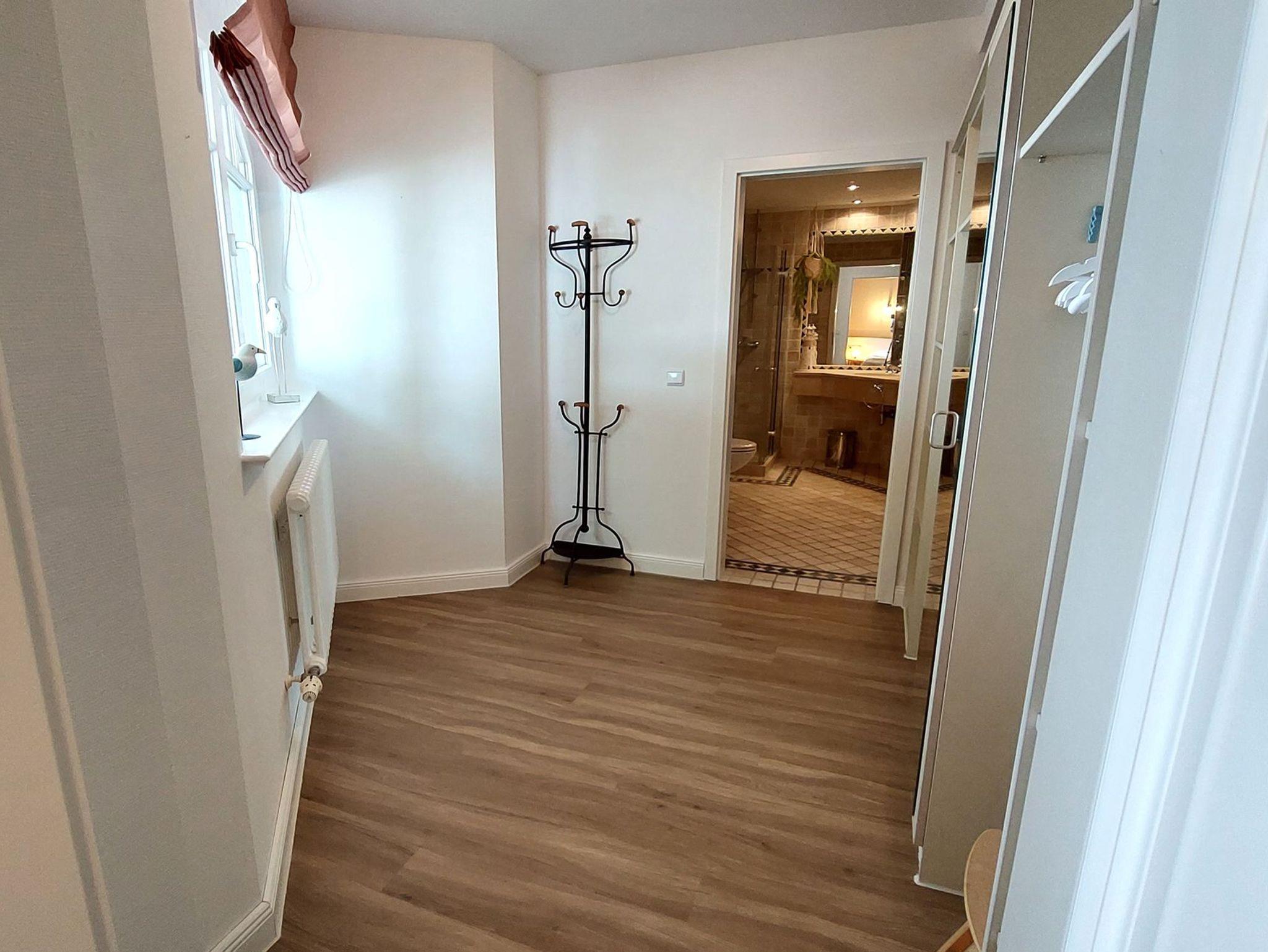 Über den geräumigen Flur samt Garderobe und Sitzgelegenheit gelangen Sie in das Badezimmer, in den Wohnbereich und in beide Schlafzimmer.