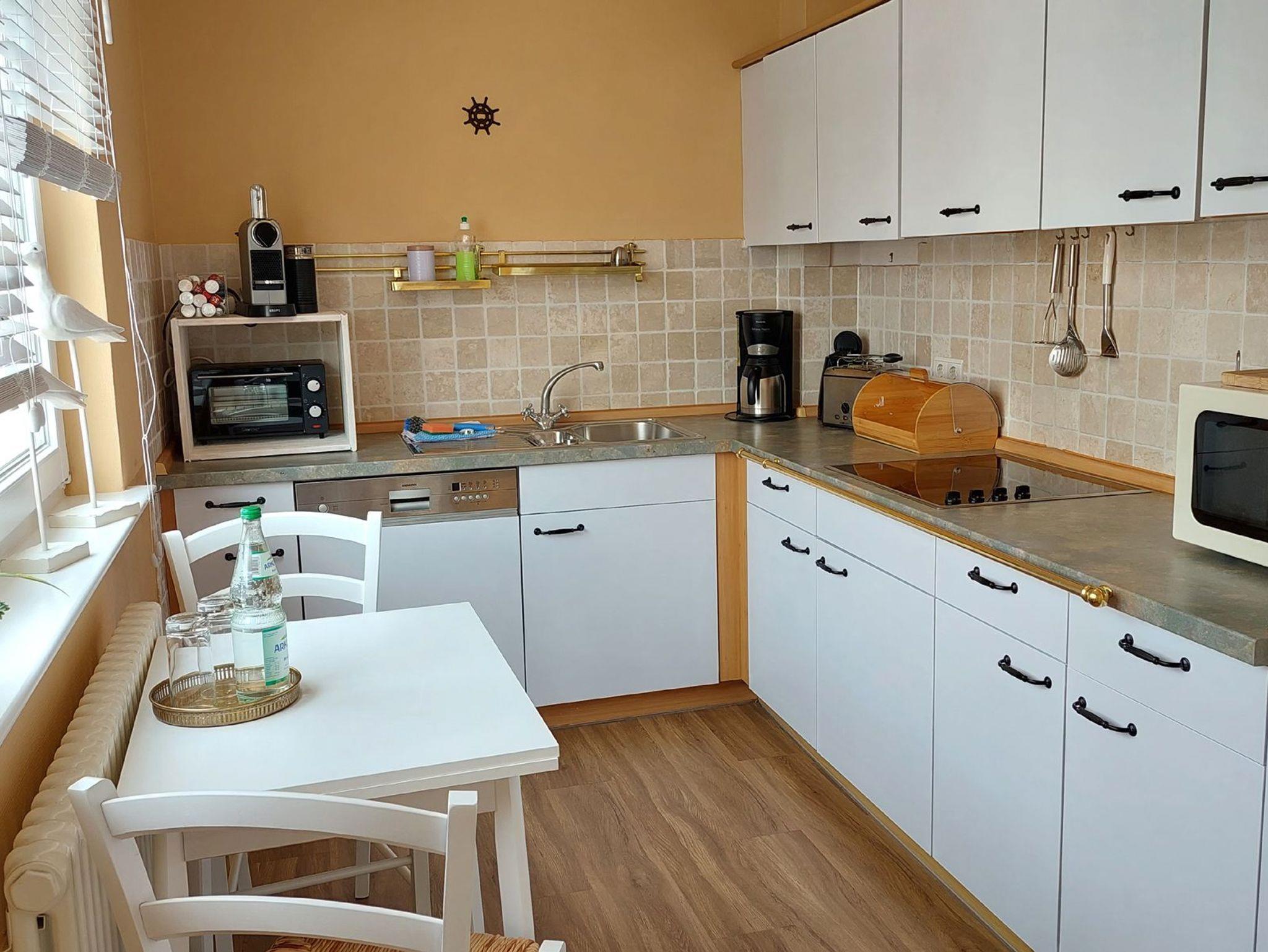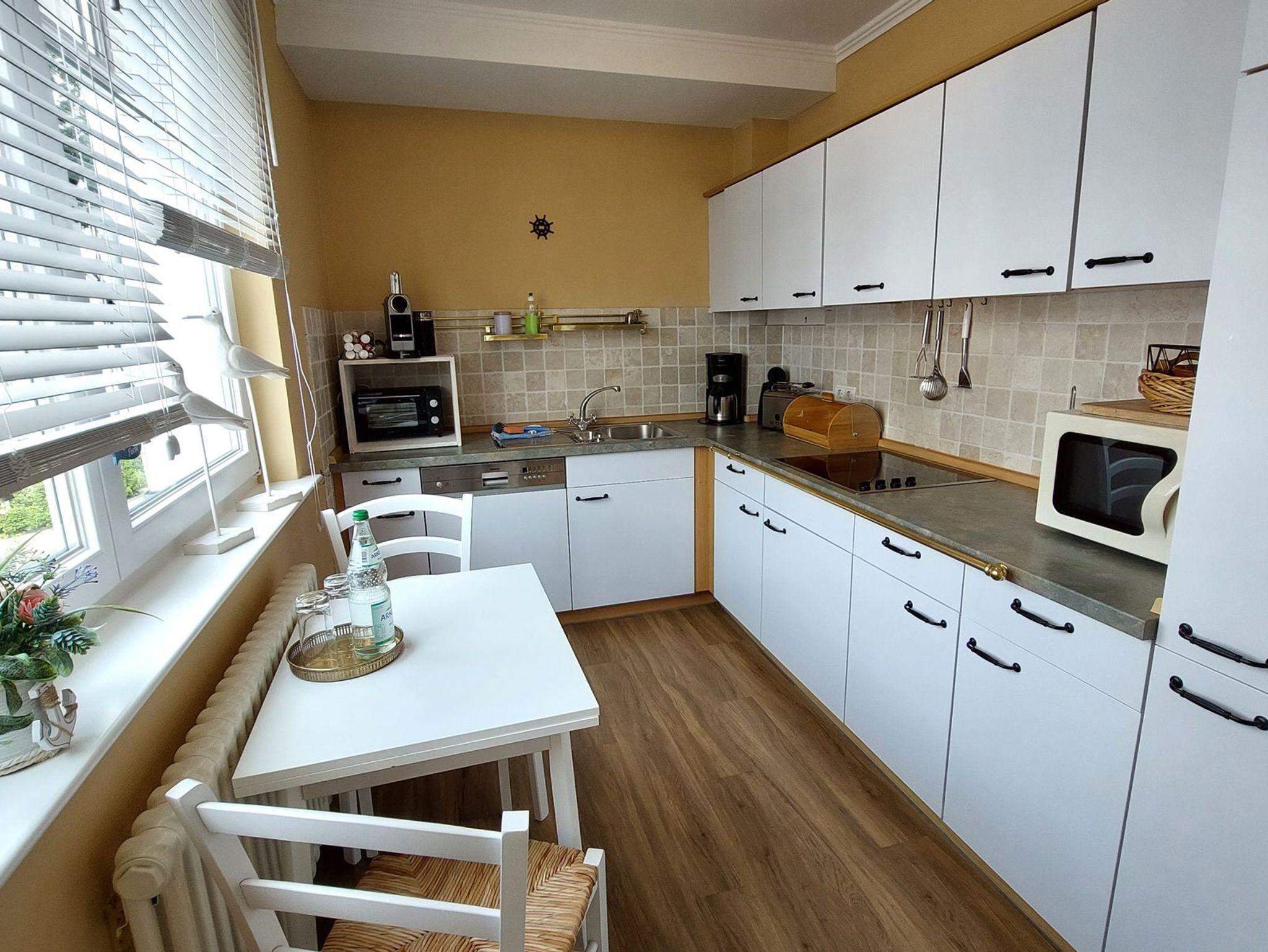 Die separate Küche ist komplett ausgestattet mit einem Geschirrspüler, einer Kaffeemaschine, einer Kaffeekapselmaschine, einem Wasserkocher, Toaster, Mini-Backofen, Mikrowelle, Cerankochfeld, Kühlschrank mit kleinem Gefrierfach sowie umfangreichem Kücheninventar.