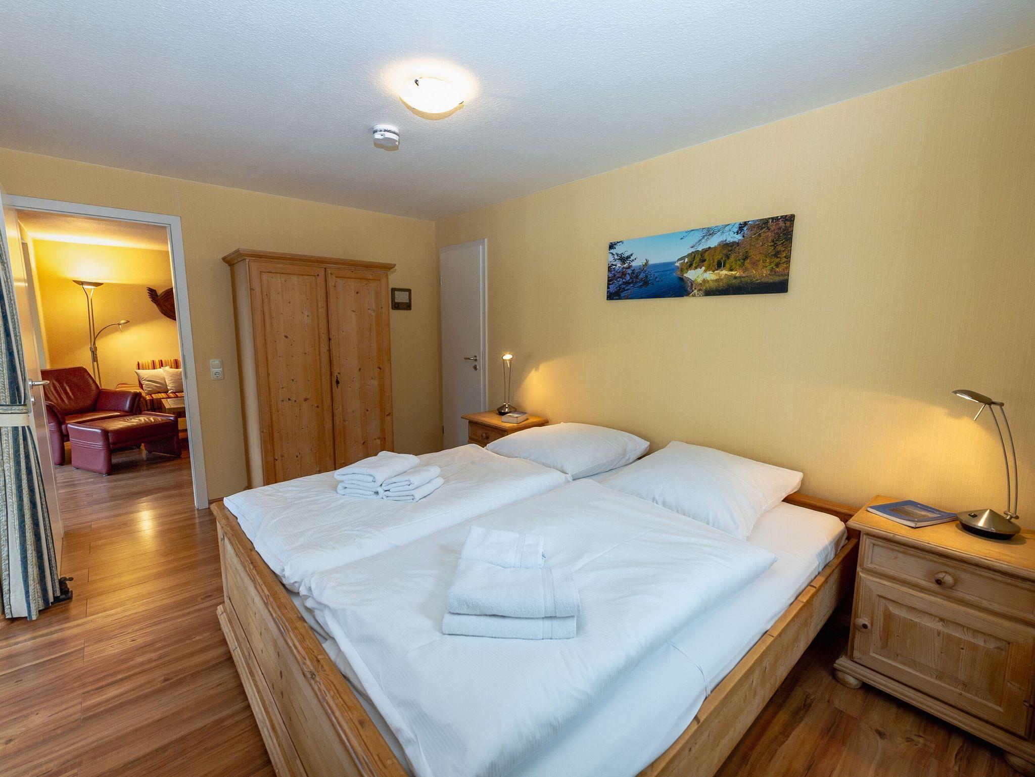 Das Schlafzimmer ist mit einem Doppelbett und einem Kleiderschrank ausgestattet. Zusätzlich steht Ihnen ein begehbarer Kleiderschrank im Nebenzimmer zur Verfügung. Das Wohn- und Schlafzimmer kann nahezu komplett verdunkelt werden.